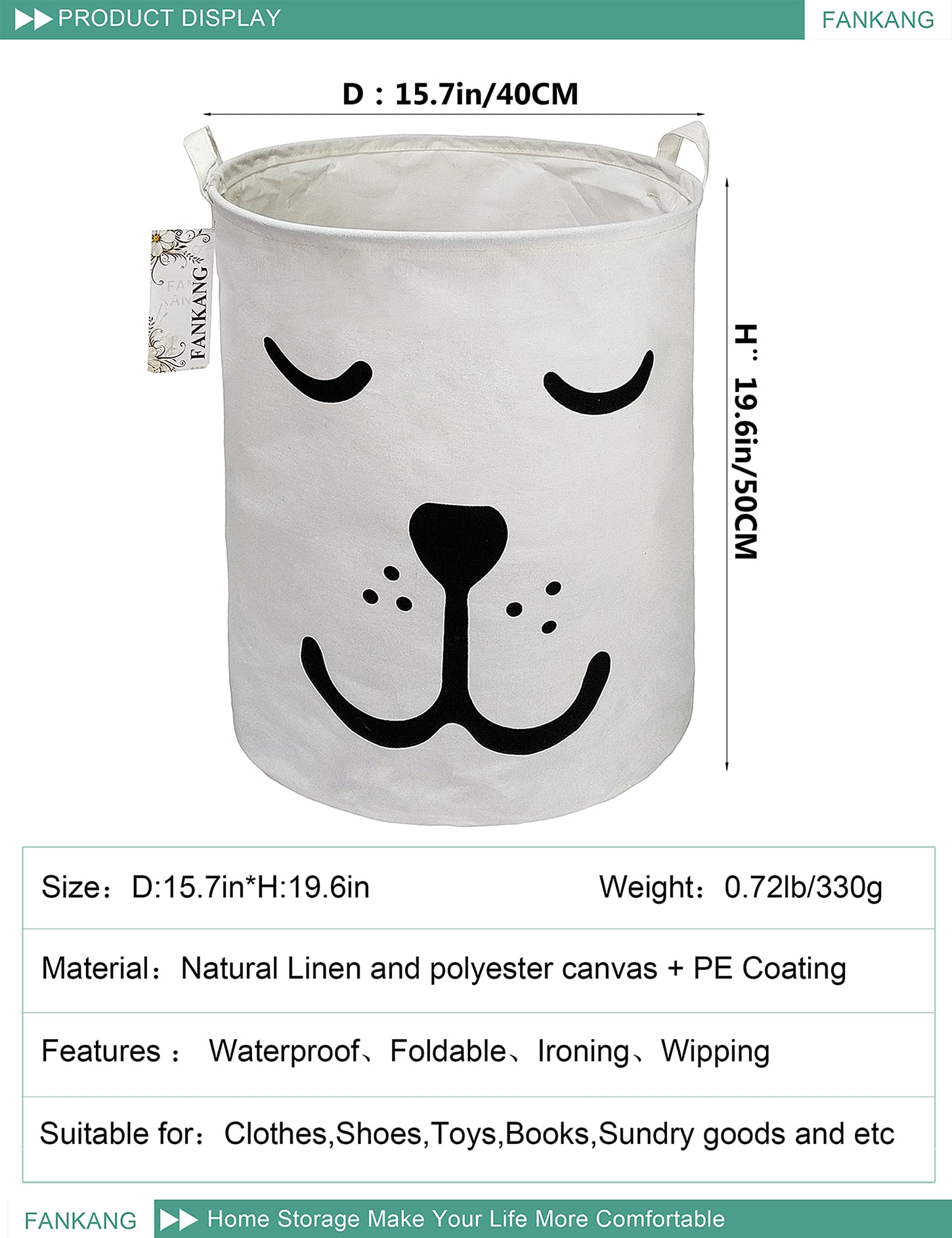 This storage bag suitable for adult, teens, children; suitable for toys, books, clothes and other stuff, suitable for home and school. Why choose our large storage basket? -We selected high-quality polyester canvas + flax + PE environmental protection waterproof coating -Practical side handles for easy toting. - Collapsible design for compact, convenient storage. - Cute lovely animal pattern design. - Multiple function, suitable for any place. Features: - Perfect organizer for play rooms, allowing for the storage of toys bin, books, blocks, stuffed animals, toys with multiple pieces, train sets, or board games. -reading materials, as well as in the bathroom for towels, or as a laundry hamper.