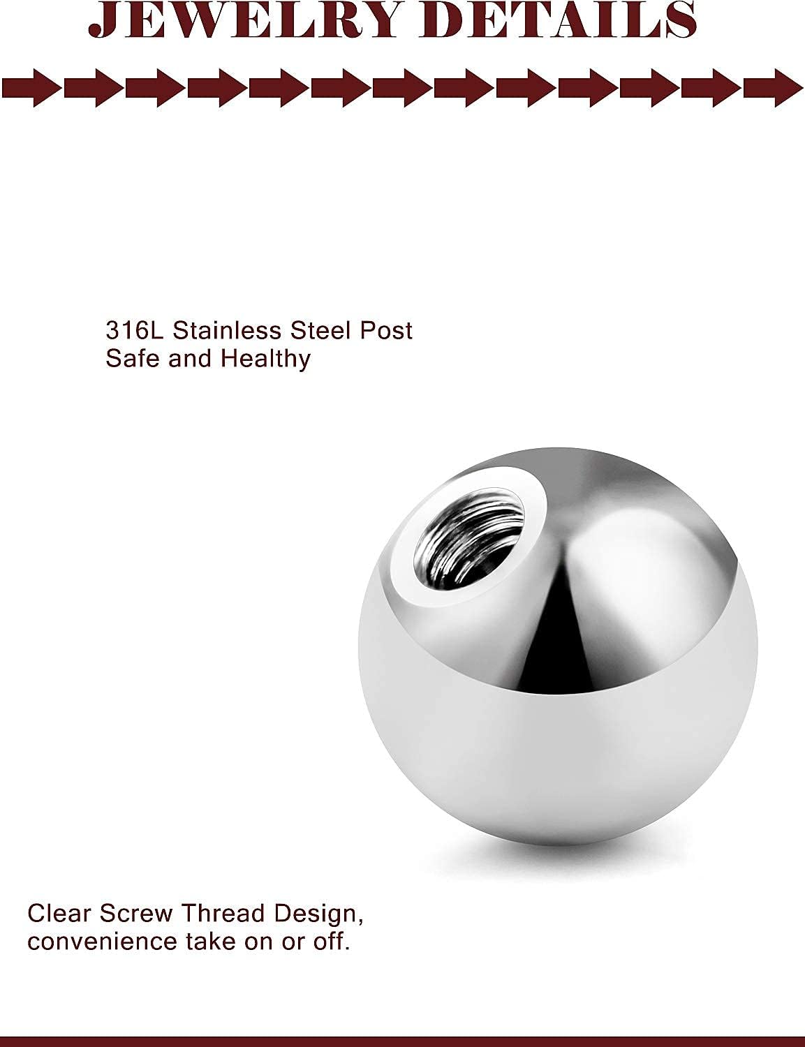 Size: Externally Threaded Replacement Ends for Body Piercing Barbells, the screw hole Size suit for 18G(1.0mm) 16G(1.2mm), Ball Size: 3mm 4mm 5mm 6mm 8mm