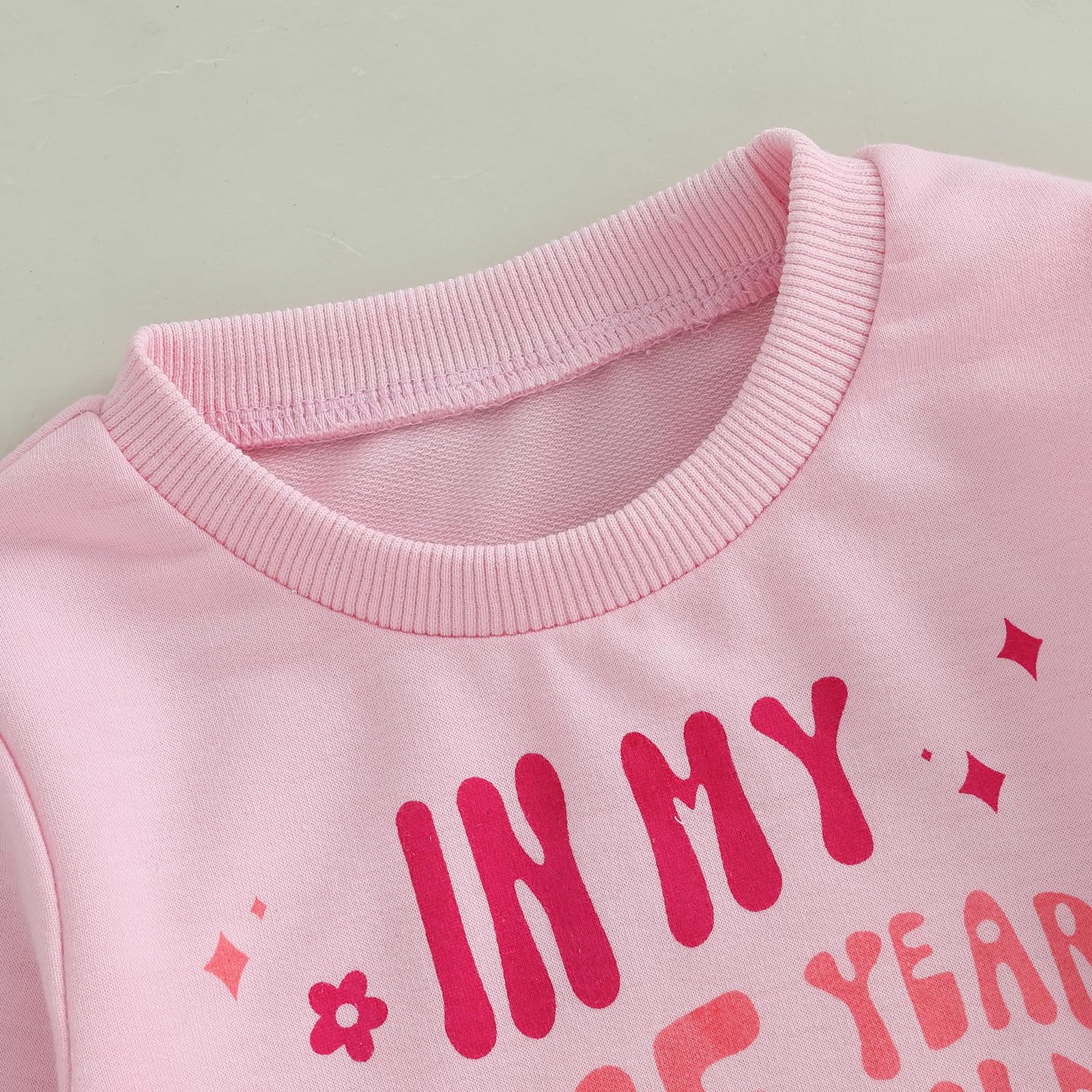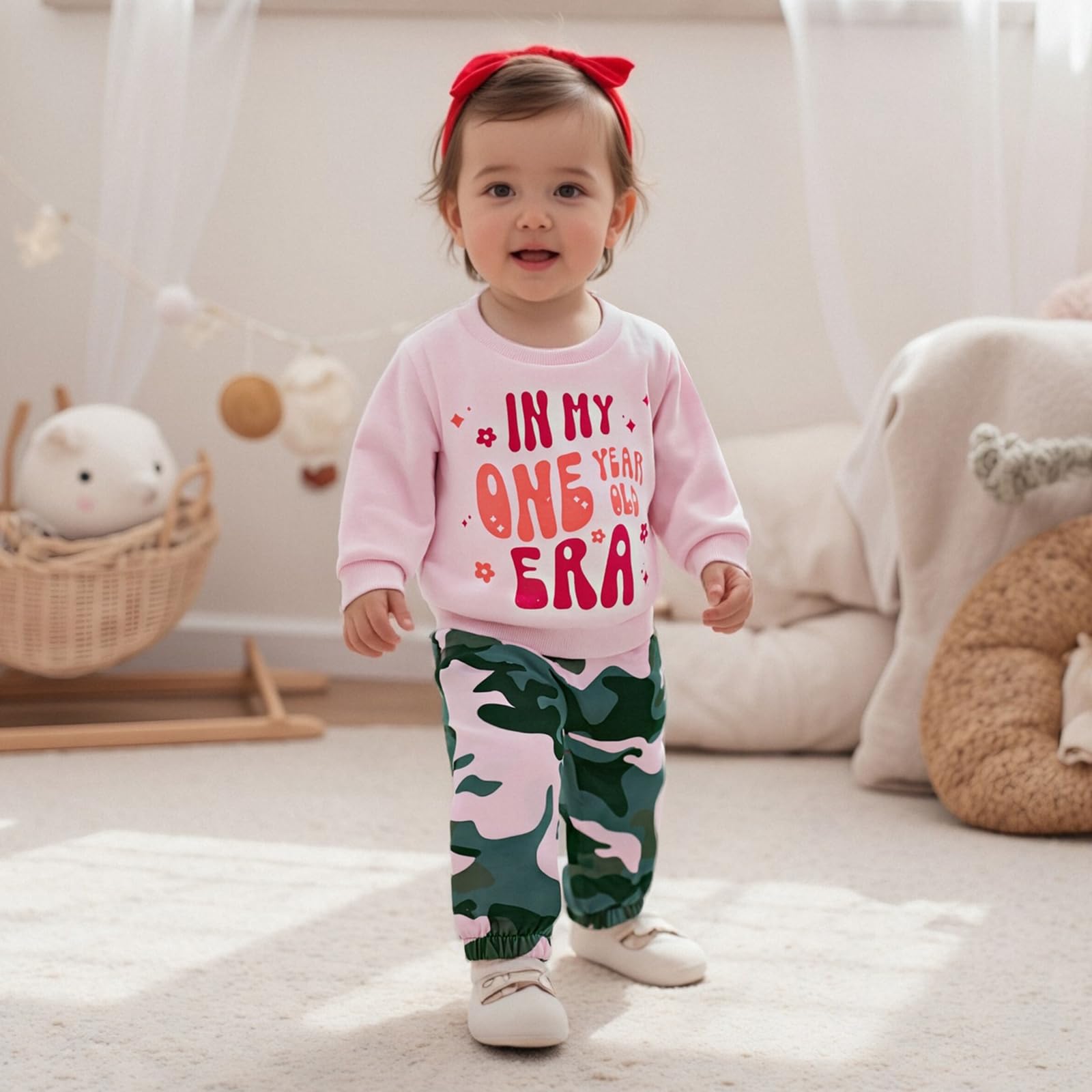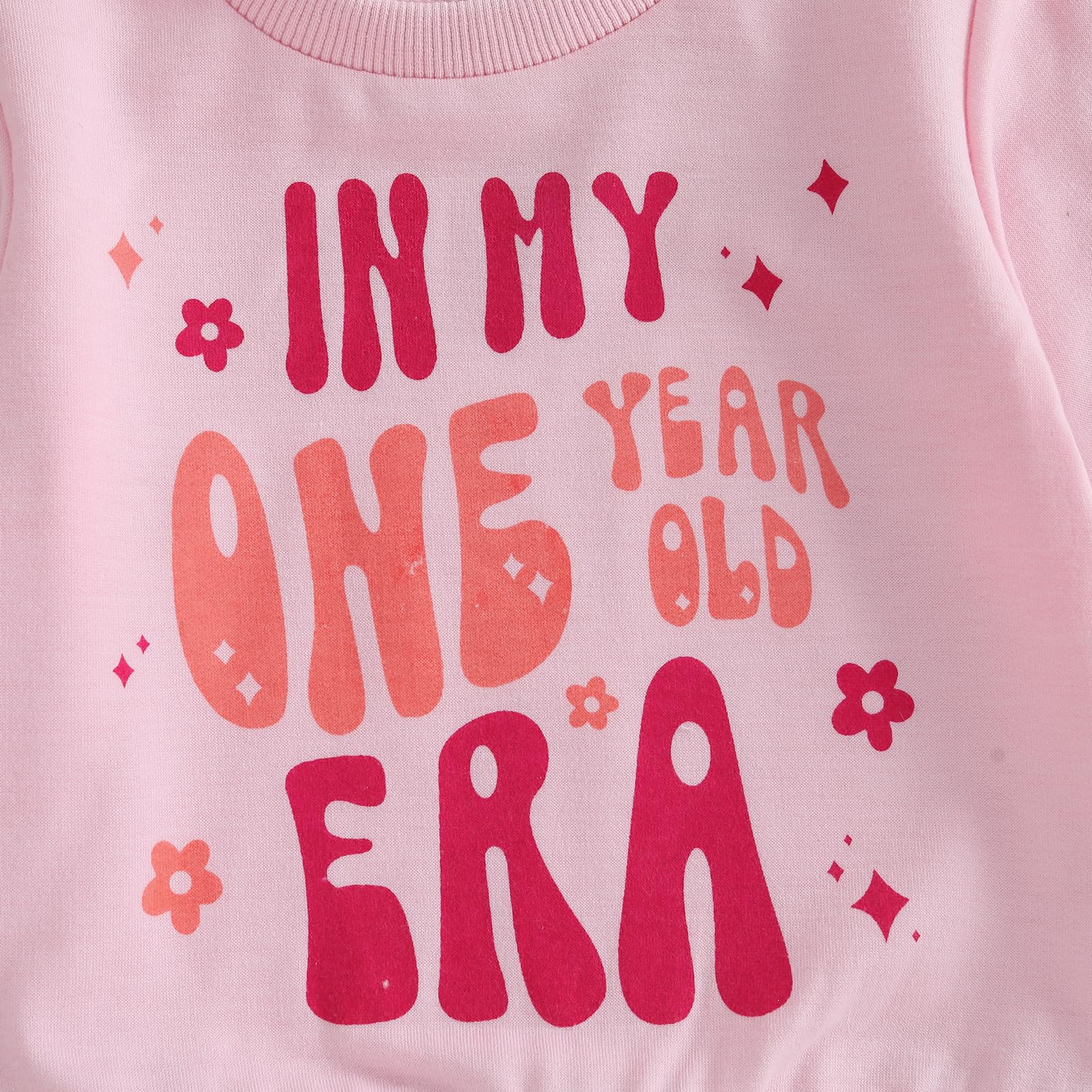 Design: Baby girl first birthday outfit, long sleeve, crewneck, in my one year old era print, 1st birthday sweatshirt, matching with elastic waist solid pants, very cute and trendy sweatsuit for spring,fall and winter, 1st birthday gifts girl, girls first birthday outfit