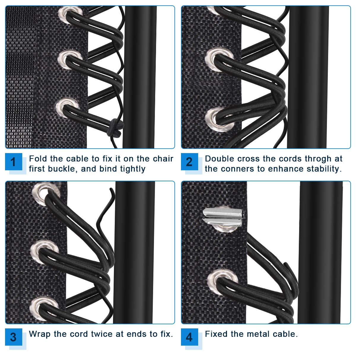 【Package Included】: Universal repair cord kit for zero gravity chair comes with 4 pcs replacement elastic cords(2 long cords and 2 short cords), color in black. An easy tool to repair your chair by yourself, funnier and can save money!