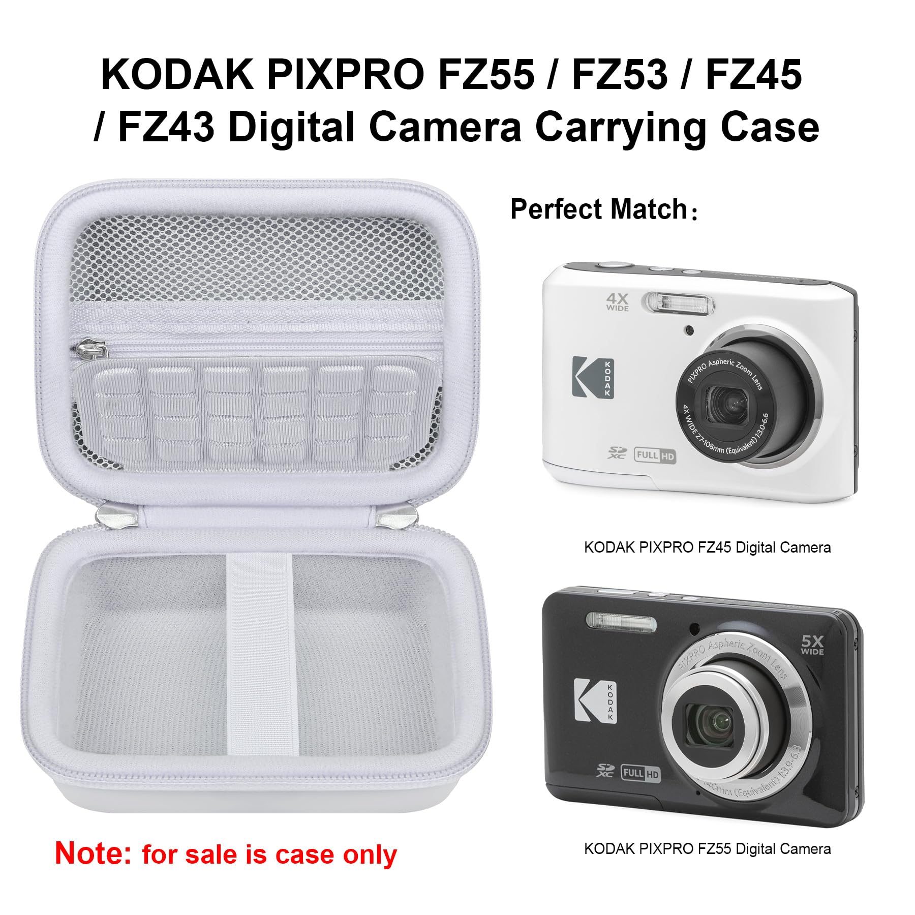 【Perfect Fit】【Specially Designed for KODAK PIXPRO FZ55 / FZ53 / FZ45 / FZ43 16MP Digital Camera】--This digital camera carrying case is specially designed for KODAK PIXPRO FZ55 / FZ53 / FZ45 / FZ43 16MP digital camera. Internal space 1:1 build, perfectly fit KODAK PIXPRO Z55 / FZ53 / and KODAK PIXPRO Friendly Zoom FZ45 / FZ43 16MP digital camera, extra mesh pocket for batteries, cable, memory card, card reader, (CASE ONLY! camera and accessories are not included)