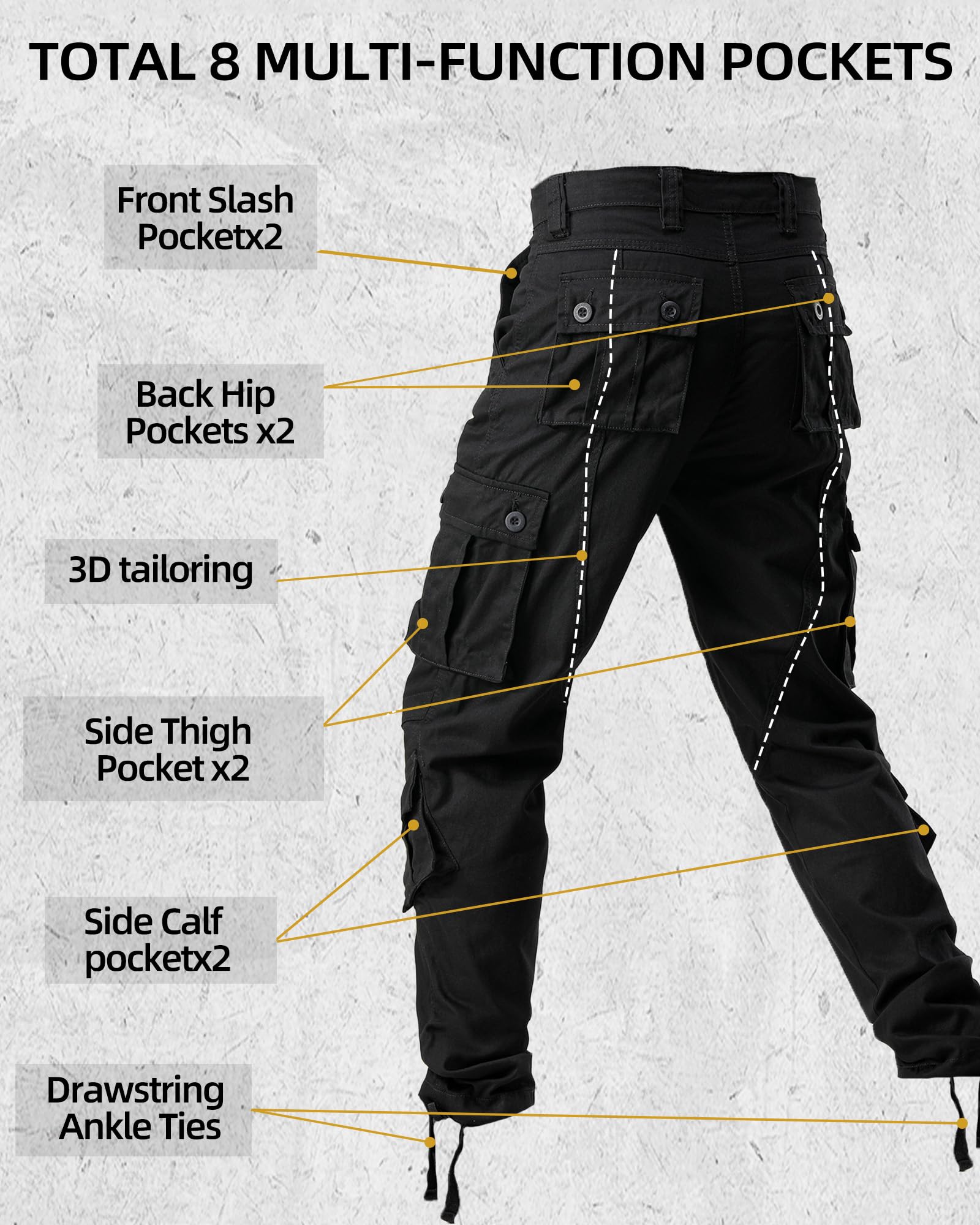 Perfect Design:Casual Cargo pants features with high-density metal alloy snap buttons and zippers, sturdy tab buttons for quick fastening. These work pants also come with 8 functional flap pockets with buttons,Hand Pocket x2,Large Flap Cargo Pocket x2,Utility Leg Cargo Pocket x2,Rear Flap Pocket x2,are perfectly suitable for storing your personal belongings or gadgets, keeping your items from sliding around and more secure and practical.Also,one left front zipper fake pocket is a good decoration
