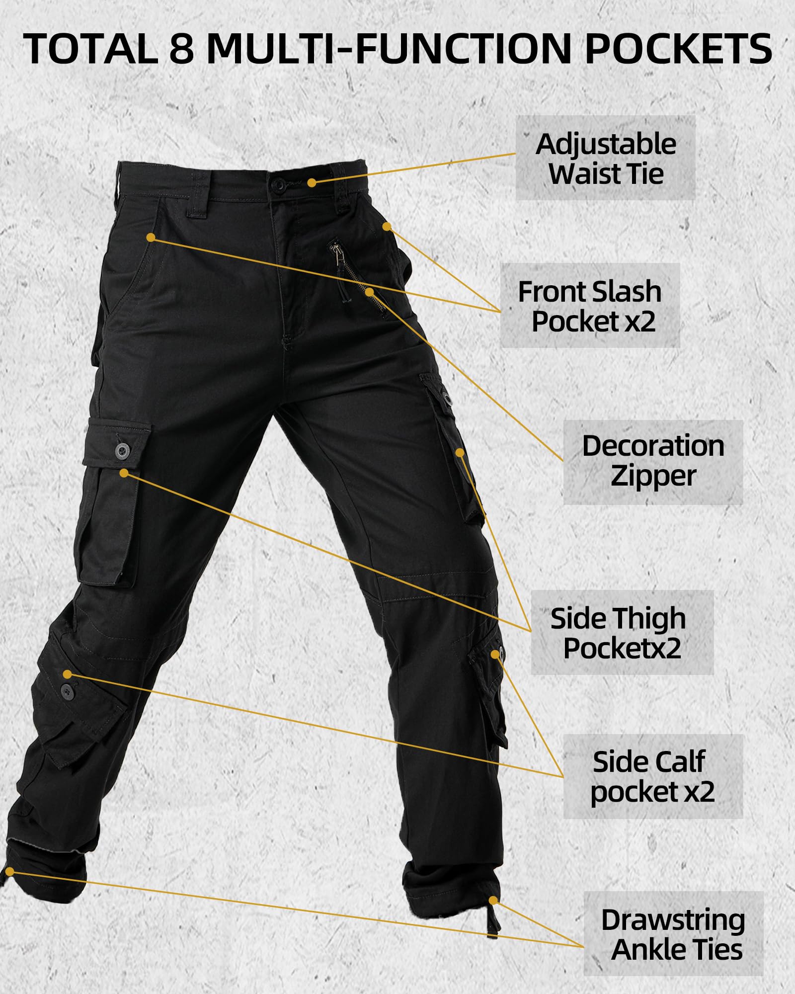 Product Material: Solid and camo cargo pants for men use 100% cotton fabric, treated for ease of care with a wrinkle-resistant finish and durability,it features non-slip, durable, comfortable, abrasion-resistant soft,breathable and sweat-absorbent,can repel the stains, liquids and soil keep you all day dry and clean.Relaxed fit military pants with zipper closure and straight leg,drawstring tie inside the ankle and the waist for comfort fit.