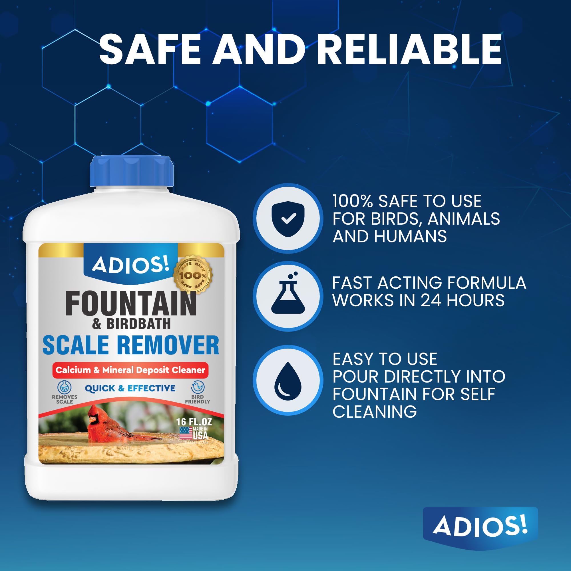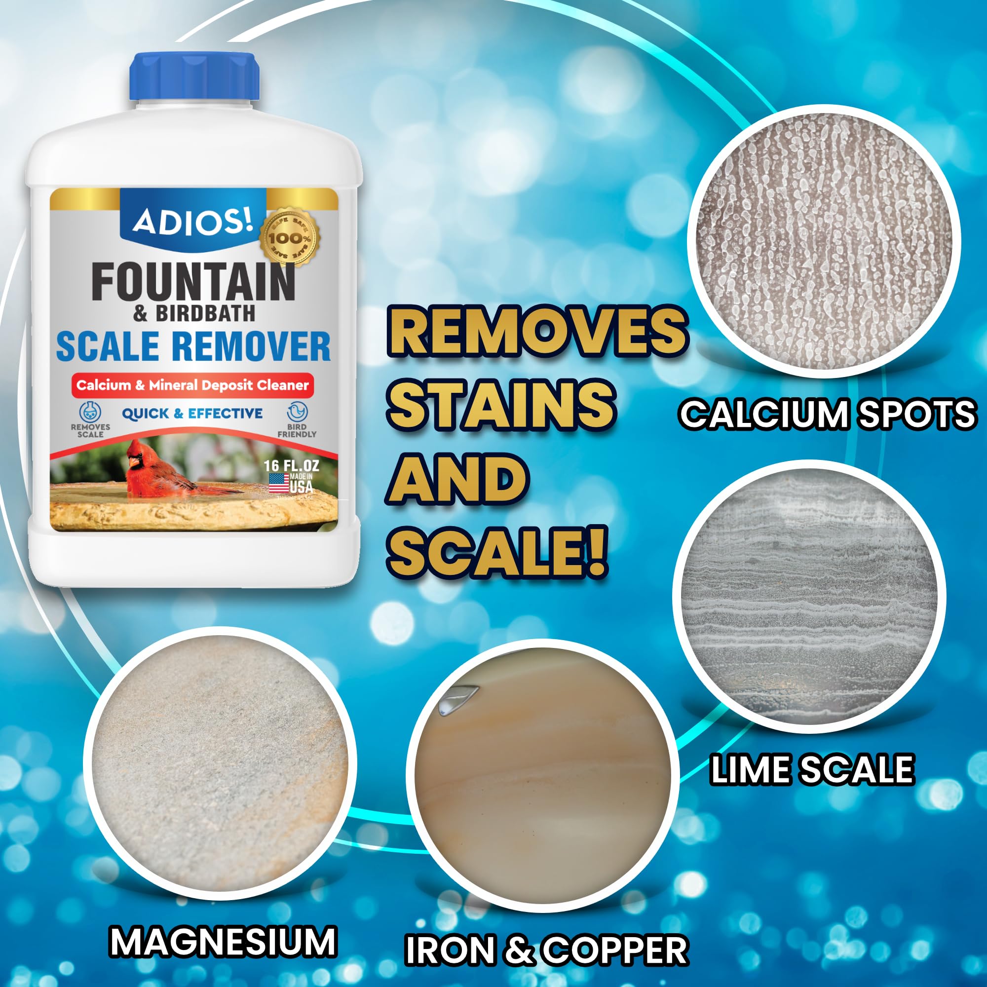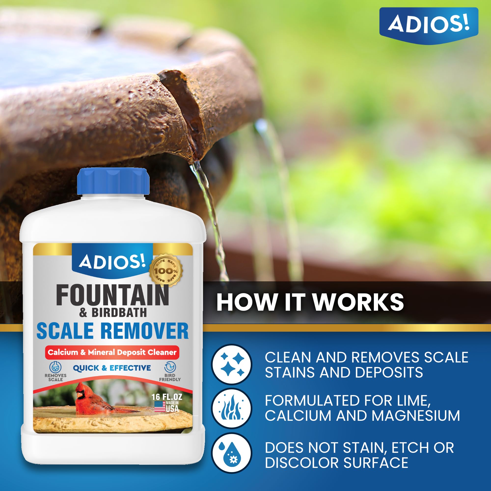 Adios! Fountain and Birdbath Scale Remover is an easy and effective way to remove and clean hard water and lime build up on water fountains, waterfalls and statuaries. Our scale remover is the perfect solution to remove white scale stains, sandy lime deposits and calcified calcium and magnesium deposits caused by mineralized water. Safe to use, Adios! Fountain and Birdbath Scale Remover will not discolor, stain or etch stone, glass, metal or plastic surfaces. Our formula is also safe to use around birds and animals. Adios! is an American company based in the midwest. We proudly manufacture all of our products in the USA and our facilities are certified by the NSF and also EPA registered. Safety and quality are our top concerns and we we back all of our products with a 100% satisfaction guarantee. If you don’t love it, return it!