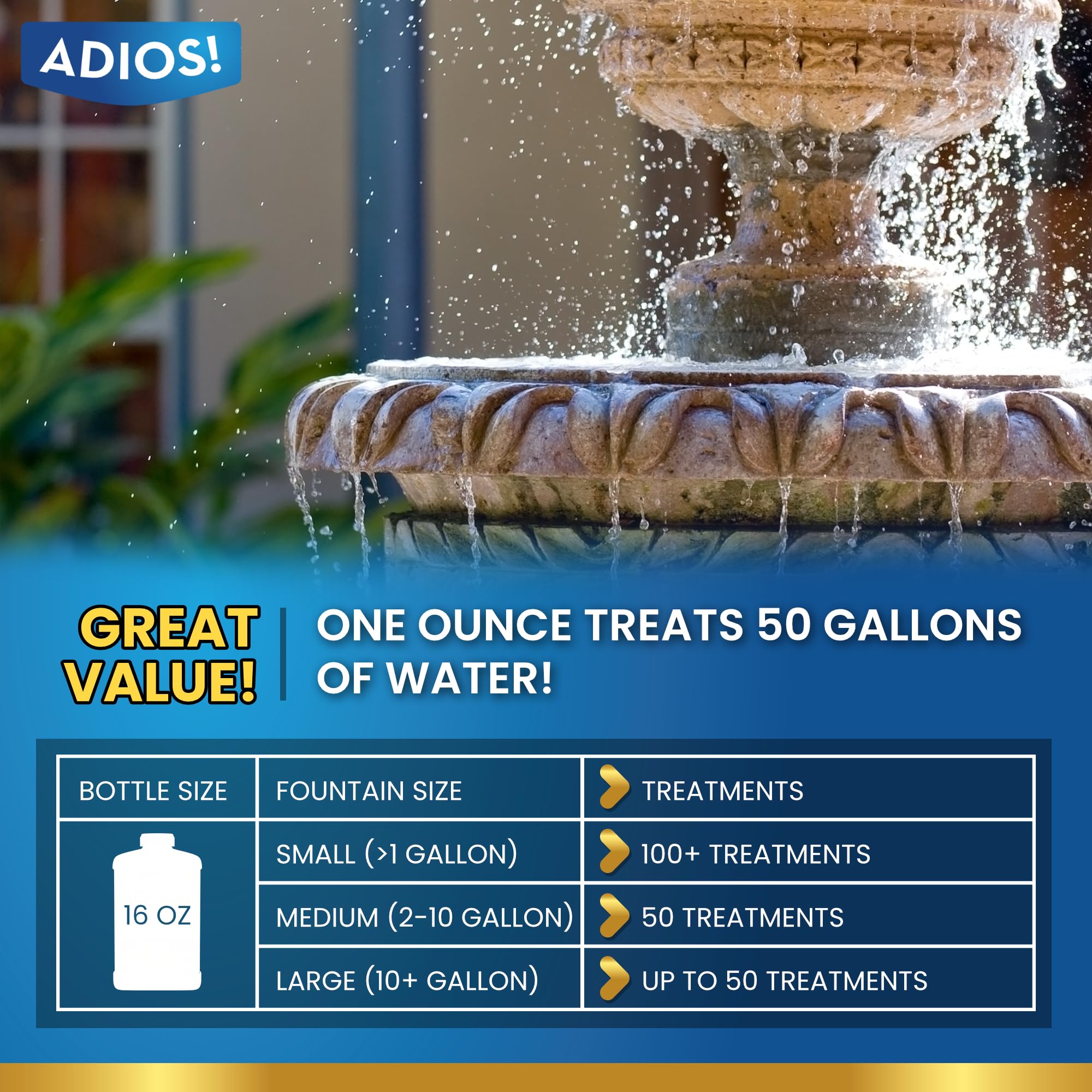 GREAT VALUE - Just 4oz of solution will treat up to 250 gallons of water, which is plenty for most indoor or outdoor water fountains and water features.