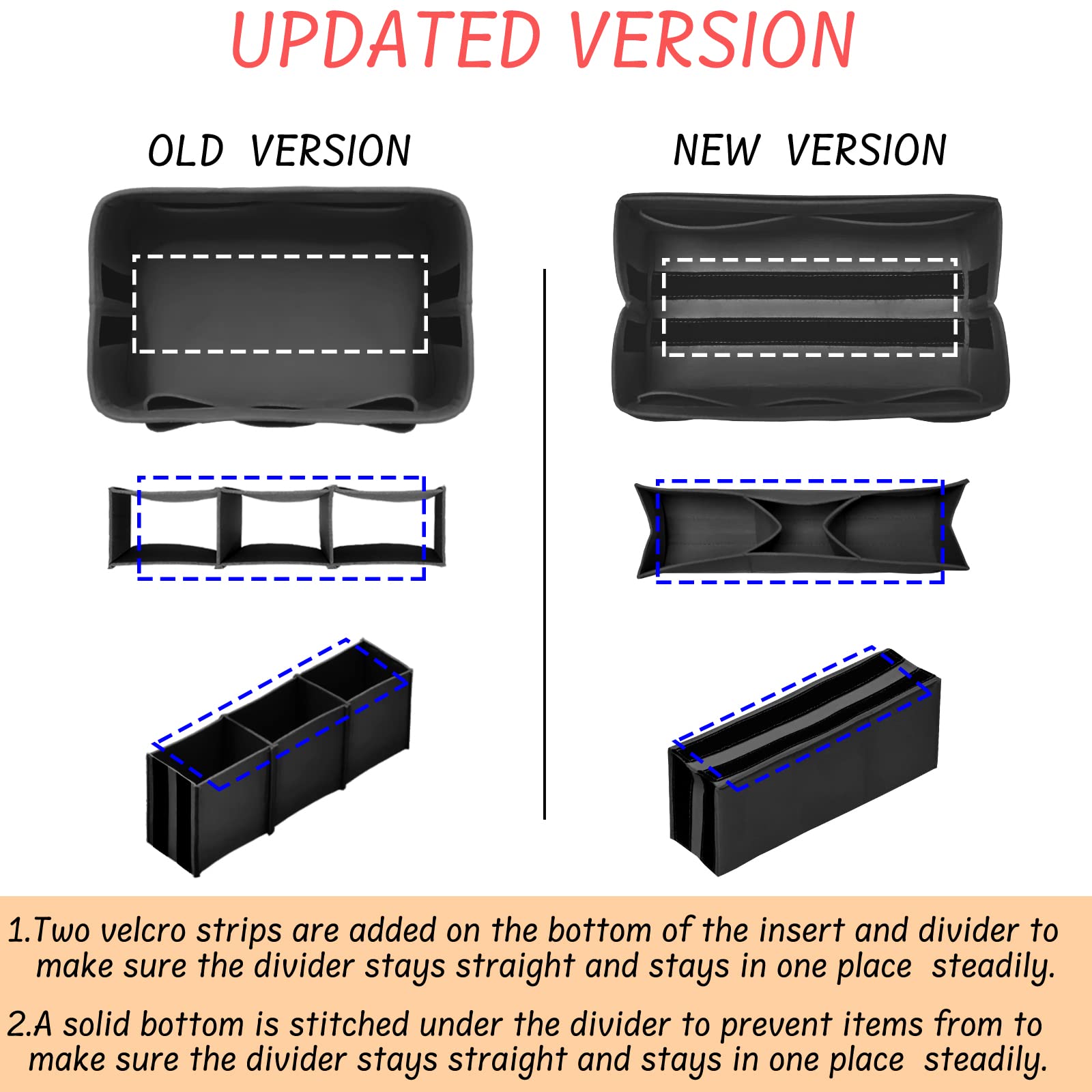 【UPDATED TOTE BAG INSERT】As you can see in the product pictures, two long magic straps are added on the bottom of the removeable divider to make sure it will stay straight and stay in place steadily. A solid bottom is stitched under the divider to prevent items from rolling or losing into other section underneath. You can also remove the divider to offer more space if needed, or it can be used as an insert in a small purse if its size is right for your small purse.