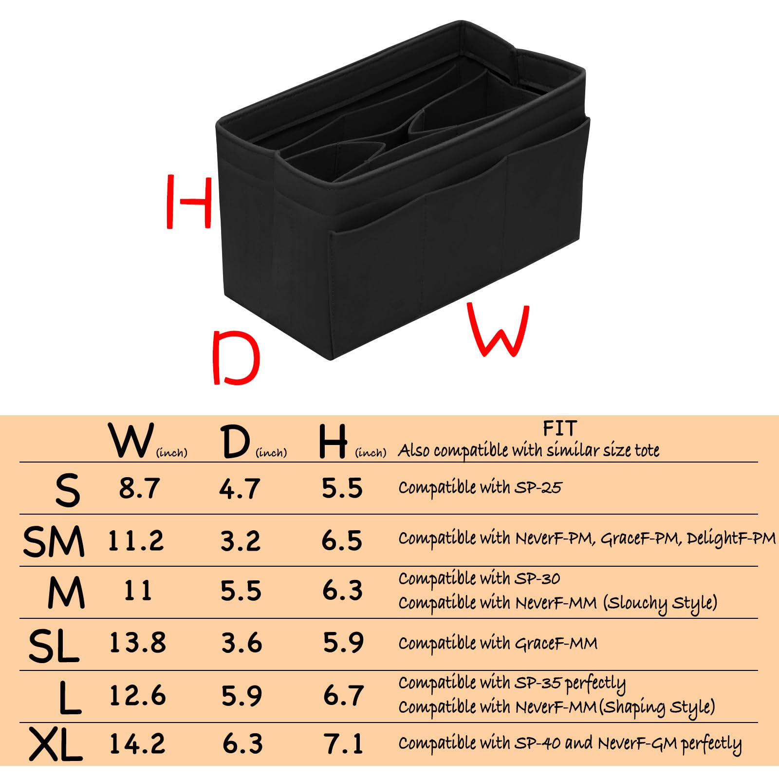 【PURSE INSERT FOR HANDBAGS】 S=8.7"W x 4.7"D x 5.5"H, compatible with SP-25, MINI & SMALL MJ TOTE. SM= 11.2"W x 3.2"D x 6.5"H, compatible with NeverF-PM, GraceF-PM, DelightF-PM. M=11"W x 5.5"D x 6.3"H, compatible with SP-30, MEDIUM MJ TOTE, with NeverF-MM(Slouchy Style). SL=13.8"W x 3.6"D x 5.9"H, compatible with GraceF-MM. L=12.6"W x 5.9"D x 6.7"H, compatible with SP-35, with NeverF-MM(Shaping Style). XL=14.2"W x 6.3"D x 7.1"H, compatible with SP-40, LARGE MJ TOTE BAG, and NeverF-GM.