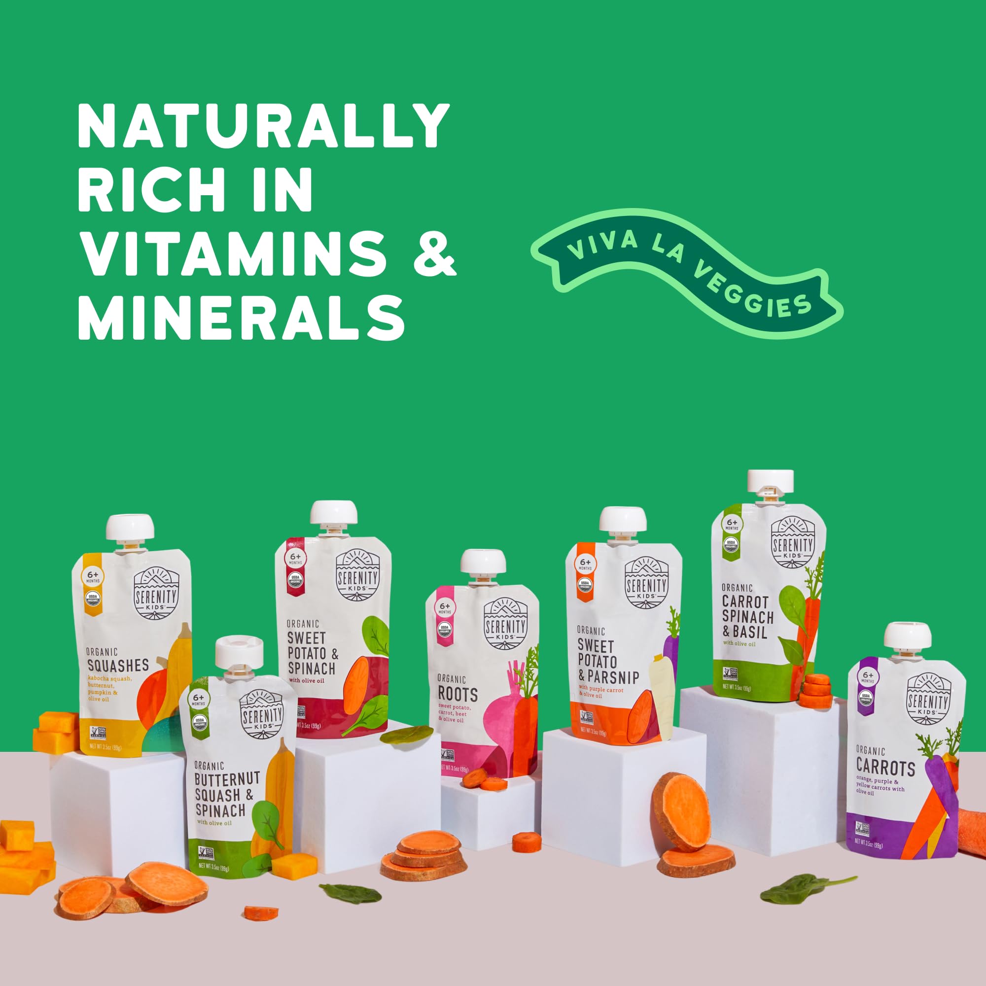 SAVORY VEGGIE GOODNESS: Score 18 pouches of Serenity Kids veggie baby food puree in a tasty mix. Perfect for parents seeking baby pouches and baby snacks for 6+ months