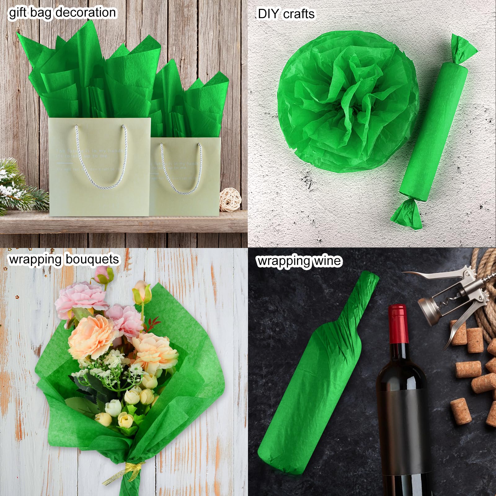 Multiple Uses: Green wrapping paper is a pleasant choice for wrapping gifts, gift bag decoration, gift box filling, wrapping bouquets, wine packaging, DIY crafts, paper flower making, basket liners