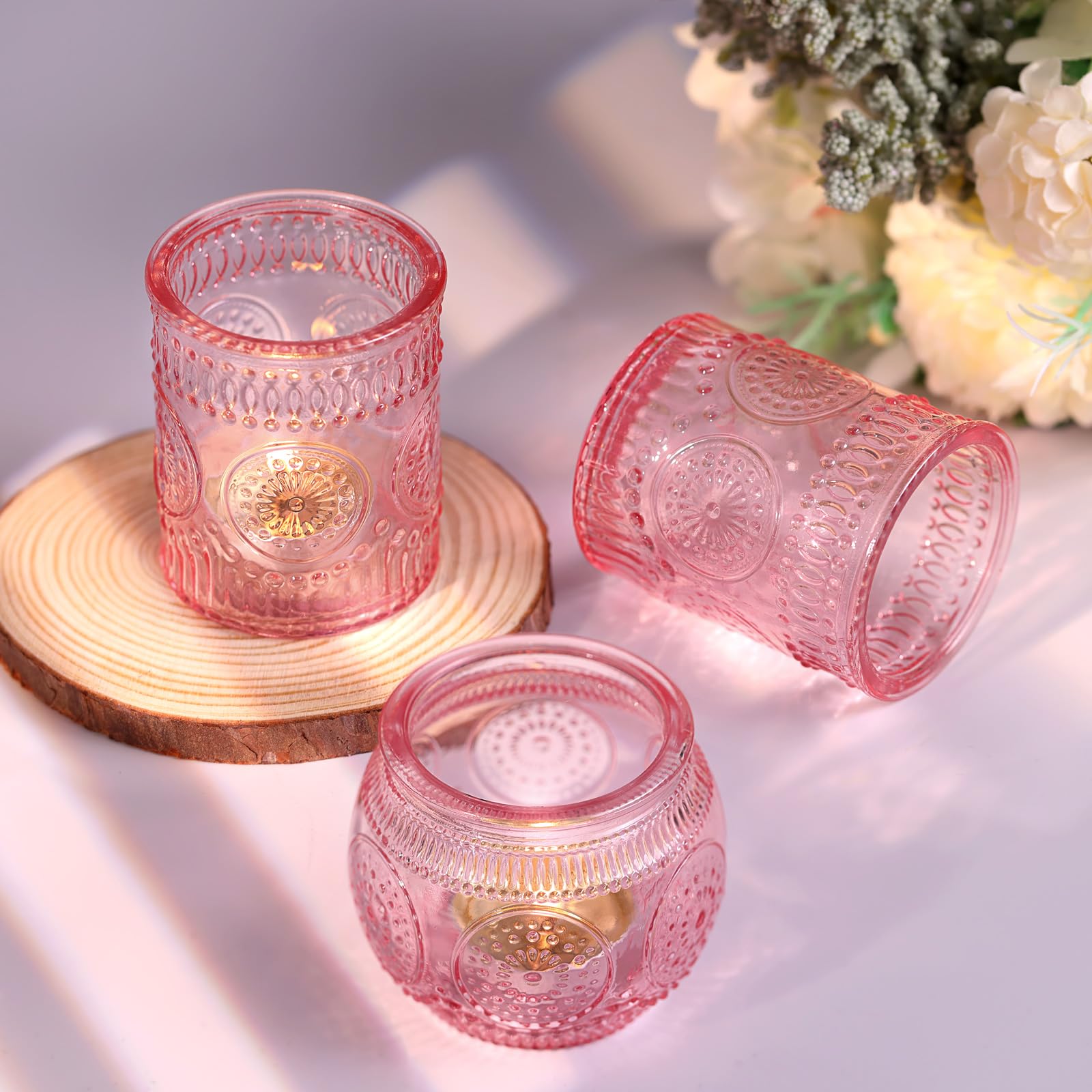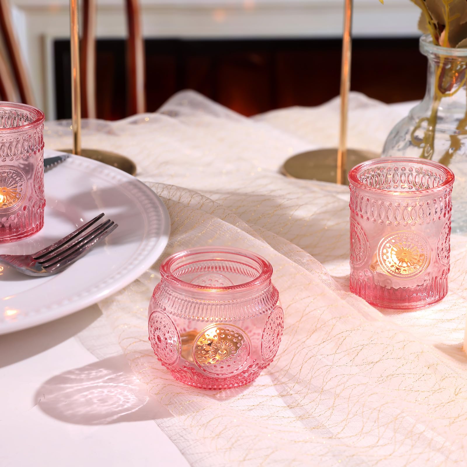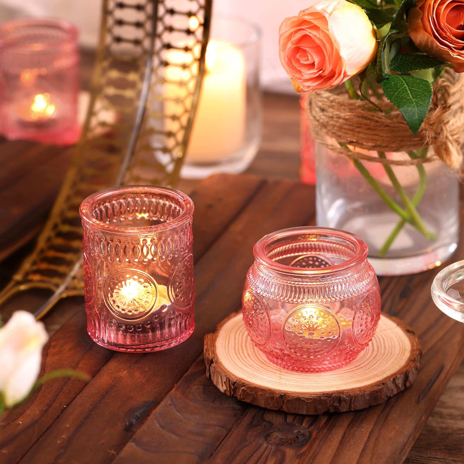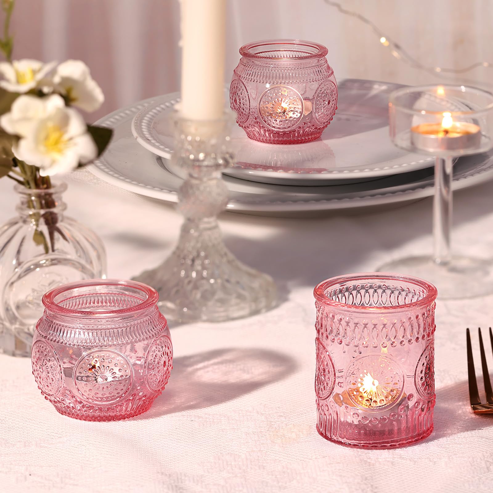 ❤️❤️[ Votive Candle Holders Set ]❤️❤️: You will get 24 pack pink votive candle holders in your package, including 12 glass votives and 12 bowl glass votives.The dimensions are 2.1ʺD x 2.56ʺH and 2.1ʺD x 2.1ʺH approximately. These glass votive candle holders are the perfect complement to any dining table, which can be used with regular votive candles, tea light candles, flameless LED tea waxes, and edible butter candles, creating a warm and inviting ambiance that enhances the dining experience.