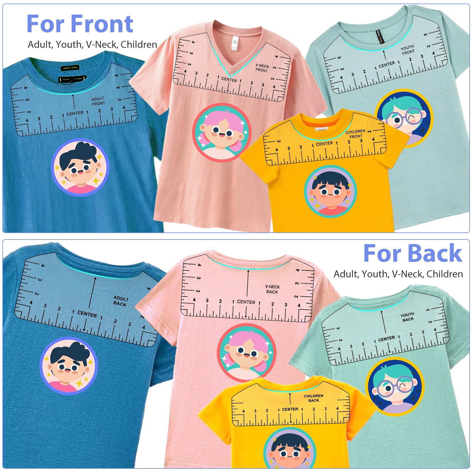 ✂️【Meet Different Needs】The rulers comes with 4 Styles, they are applied to all kinds size: Adult, Youth, Children and V-Neck. The rulers have advanced UV printed graduated numbers and marks that are clearly visible on the ruler guide, they are easy to read against almost any shirt color. Measurement has made easier by inch marks on both side of this shirt measurement tool for vinyl set.