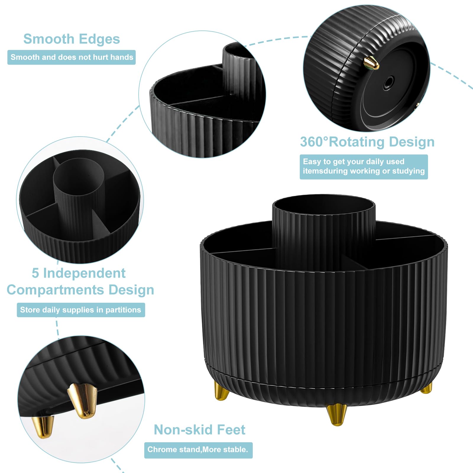 【 Rugged And Durable 】This pen holder organizer is made of eco-friendly and non-toxic ABS material that won't cause any harm. The gold-plated stand with 360° rotating base is very stable and does not tilt for long term use. The extremely smooth surface and rounded edges won't hurt your stuff or yourself.