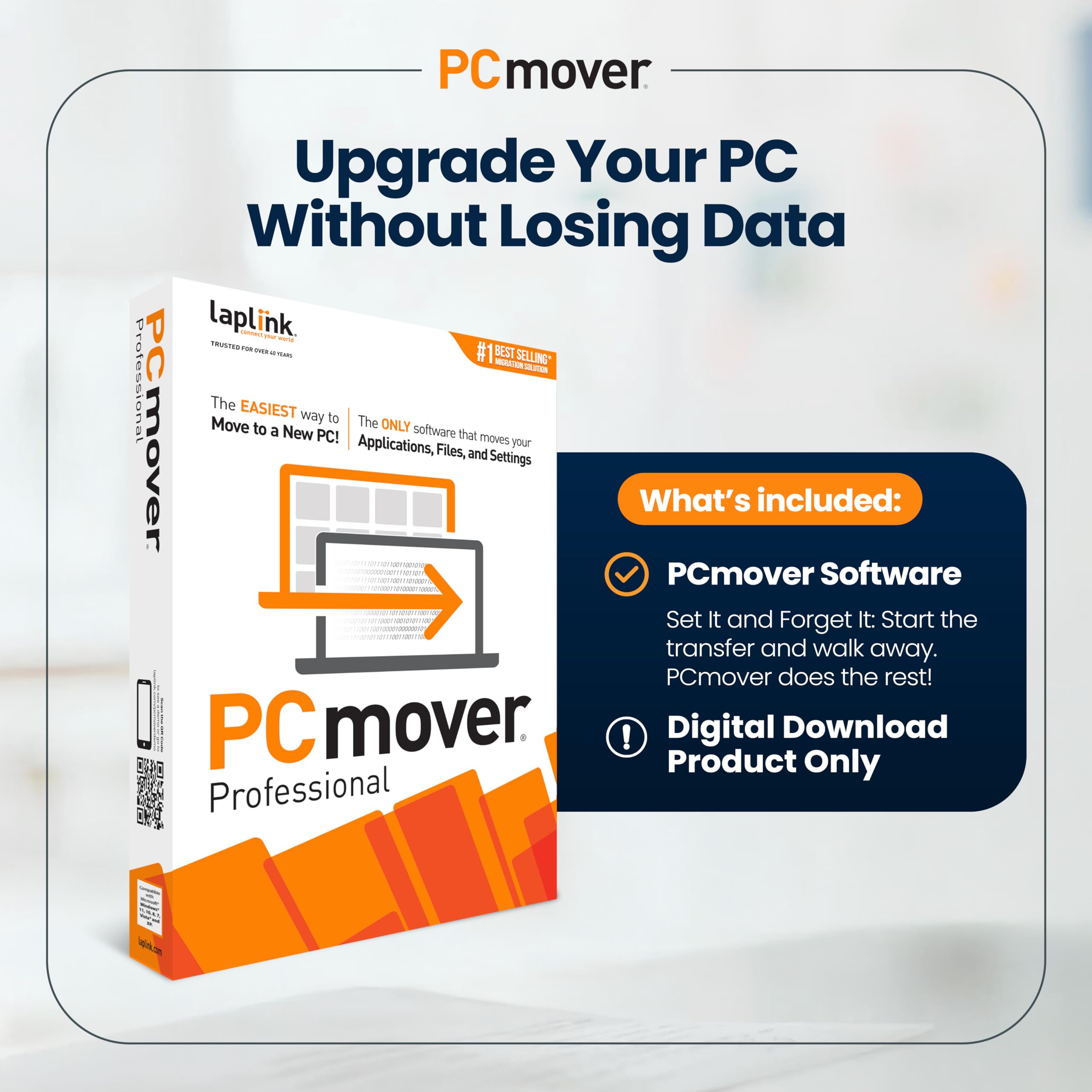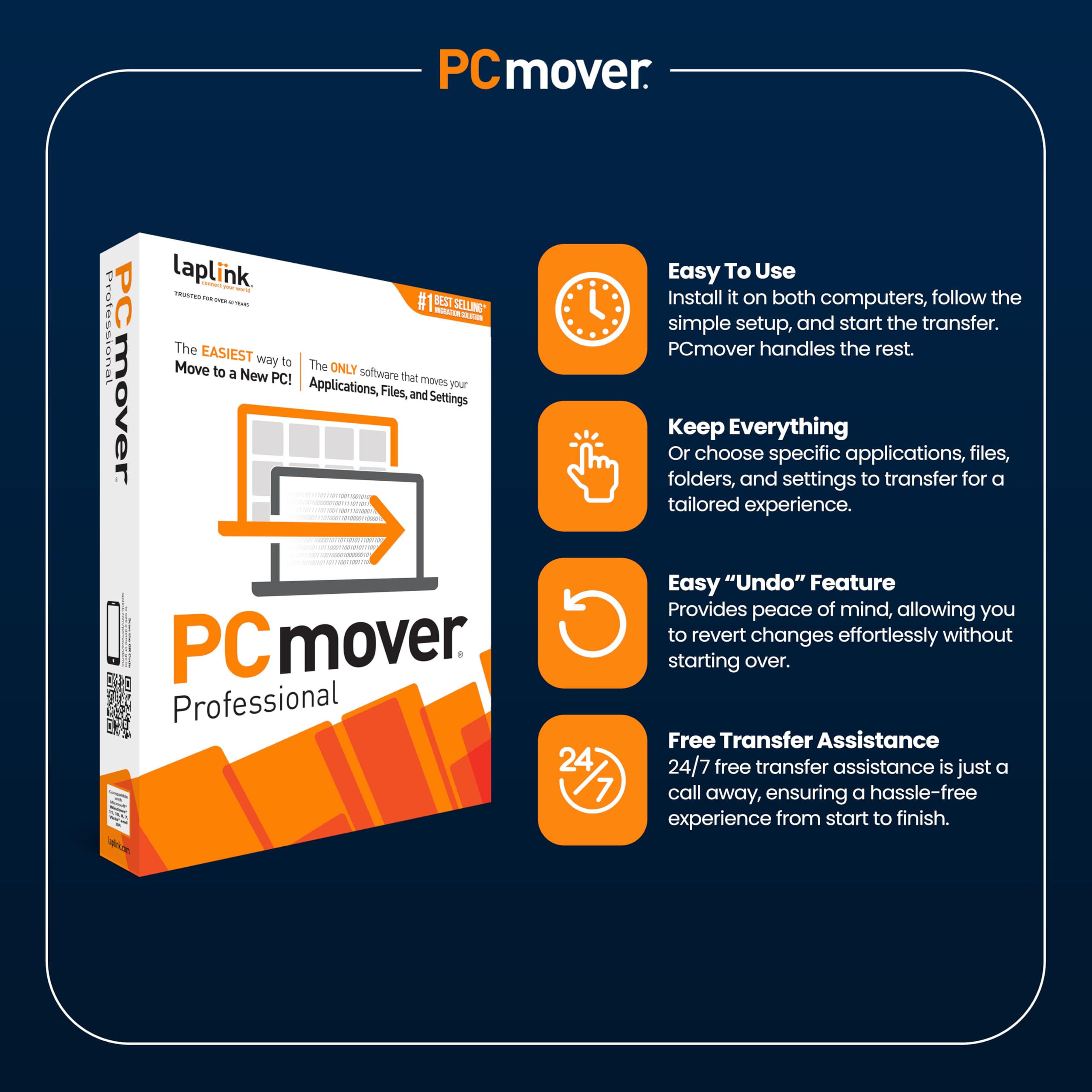 <p>PCmover Professional 11 is the ONLY software that automatically transfers applications, files, settings, and user profiles from an old PC to a new one! It’s the easiest way to move to a new PC without leaving anything behind, even when there are different versions of Windows on the old and new PC. Nothing is changed on the old PC and nothing is overwritten on the new PC.</p><p>To use PCmover, simply install it on both your old and new Windows computers, and follow the easy-to-use wizard. When the transfer is complete, your new PC will have the personality and functionality of your old one. Because most transferred applications are installed ready-to-use on the new PC, there’s usually no need to find old CDs or previously downloaded applications, serial numbers, or license codes.</p><p>Laplink’s PCmover is the best-selling migration solution and the ONLY one Microsoft recommends.</p><b>PCmover Professional 11 Key Features:</b><ul><li>Easy-to-Use – Install PCmover on both of your computers and follow the simple wizard to transfer everything you select to your new PC.</li><li>Set It and Forget It – You start the transfer and walk away. PCmover does the rest!</li><li>PCs Auto Connect – Discovers and connects PCs using the fastest method detected.</li><li>Optimized for Fastest Transfer – Provides maximum performance and time savings. You will quickly be using your new PC with everything ready to go.</li><li>Complete Selectivity – Automatically transfers all selected applications, files, folders, settings, and user profiles to your new PC.</li><li>USB 3.0 Support – Transfer data up to 5 Gbps with a Laplink SuperSpeed USB 3.0 cable (included in select PCmover Ultimate boxes or sold separately).</li><li>“Undo” Feature – Quickly reverse changes made to your new PC if you change your mind or want to re-do the transfer with different selections.</li><li>24/7 FREE Transfer Assistance - Simply set up your new PC with the help of a certified PC migration expert, over the phone