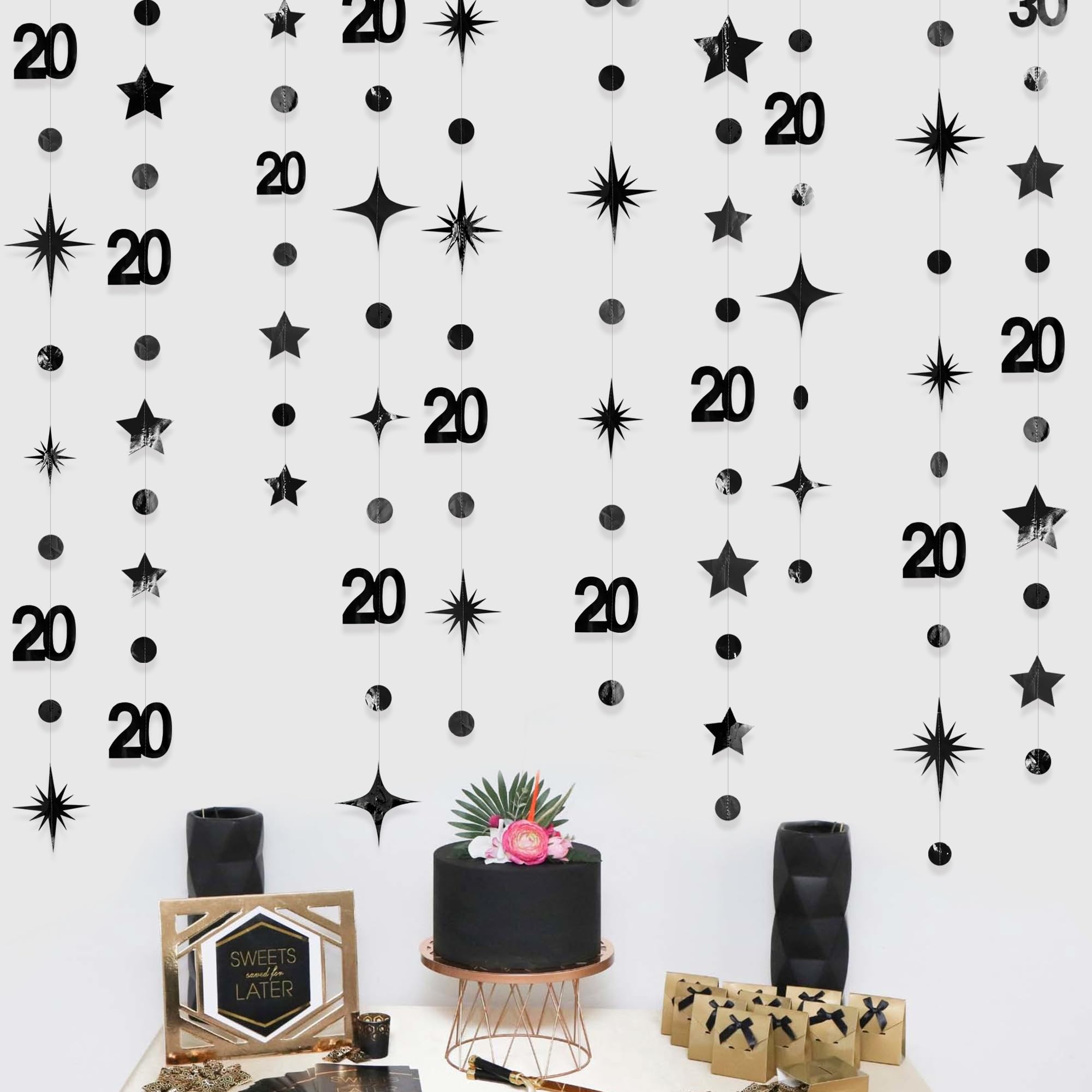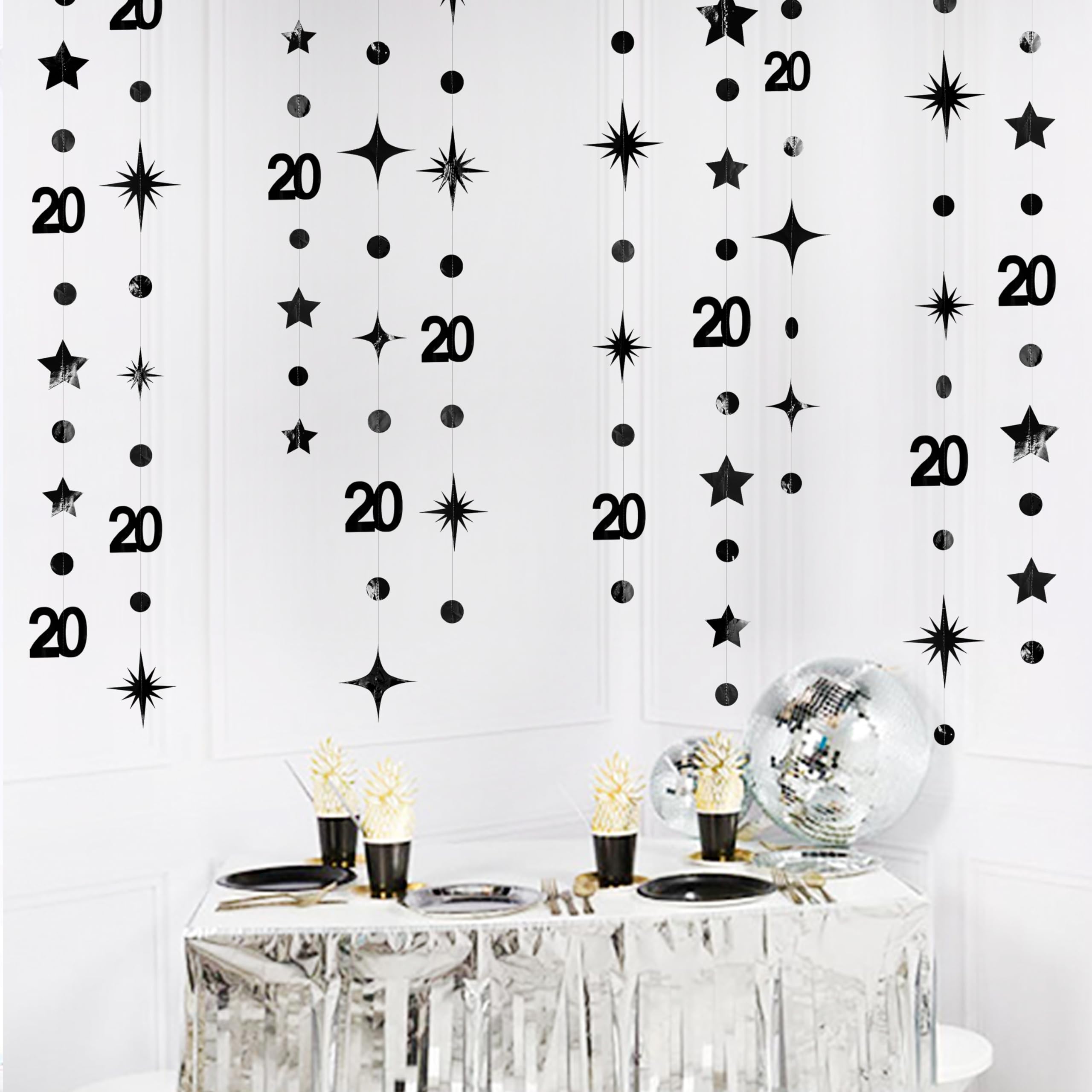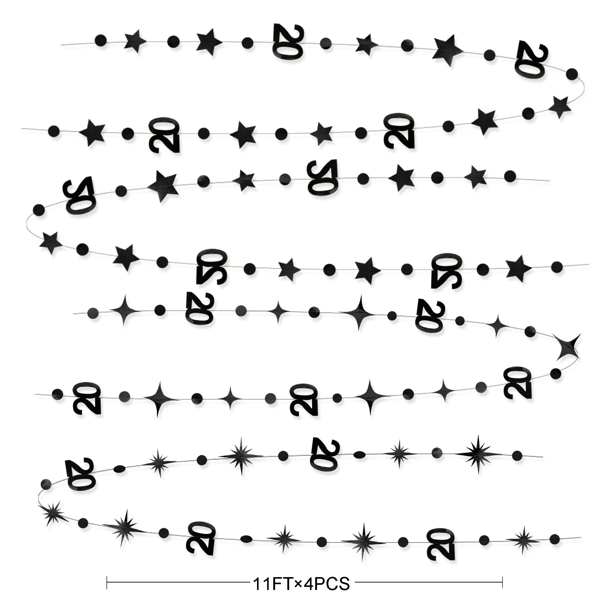 👍 Package includes - 4 strings of 11.5 feet/3.5 meters metallic black number 20 sparkling twinkle star and circle dots garlands , totally is 46 feet/14 meters.