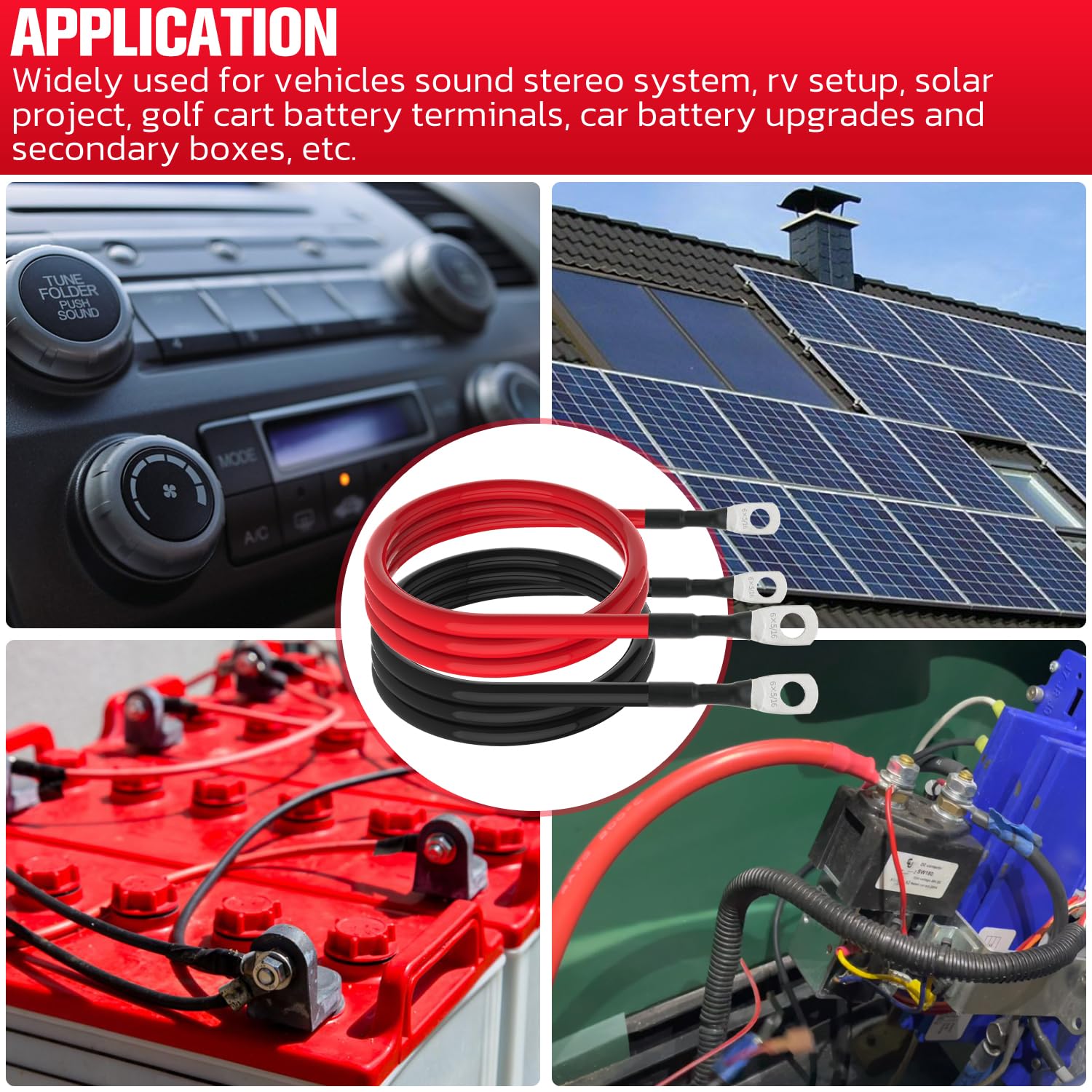 You can use these battery cables for replacement automotive, motorcycle, RV, camper, travel trailer and other vehicle wiring applications, grounding cables, golf carts, car audio stereo amplifiers, solar and many other DC applications Package included: 1 black+1 red cable Note: Please carefully chack all the product information to make sure this will fit your original unit Any questions, please tell us, we’ll answer you as quick as possible