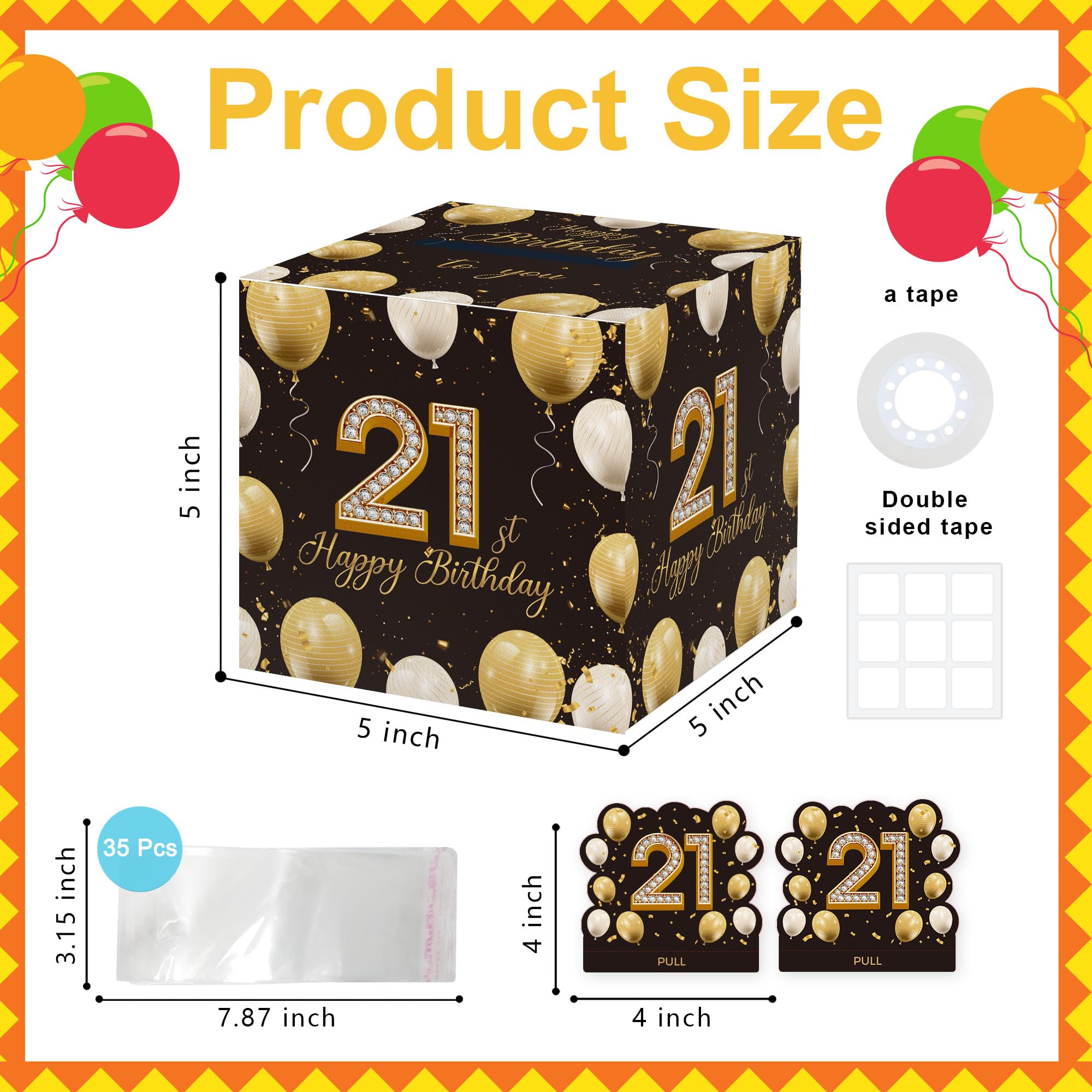 Surprise Gift Box: this gift box measures 5x5 inches, is made of durable cardboard. It also includes 2 theme-related shaped card(with adhere glue dots), 1 roll of transparent tape and 35 plastic pouches similar to the size of U.S. currency for easy placement of bills.