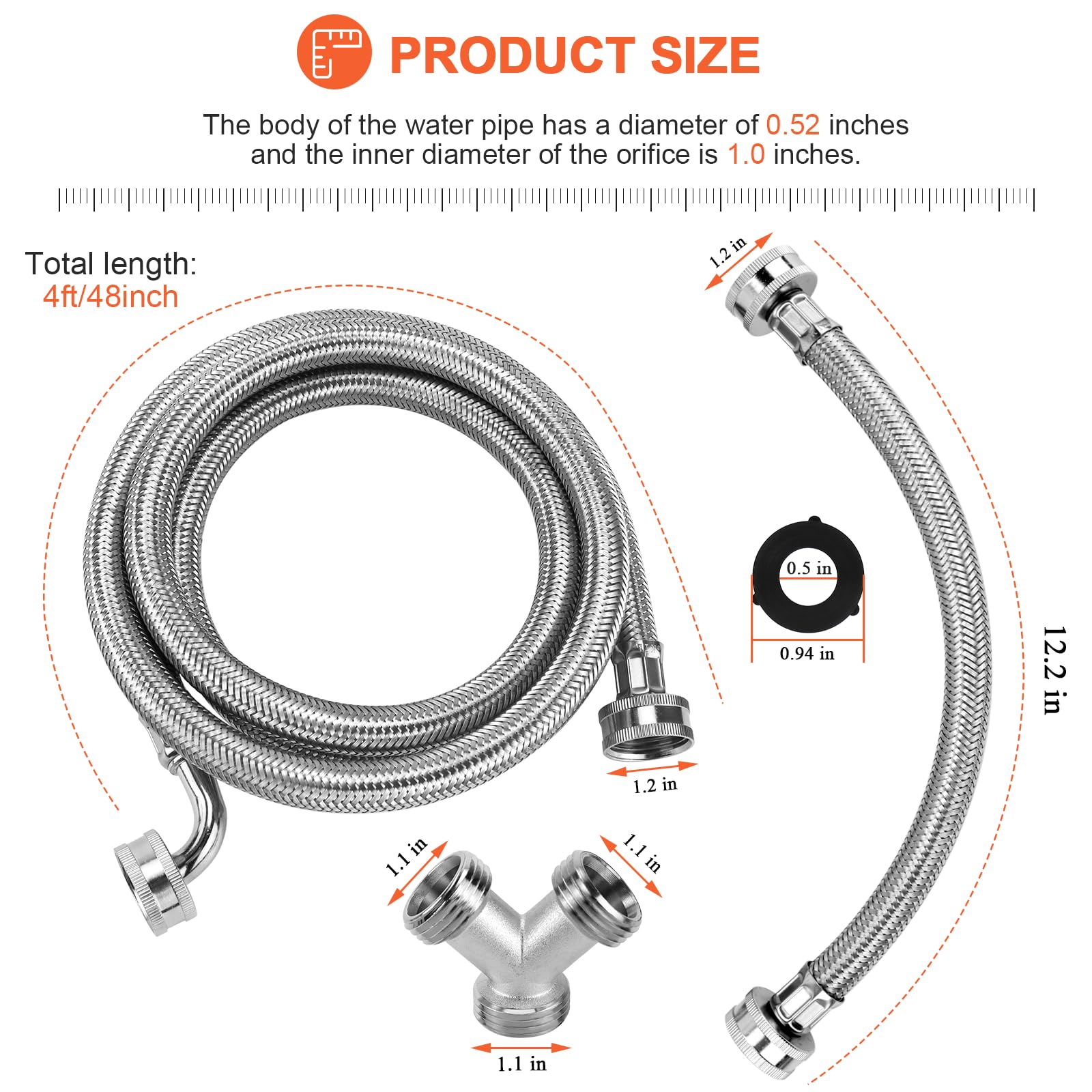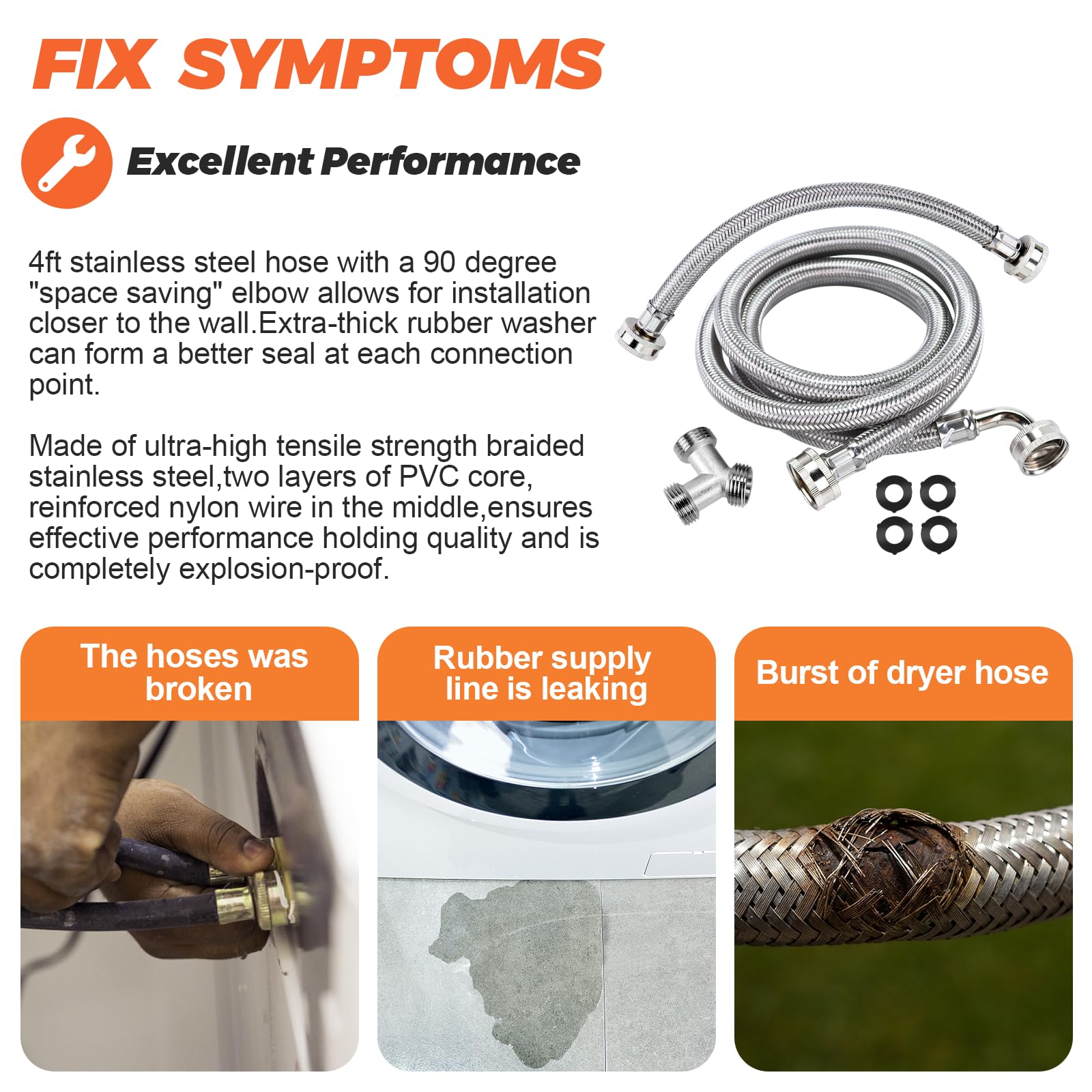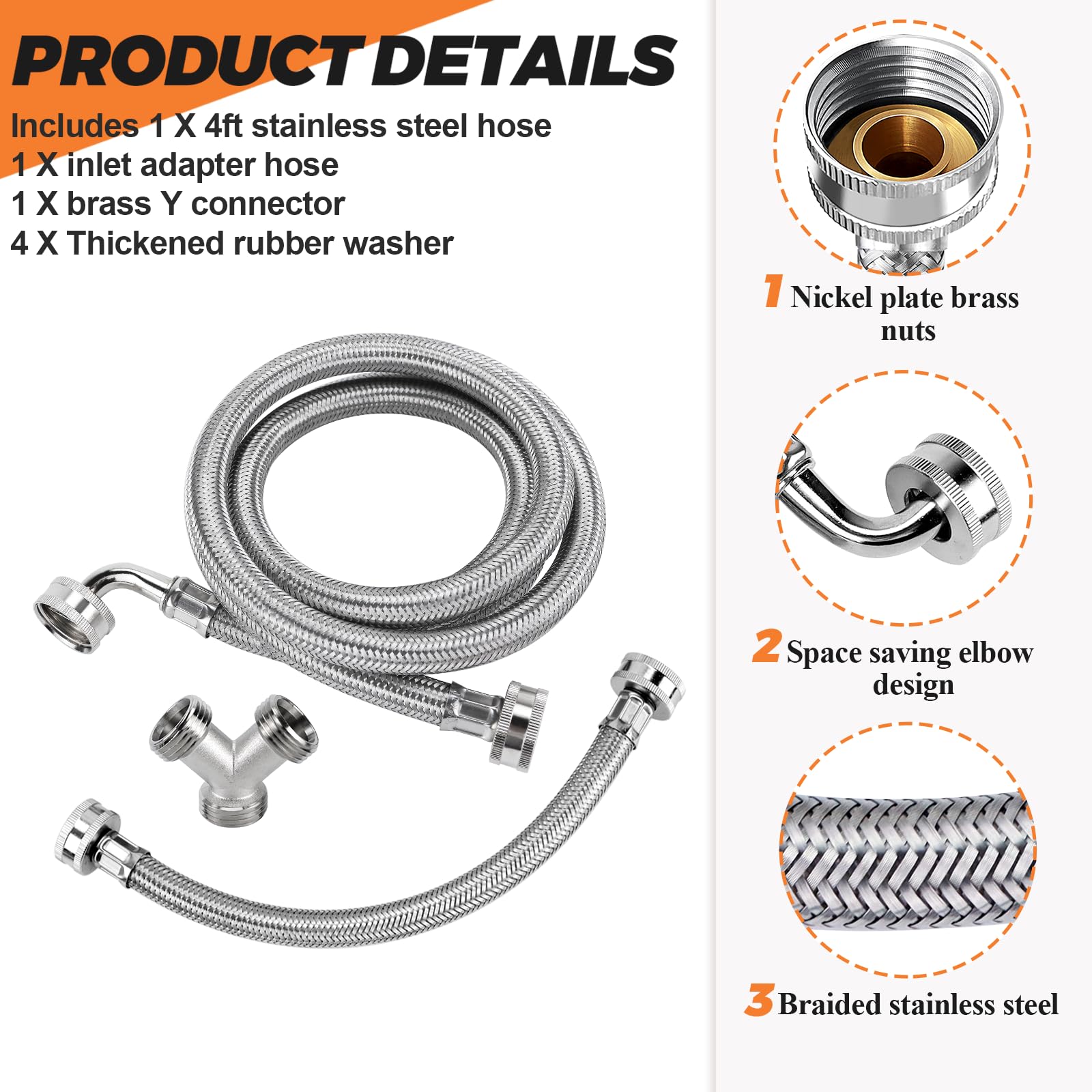 โ ๐บ๐ป๐ฌ๐จ๐ด ๐ซ๐น๐๐ฌ๐น ๐ฐ๐ต๐บ๐ป๐จ๐ณ๐ณ๐จ๐ป๐ฐ๐ถ๐ต ๐ฒ๐ฐ๐ป-- Steam dryer hose kit includes 1 x 4 ft braided stainless steel 304 hose (with 90 degree 'space saving' elbow 3/4 inch FHT connection), 1 x 1 ft Entry adapter hose(3/4" FGH x 3/4" MGH), 1 x brass Y connector for washing machine(FGH x MGH x MGH), 4 x rubber washers. 4 Ft stainless steel hose with dryer vent elbow 90 facilitates smooth installation in tight Spaces and reduces pressure on the washer hoses.Rubber gaskets ensure leak-free connections.This is a great value kit that includes everything you need to install or upgrade your steam dryer!
