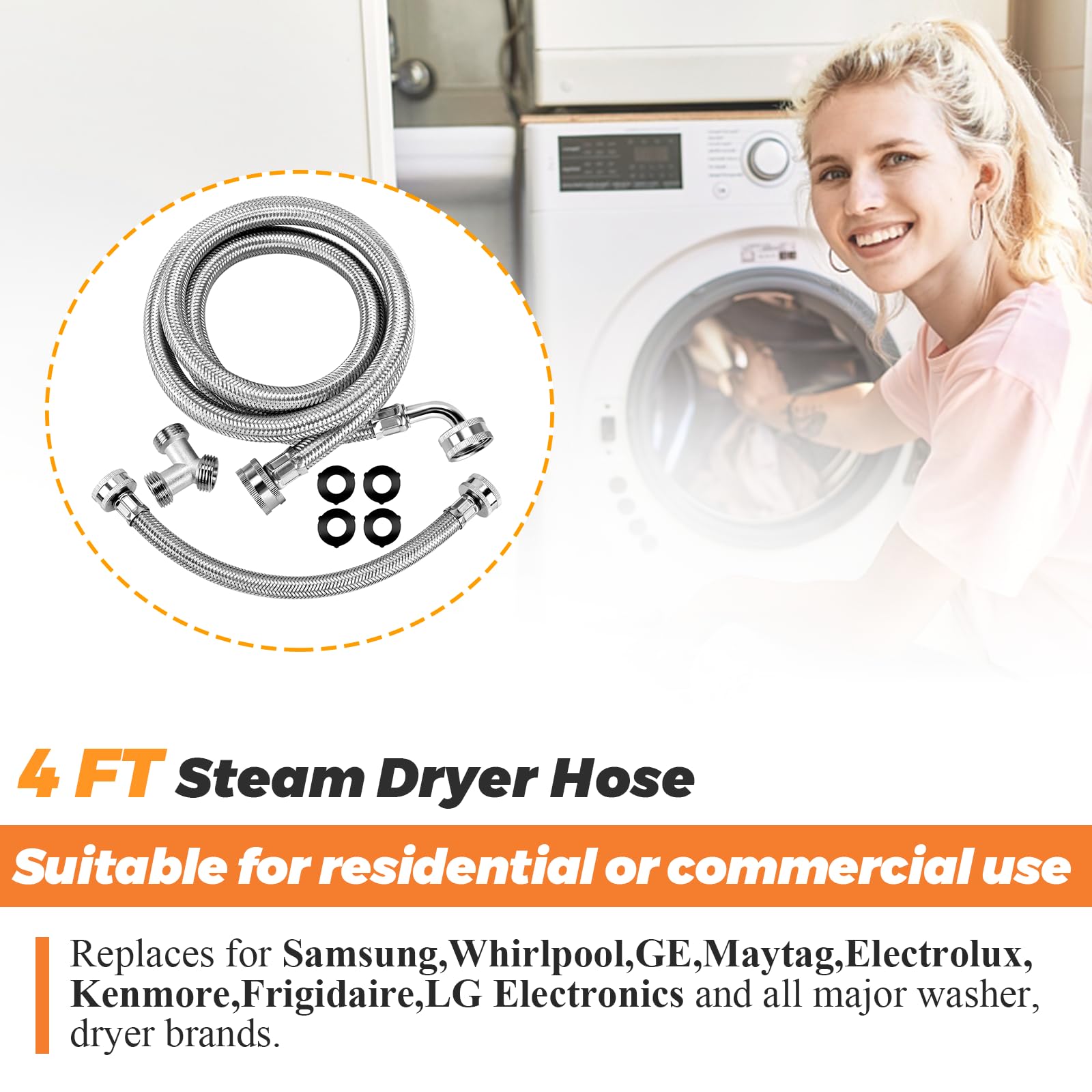 โ ๐ด๐จ๐ซ๐ฌ ๐ญ๐ถ๐น ๐ท๐ฌ๐น๐ญ๐ฌ๐ช๐ป ๐ช๐ถ๐ด๐ท๐จ๐ป๐ฐ๐ฉ๐ฐ๐ณ๐ฐ๐ป๐-- Dryer steam hose kit for all steam dryers, flexible universal washer hoses easily connects to normal household water supply lines in the laundry room. This steam dryer hose kit is perfect for residential or commercial use.It is compatible with May-tag, Elec-trolux, Sam-sung, L-G, Whir-lpool, G-E, Ken-more, Frig-idaire and all standard washer/dryer brands and standard supply line.Priced for both professional repairers and DIY repairs in the home laundry room.