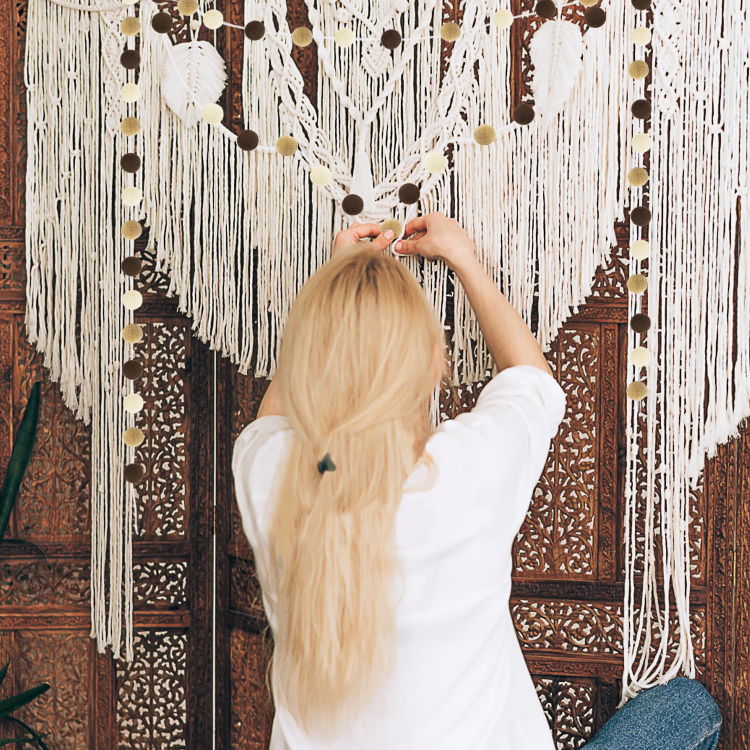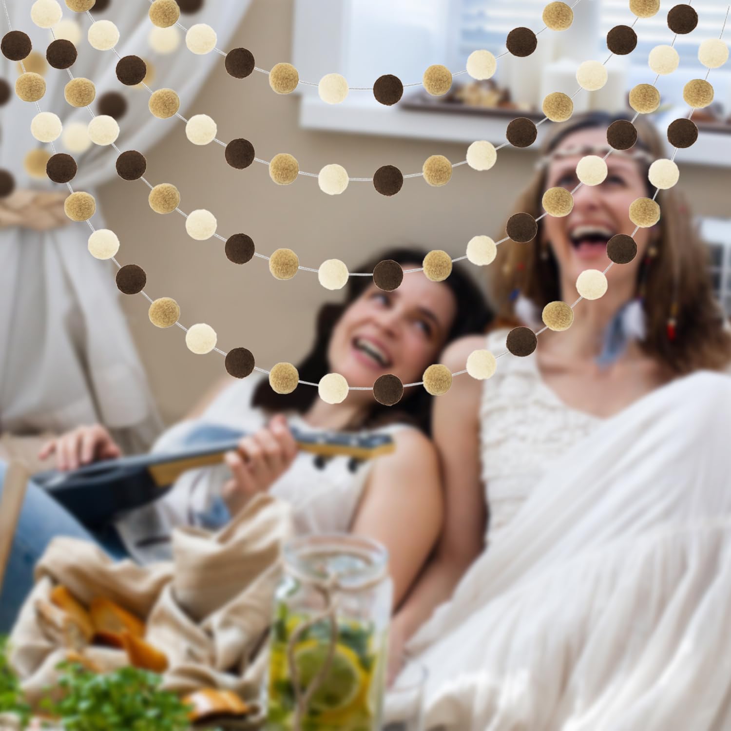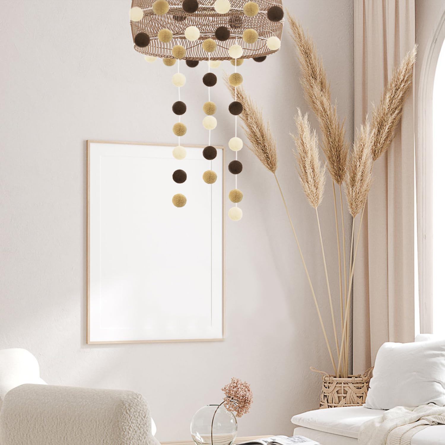 POLYSTYRENE PREMIUM QUALITY: Our felt pom pom balls are made of high-quality polystyrene fiber and string together with white neutral chunky cotton yarn cord rope, polystyrene is an eco-friendly material, the mini felted balls has bohemian Boho Brown Khaki and Beige multi-color, solid and beautiful, fluffy and lightweight, bright and colorful, soft and comfortable, durable and reusable, so our sweet polystyrene felted pompom balls are more better than wool felt balls.