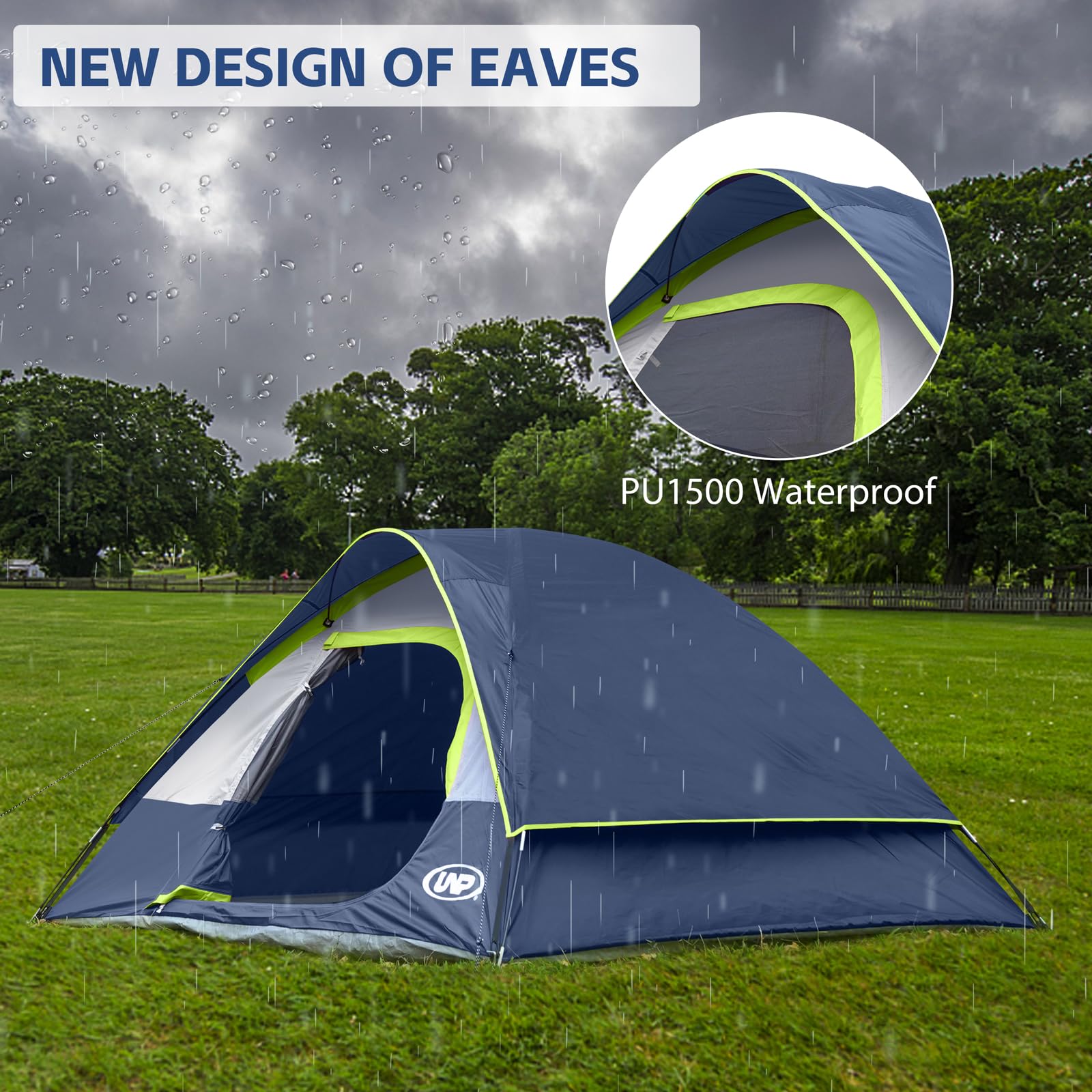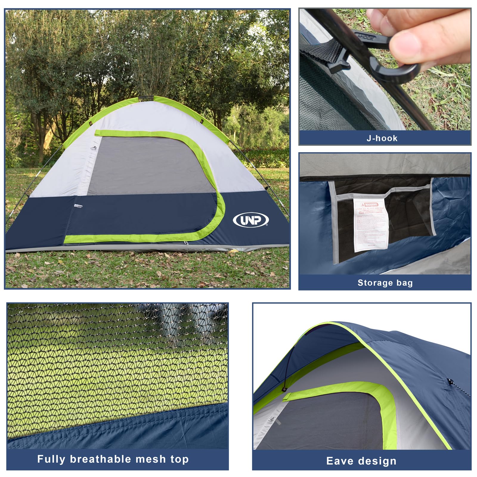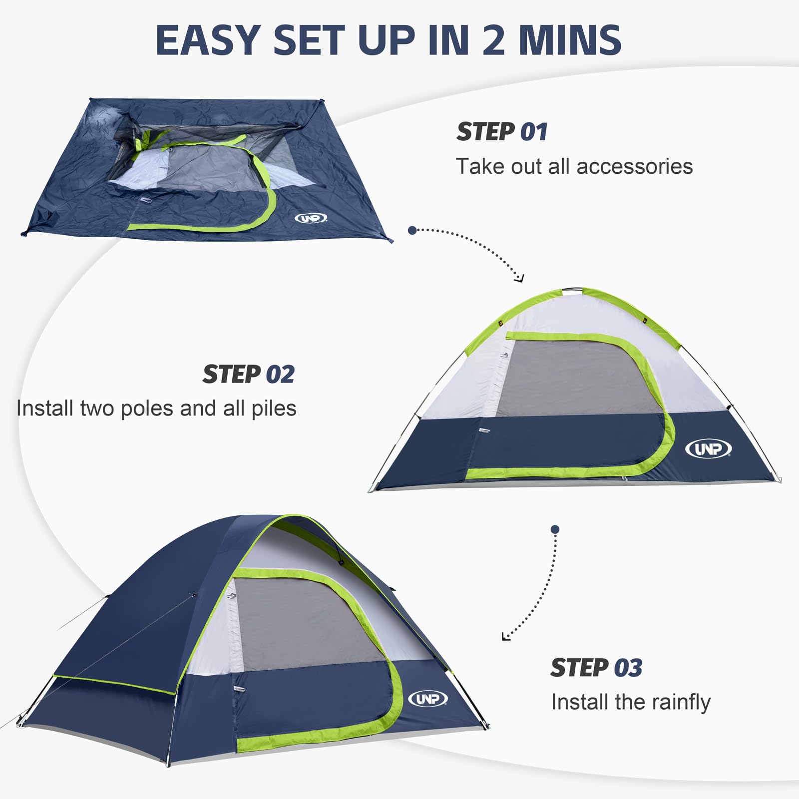 Windproof & Rainproof : The camping tent is made of stronger tear-resistant polyester. It comes with a removable rainfly, the special eave and zippers designed for keeping the rain outside the tent. The ropes of tent and piles ensure safety and stability