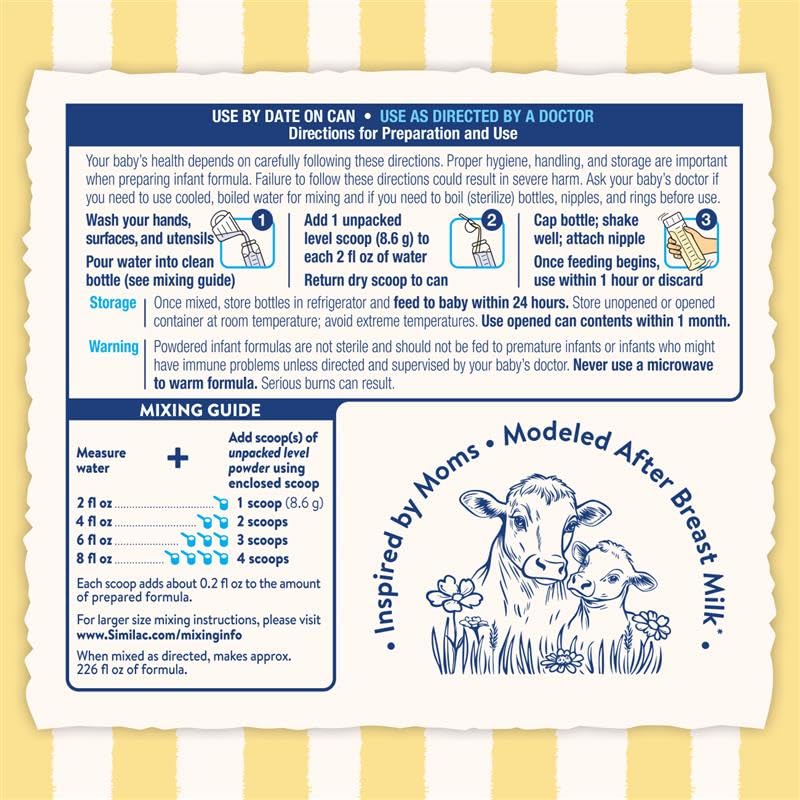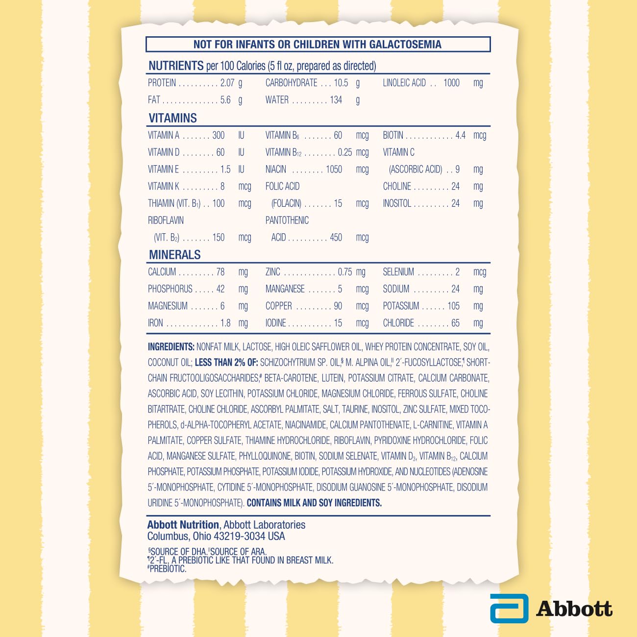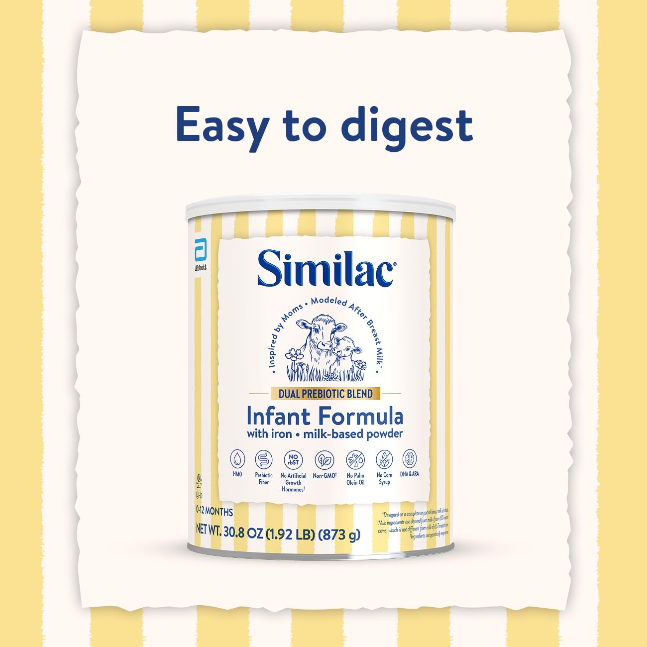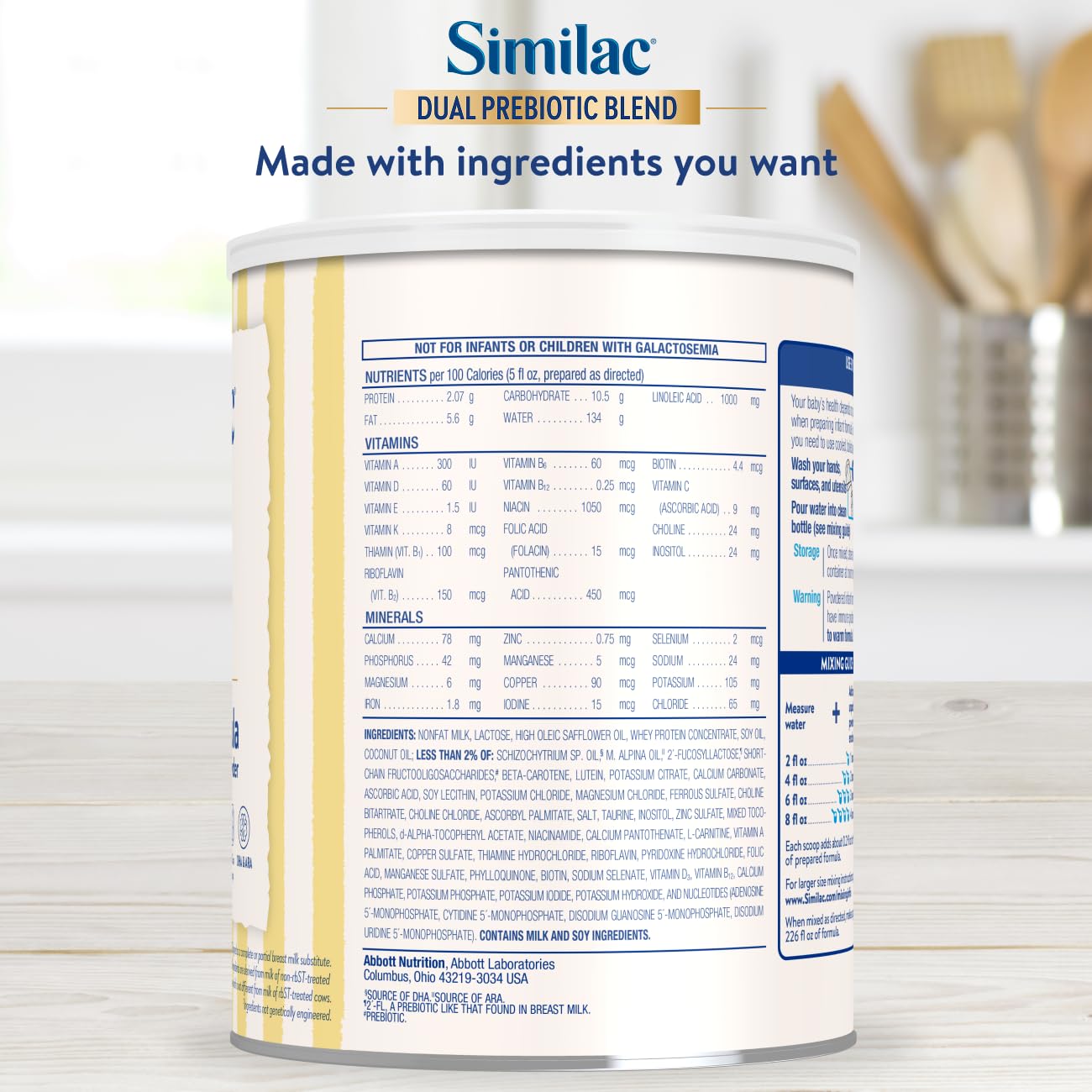 Similac Dual Prebiotic Blend infant formula is inspired by parents who desire to nourish their babies with care and confidence. We know how much you value what goes into your baby’s formula—that’s why we use high-quality ingredients, like our prebiotic blend. Our formula is easy to digest, modeled after breast milk,* and backed by more than 100 years of experience nourishing babies—and a commitment to providing formula options that make sense for your family. This infant formula has no artificial growth hormones,† palm olein oil, corn syrup, and is non-GMO.‡ It has our unique blend of 2′-FL HMO and FOS. * Designed as a complete or partial breast milk substitute. † Milk ingredients are derived from milk of non-rbST-treated cows, which is not different from milk of rbST treated cows. ‡ Ingredients not genetically engineered.