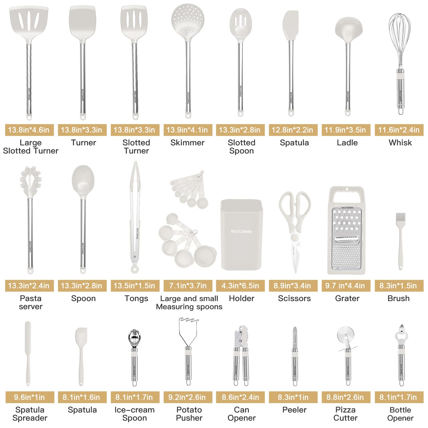 33 COOKING UTENSILS - Utensil Set includes everything you need to cook that perfect dish,includes Slotted Spatula ,Slotted Spoon,Flexible Spatula,Slotted Turner, Solid Turner, Pasta Server,Solid Spoon, Kitchen Tongs, Draining Spoon, Whisk ,Deep Soup Ladle,Spatulas,Brush,Peeler,Pizza Cutter,Bottle Opener,Potato,Pusher,Ice-cream spoon,Can opener,Grater,Scissors,measuring cups and spoons set,Small Brush,,Small spatula,Spatula,Holder