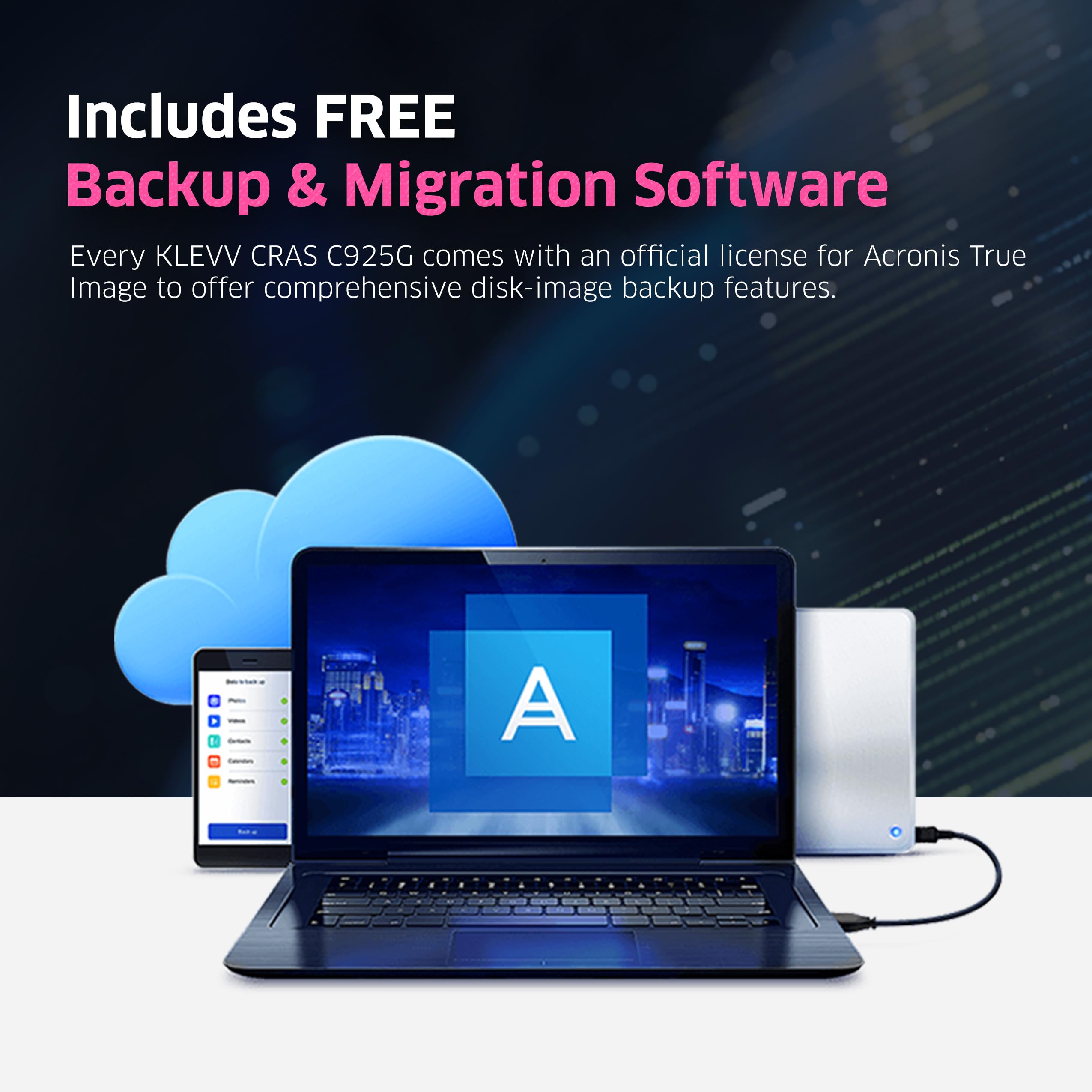 Includes FREE Backup & Migration Software: Every KLEVV CRAS C925G SSD comes with an official license for Acronis True Image. The software offers comprehensive disk-image backup features, enabling users to effortlessly restore or transfer data from their existing drive.
