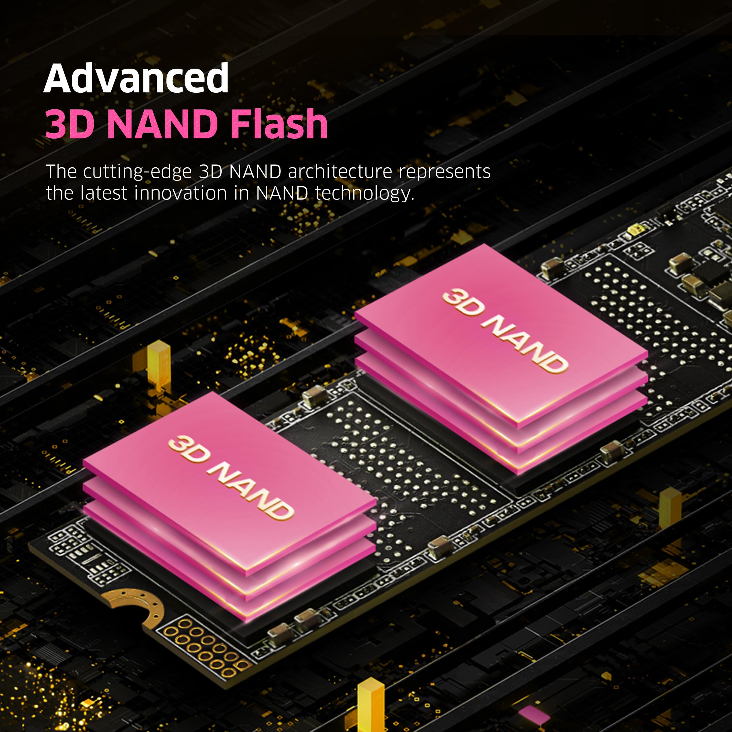 High-performance 3D NAND Flash: The cutting-edge 3D NAND architecture represents the latest innovation in NAND technology, achieving greater storage capacity by vertically stacking flash memory cells. This design enhances Total Bytes Written (TBW) and optimizes overall performance.
