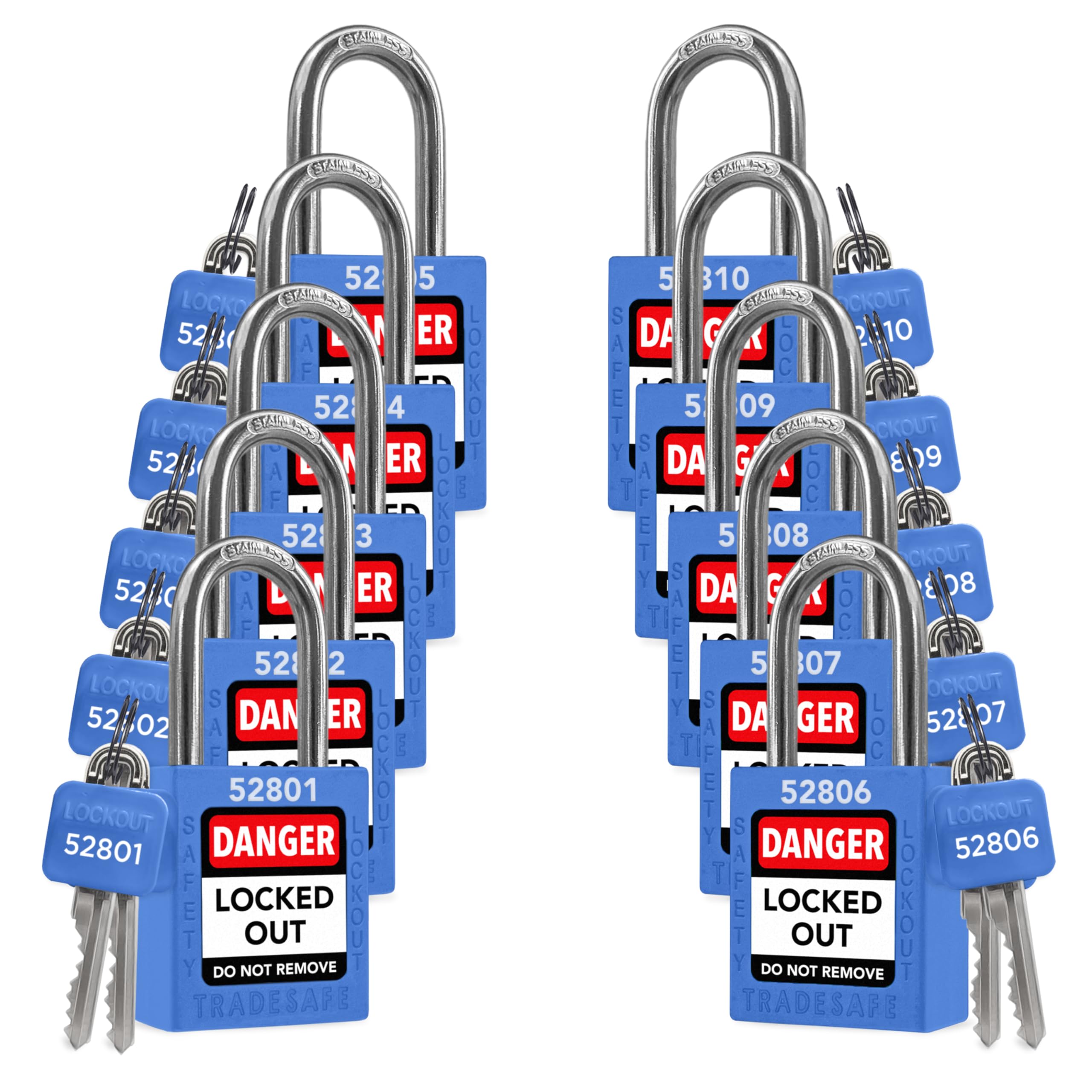 Premium Tagout Lock - (10) Blue lock out tag out locks with 1-1/2 inch stainless steel shackle, 1/4-inch shackle diameter, 2 keys per lock, matching color and code on padlock body and key bows, each lock in the pack has unique codes