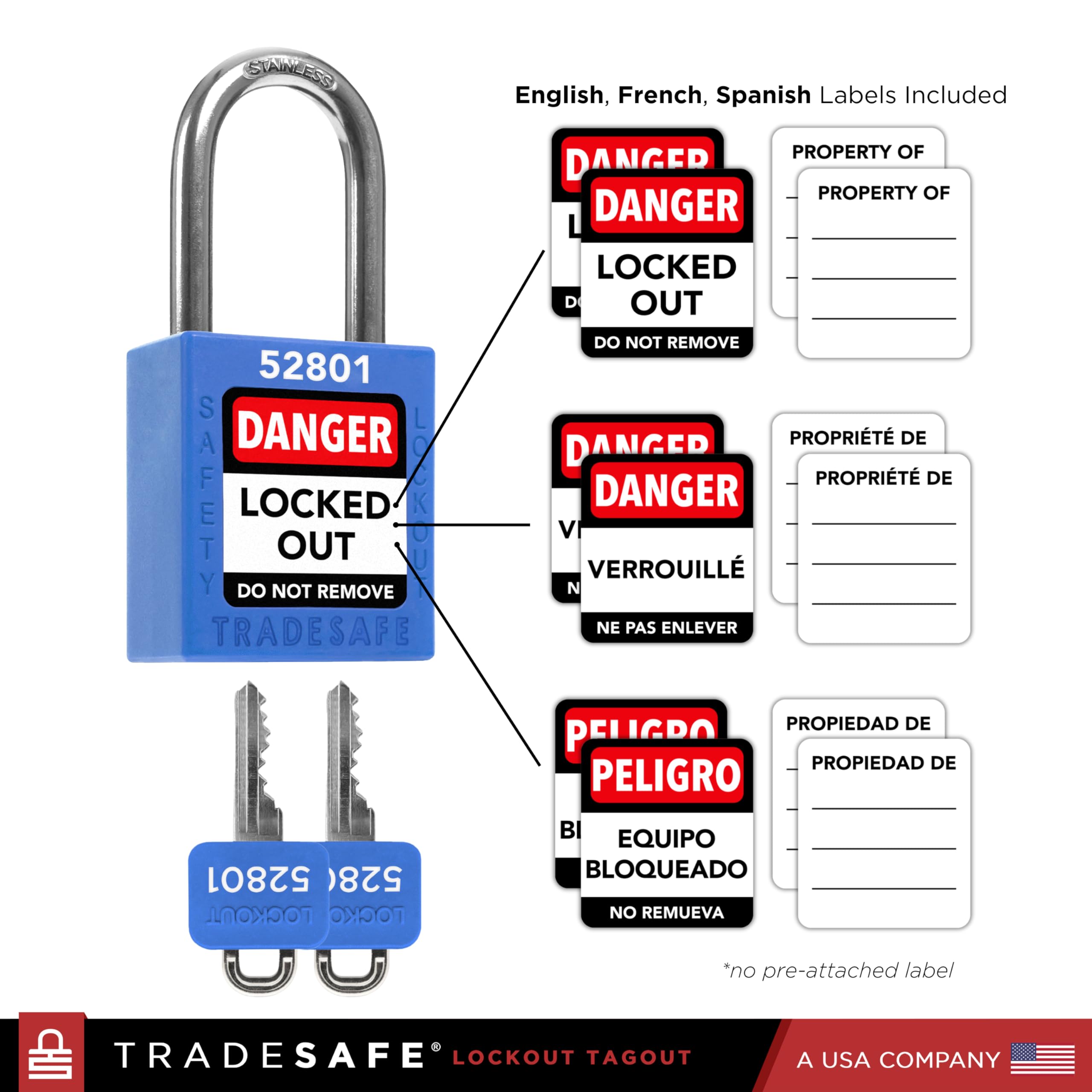 Multilingual Labels - Each lockout tagout lock set comes with 2 sets of labels in English, Spanish, and French; “Danger Locked Out Do Not Remove” warning label for the front side and a spacious writable label for the back side