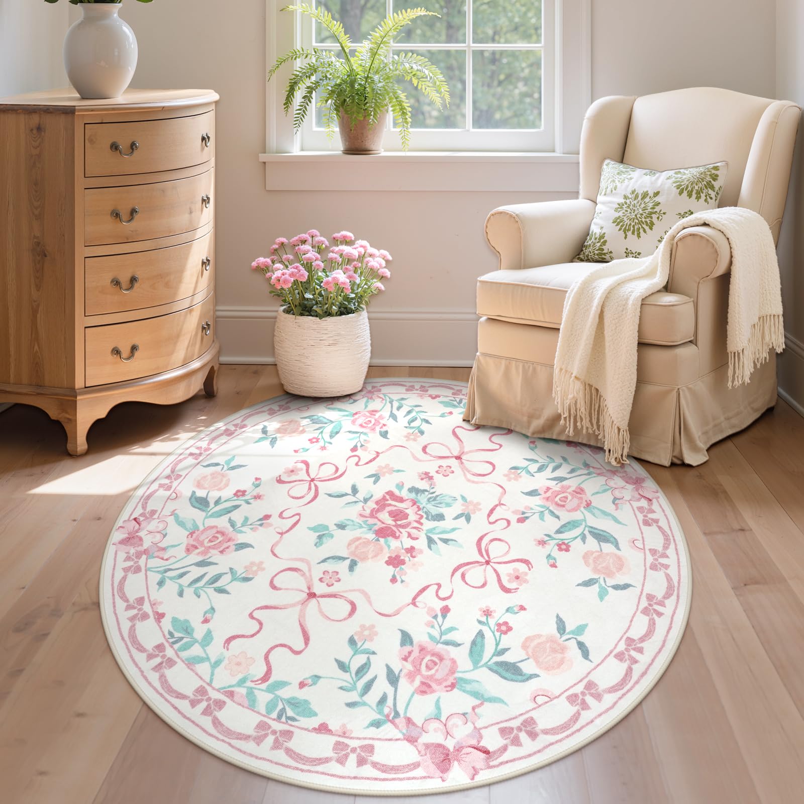 Collive Bow Garden Floor Mat is a great floor mat for girls and women. The rug is available in pink, blue, purple, and green, and the size contains 3x5 feet, 4x6 feet, 5x7 feet, 6x9 feet, 8x10 feet, 4ft, and 6 ft to suit different aesthetics and lifestyles. The bow and natural flowers and plants are both full of childish fun and elegant and beautiful, which can be well matched with the space of girls' home, such as foyer, living room, dining room, bedroom, study room, dressing room, checkroom, toy room, classroom, dormitory, laundry room, baby's room Features: 1. Made of non-slip rubber TPE backing, non-slip and good fixing. 2. Elegant floral design adds vibrancy to home décor. 3. Wool-like surface and low-pile craftsmanship for comfort that won't block doorway access. 4. Made of durable polyester fiber, suitable for children and pets. Applicable range: - 3 feet x 5 feet (36 x 60 inches): enough to decorate entryway, foyer, coffee table, nursery, laundry room, - 4 feet x 6 feet (48 x 72 inches): enough to decorate nursery, den, toy room, checkroom, toddler room, - 5 feet x 7 feet (60 x 84 inches): enough to decorate living room, dining room, game room, farmhouse, classroom, office, dormitory, camping or bedside. - 6 feet x 9 feet (72 x 108 inches): enough to decorate a living room, dining room, game room, farmhouse, classroom, office, dormitory, or bedside. - 8 feet x 10 feet (96 x 120 inches): enough to decorate a living room, dining room, game room, farmhouse, classroom, office, dorm room, or bedside. - Round 4 feet (48 inches): round rugs can decorate bedside, sofa side, dining room, office, game room, farmhouse, classroom, dormitory. - Round 6 feet (72 inches): round rugs can decorate living room, bedside, sofa side, dining room, office, game room, dormitory.
