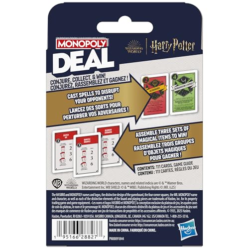 Conjure, collect, and win! In the Monopoly Deal: HARRY POTTER kids card game, a wealth of enchanted objects is waiting to be found. Be the first witch or wizard to collect 3 different sets of magical items to win. Cast spells over opponents to disrupt their plans—and receive help from iconic heroes and villains while dueling for control over the riches of the WIZARDING WORLD! This fun family card game for kids and adults can be played in about 15 minutes, so it’s an ideal game for fitting in family fun anytime. And HARRY POTTER toys and games are wonderful holiday and birthday gifts for teens, adults, and kids. WIZARDING WORLD characters, names, and all related indicia are copyright and trademark Warner Bros. Entertainment Inc. WB SHIELD: Copyright and trademark WBEI. Publishing Rights Copyright JKR. (s25) The HASBRO and MONOPOLY names and logos, the distinctive design of the gameboard, the four corner squares, the MR. MONOPOLY name and character, as well as each of the distinctive elements of the board and playing pieces are trademarks of Hasbro, Inc. for its property trading game and game equipment.