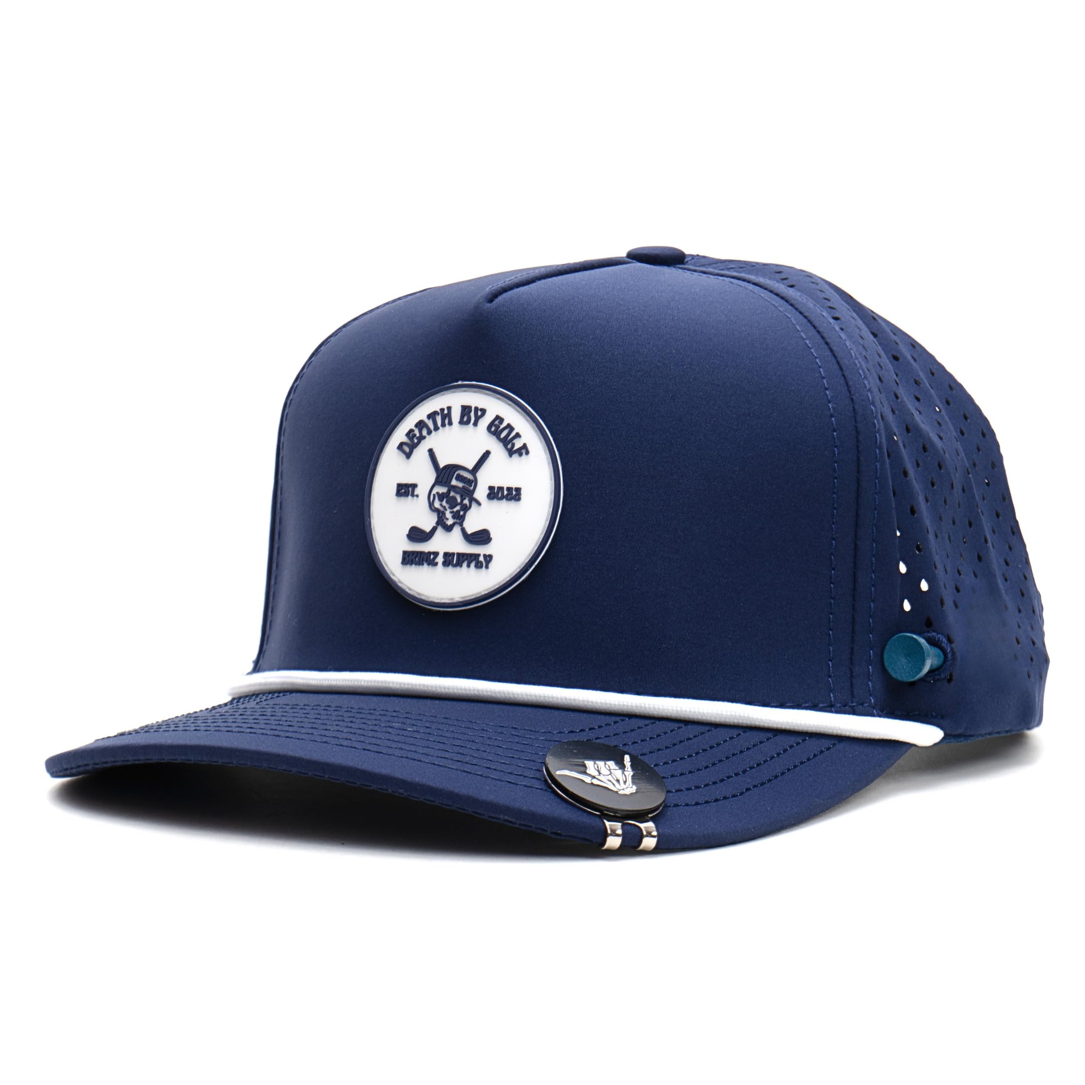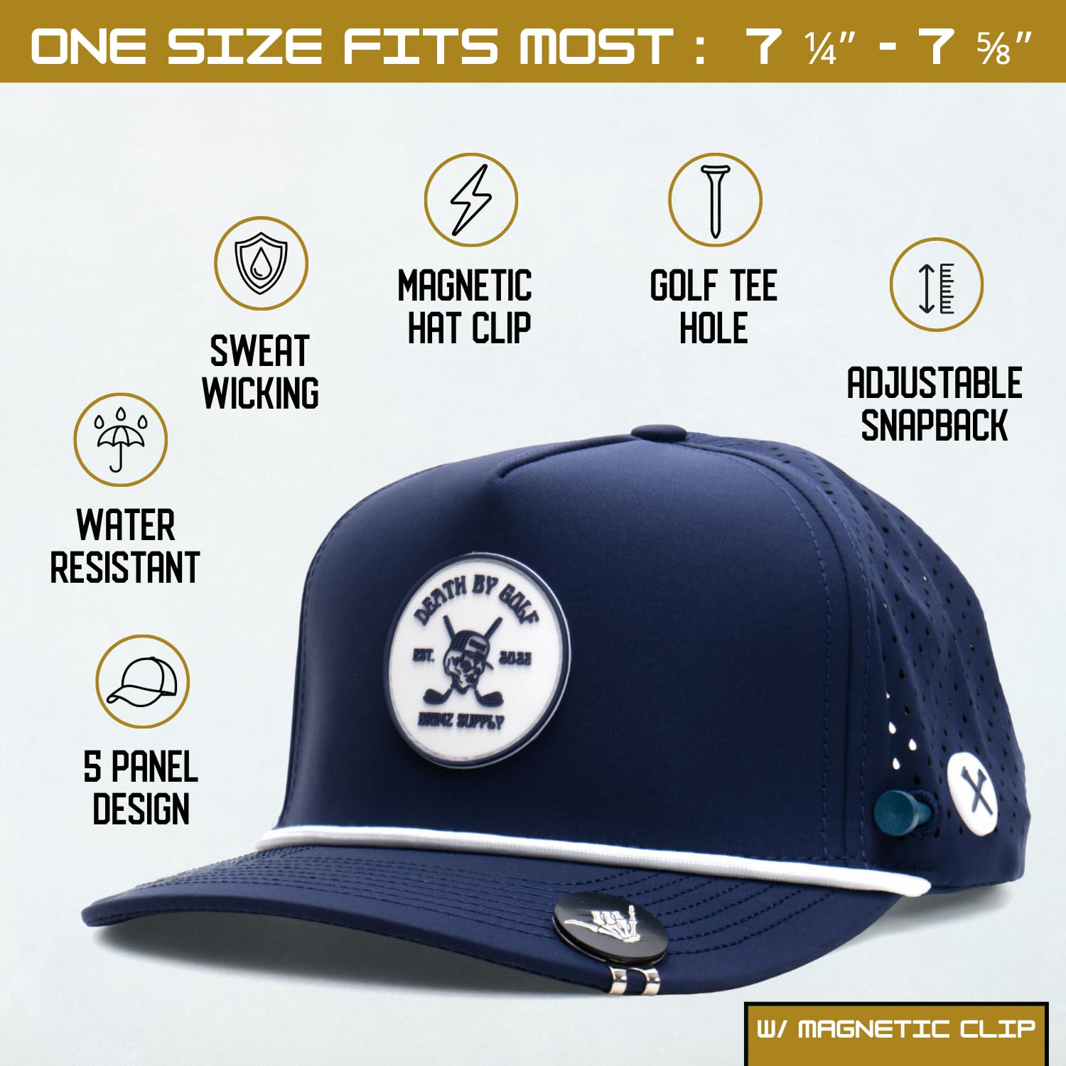 CLASSIC DESIGN, MODERN PERFORMANCE: The five-panel baseball cap style is complete with a magnetic ball marker that attaches to the hat, a hole on the side of the hat to hold your tee, 3D rubber mold patches, and made with a polyester spandex blend with a built-in sweat band for superior sweat resistance, flex-fit hold, and ventilation.