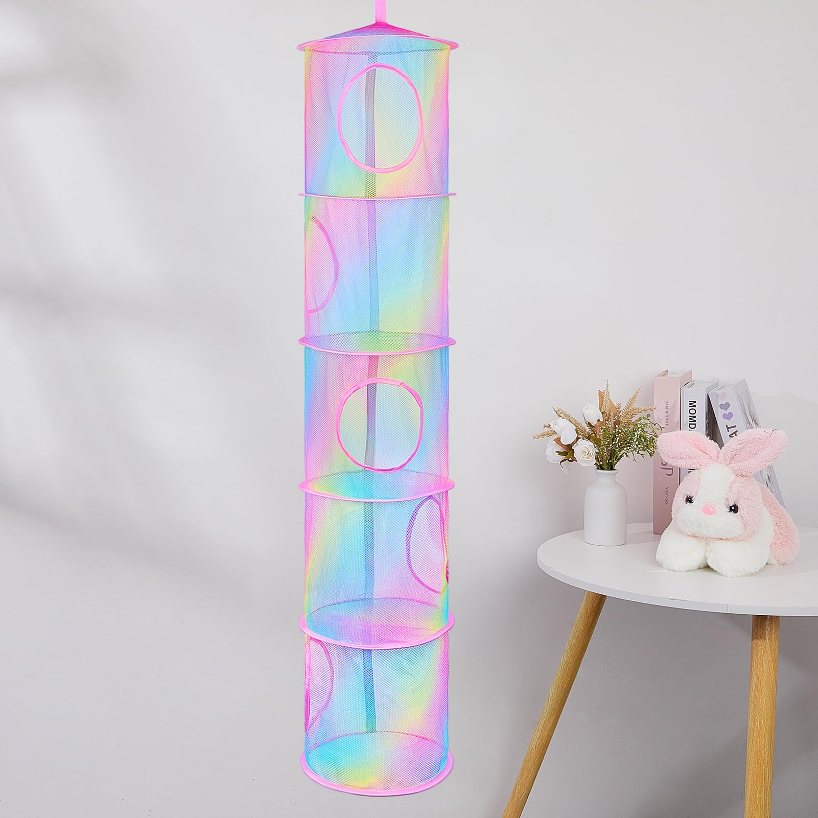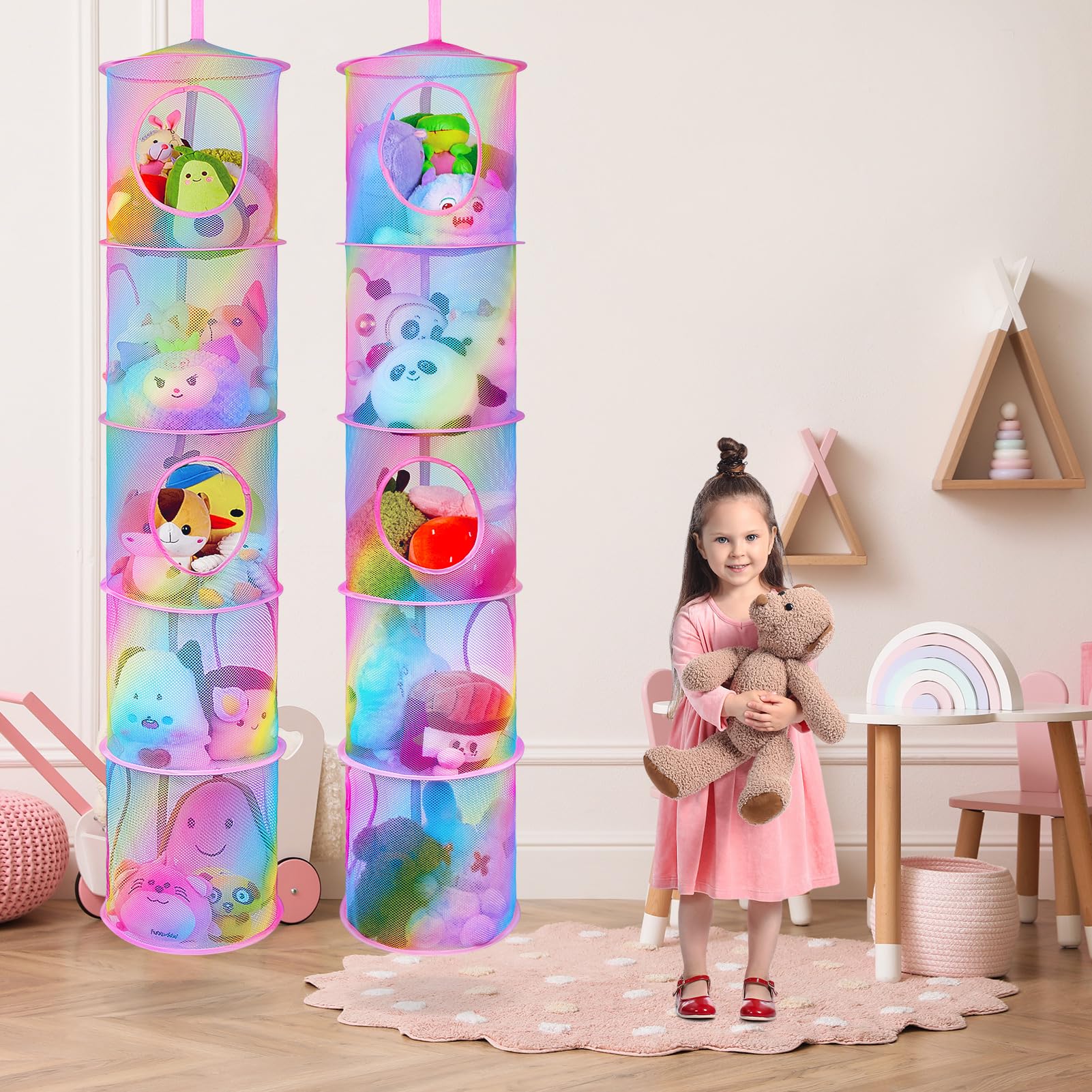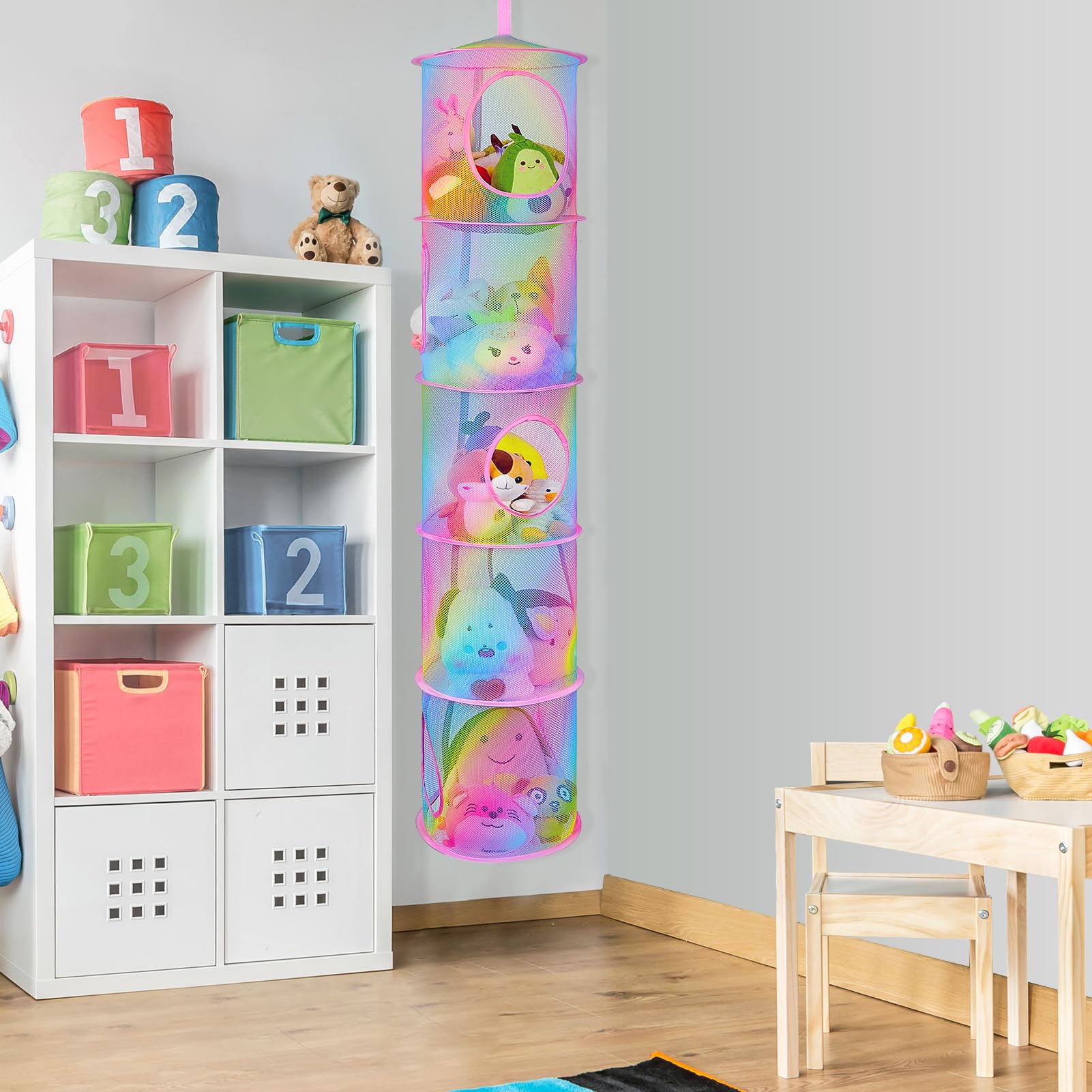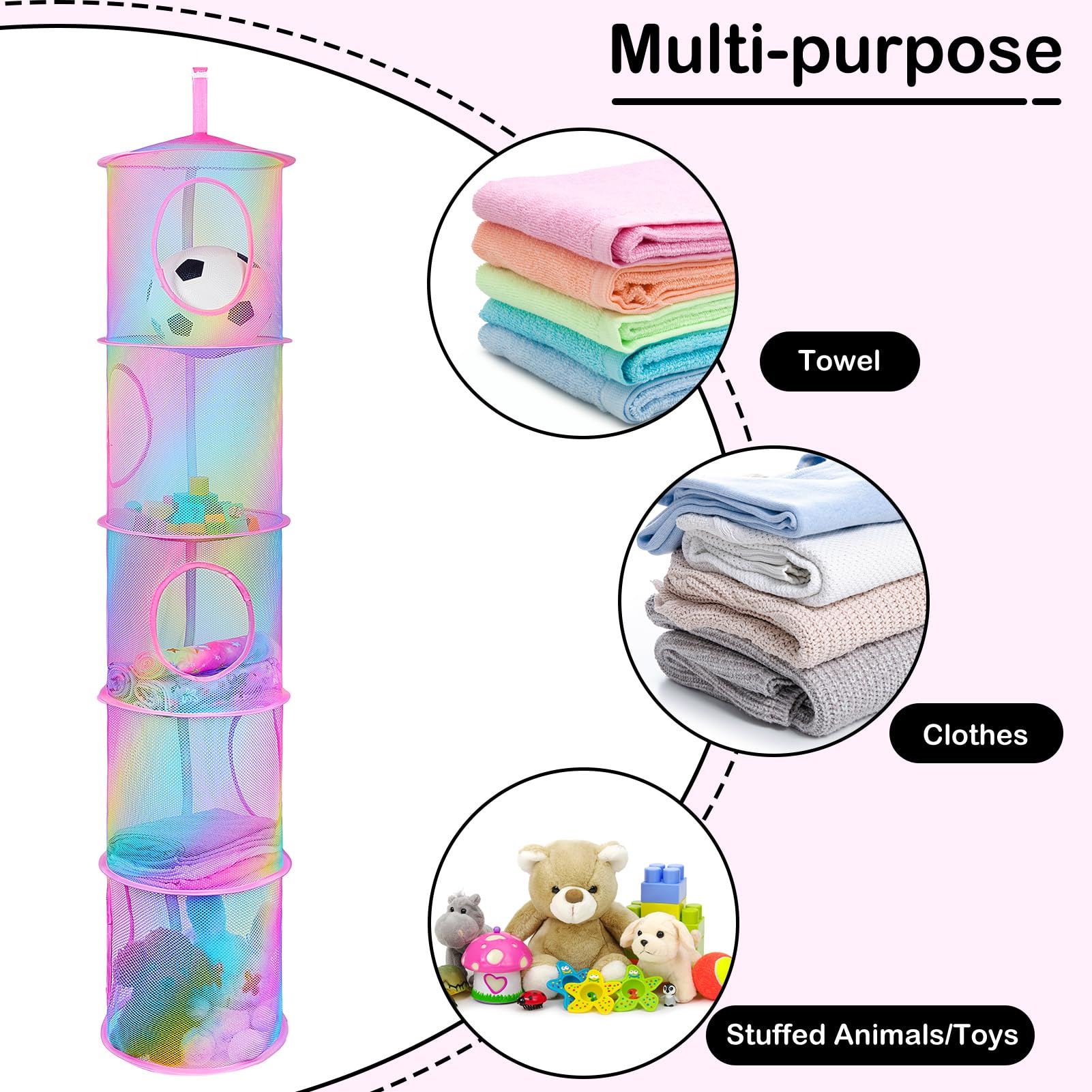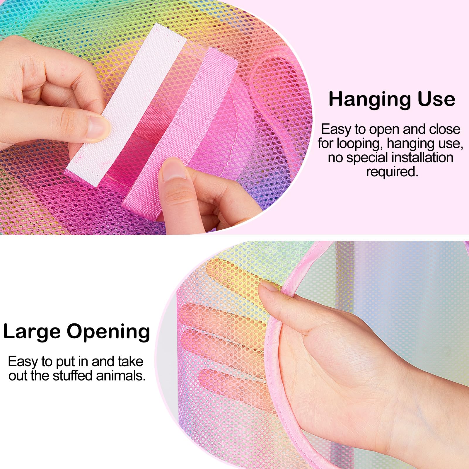 Stuffed Animals Storage: Creative collapsible design and customized unique colors, hanging use and maximizes utilization of standing space, different direction for putting items, convenient to use, easy fold when not use, saving space