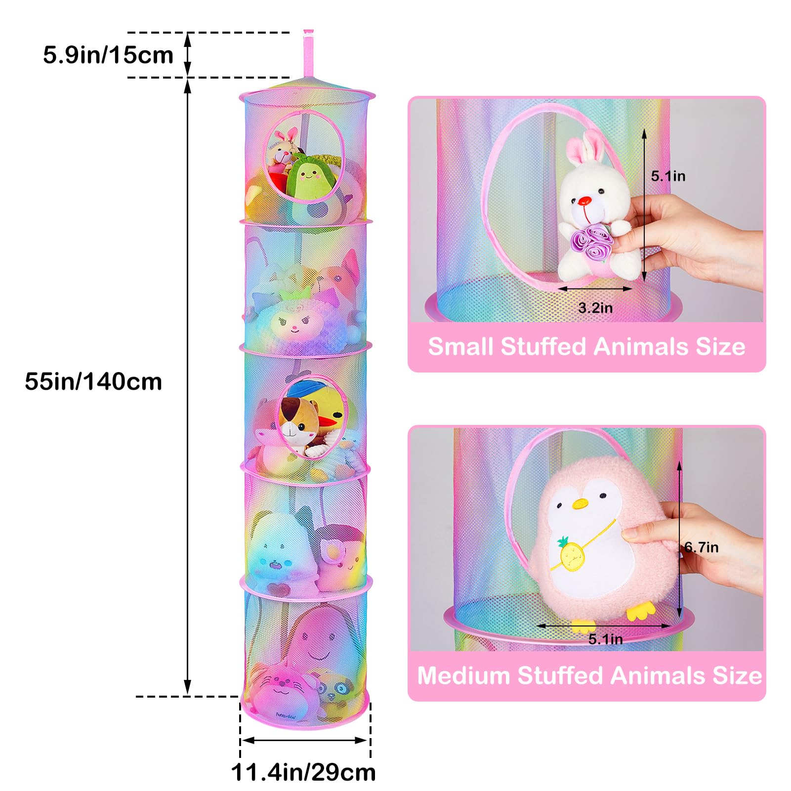 Size and Package: Stuffed animals organizer holder 3 tiers size is 11.4 " x 11.4 " x 32.6 ", 4 tiers size is 11.4 " x 11.4 " x 43.3 ", 5 tiers size is 11.4 " x 11.4 " x 55 ", top with wide loop, easy to open and close, for hanging; No special installation is required, and hanging it on a hook or a closet at will, the package contains 2 pcs of stuffed animals storage