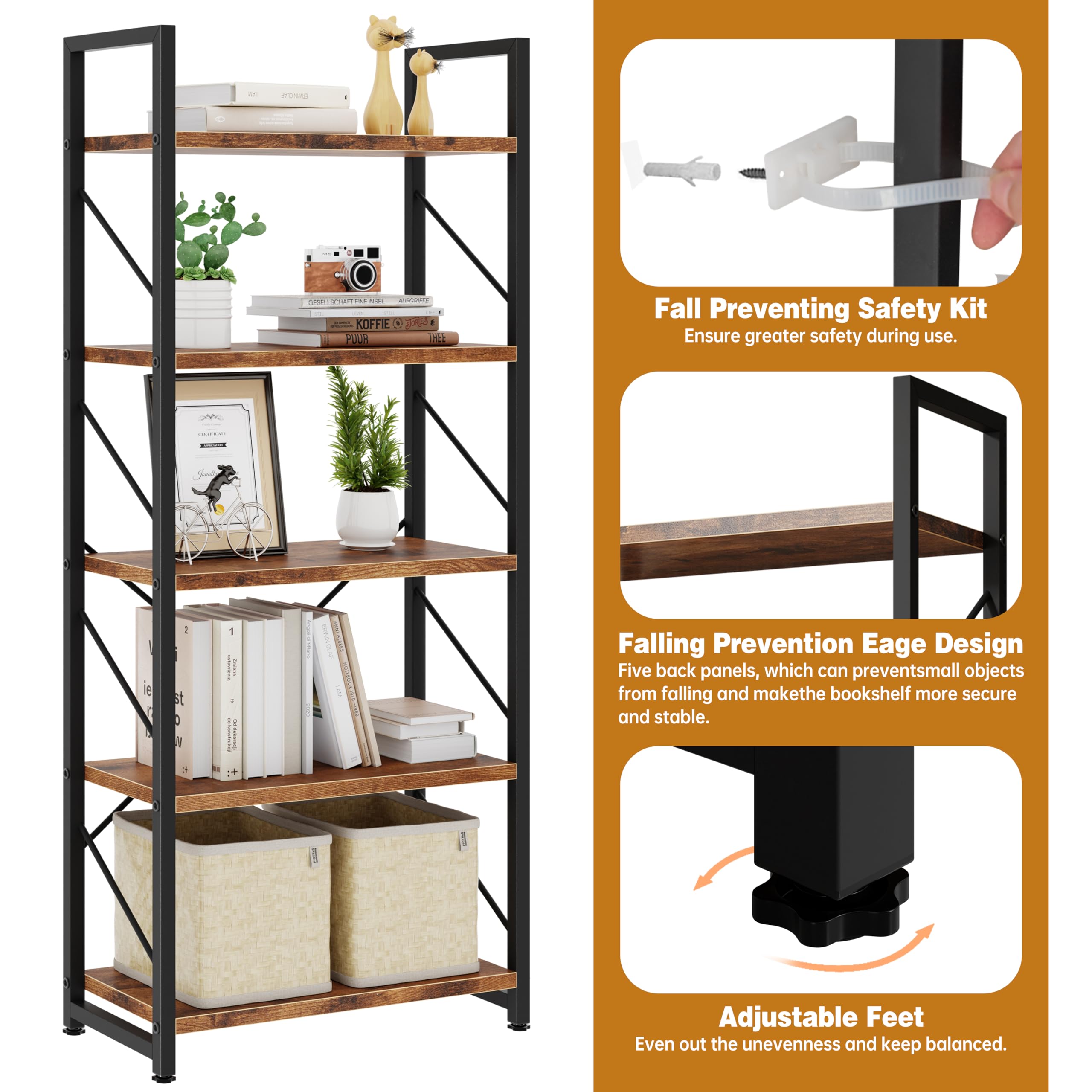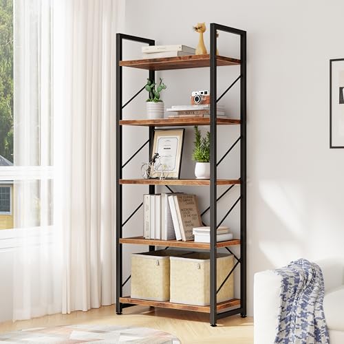 5-Tier Open Multifunctional Bookshelf:This 5 shelf bookshelf provides a very wide storage space, you can use it to place all kinds of items as you see fit. Books, photo albums, crafts, potted plants and etc. SIZE: 23.6"L × 11.8"W × 62.2"H