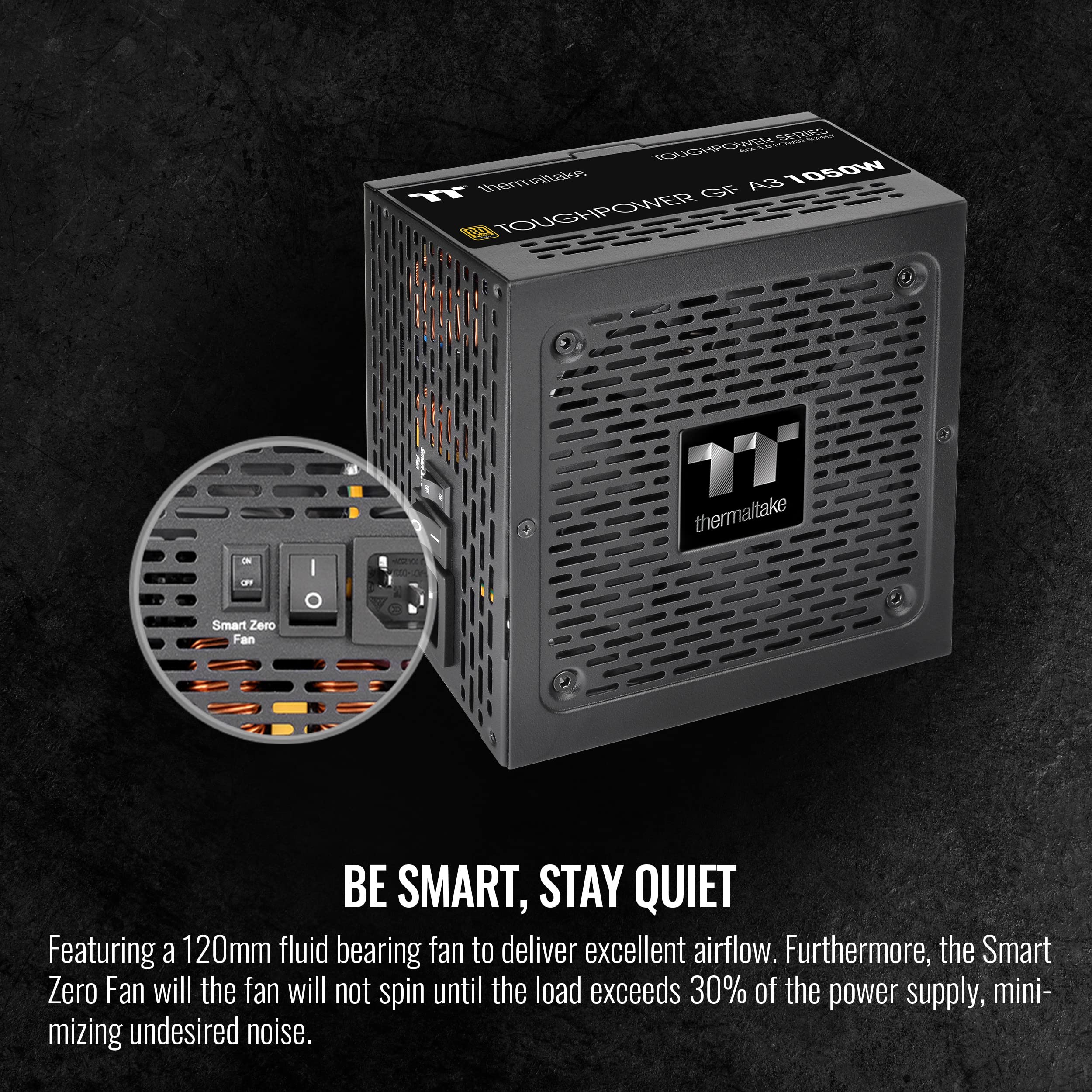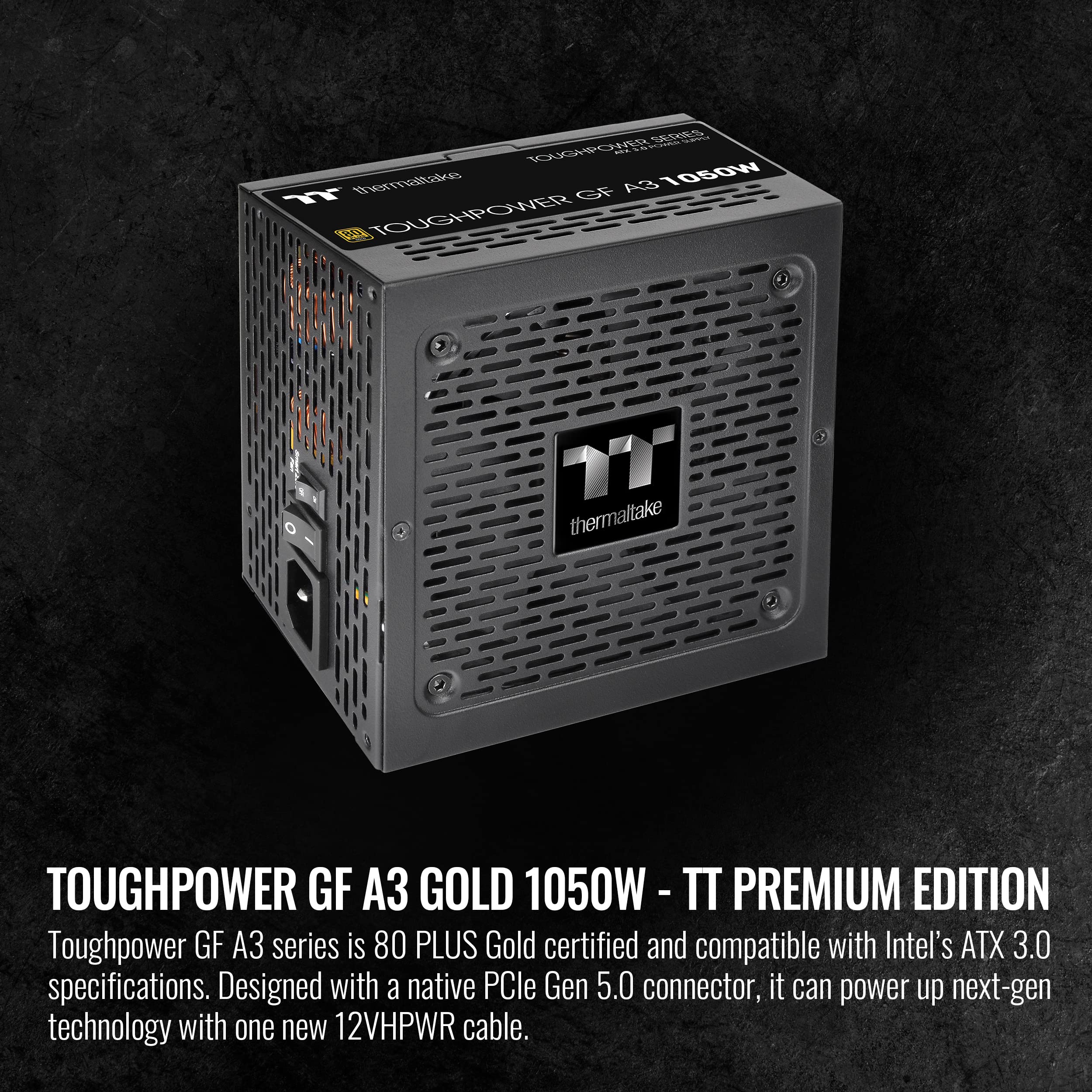 Toughpower GF A3 Gold series comes with a 16pin connector to offer powerful and stable performance allowing the PSU to natively run next-generation GPUs. The wattage marked on the 12VHPWR’s connector is the recommended wattage. (Ref. Intel design guideline) The native 16 PIN (12VHPWR) PCIe connector of the GF A3 1050W can deliver up to 600W for PCIe 5.0 graphics cards. Note: 1. Recommended wattage is an estimation of system power demand. Actual power demands may vary based on specific components, usage, and many other factors. 2. Please follow the recommended power requirements from the GPU manufactures before using the 12VHPWR cable. •P/N: PS-TPD-1050FNFAGU-L •WATTS: 1050W •MODEL: TTP-1050AH2FLG •MAX. OUTPUT CAPACITY: 1050W •COLOR: Black •DIMENSION ( W / H / D ): 150mm(W)x86mm(H)x140mm(D) •PFC (POWER FACTOR CORRECTION): Active PFC •POWER GOOD SIGNAL: 100-150 msec•HOLD UP TIME: > 17msec •INPUT CURRENT: 20A-8A •INPUT FREQUENCY RANGE: 50Hz/60Hz •INPUT VOLTAGE: 100-240V~ •OPERATING TEMPERATURE: 5°C to + 45°C •OPERATING HUMIDITY: 20% to 85%,non-condensin •STORAGE TEMPERATURE: -40°C to + 55°C •STORAGE HUMIDITY: 10% to 95%, non-condensing •COOLING SYSTEM: 12cm FDB Fan •EFFICIENCY: Meet 80 PLUS® Gold at 115Vac input. •MTBF: 100,000 hrs minimum •SAFETY APPROVAL: FCC/ICES/CB/cTUVus •PCI-E 6+2PIN: 5 •PCIE 12+4PIN: 1(600W).