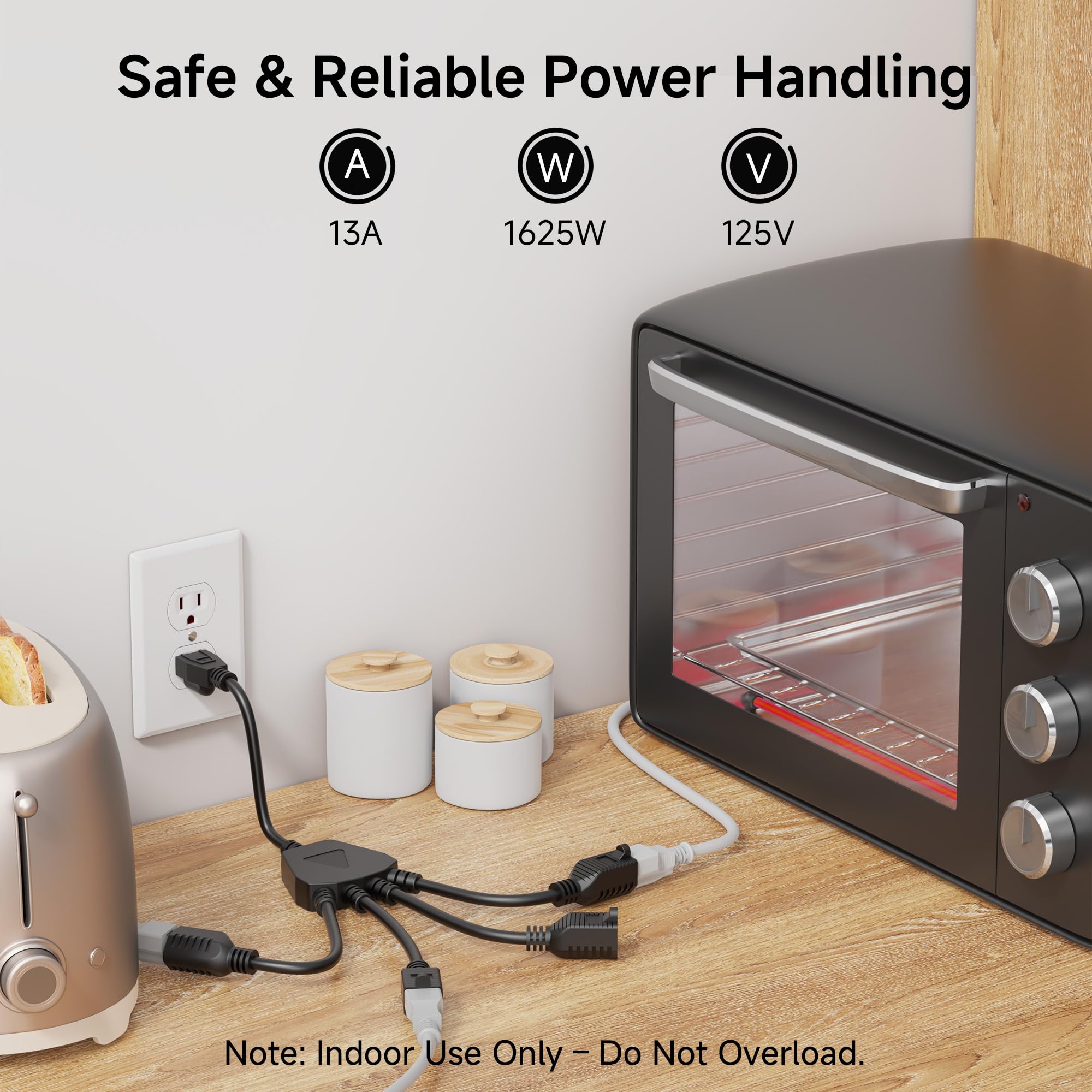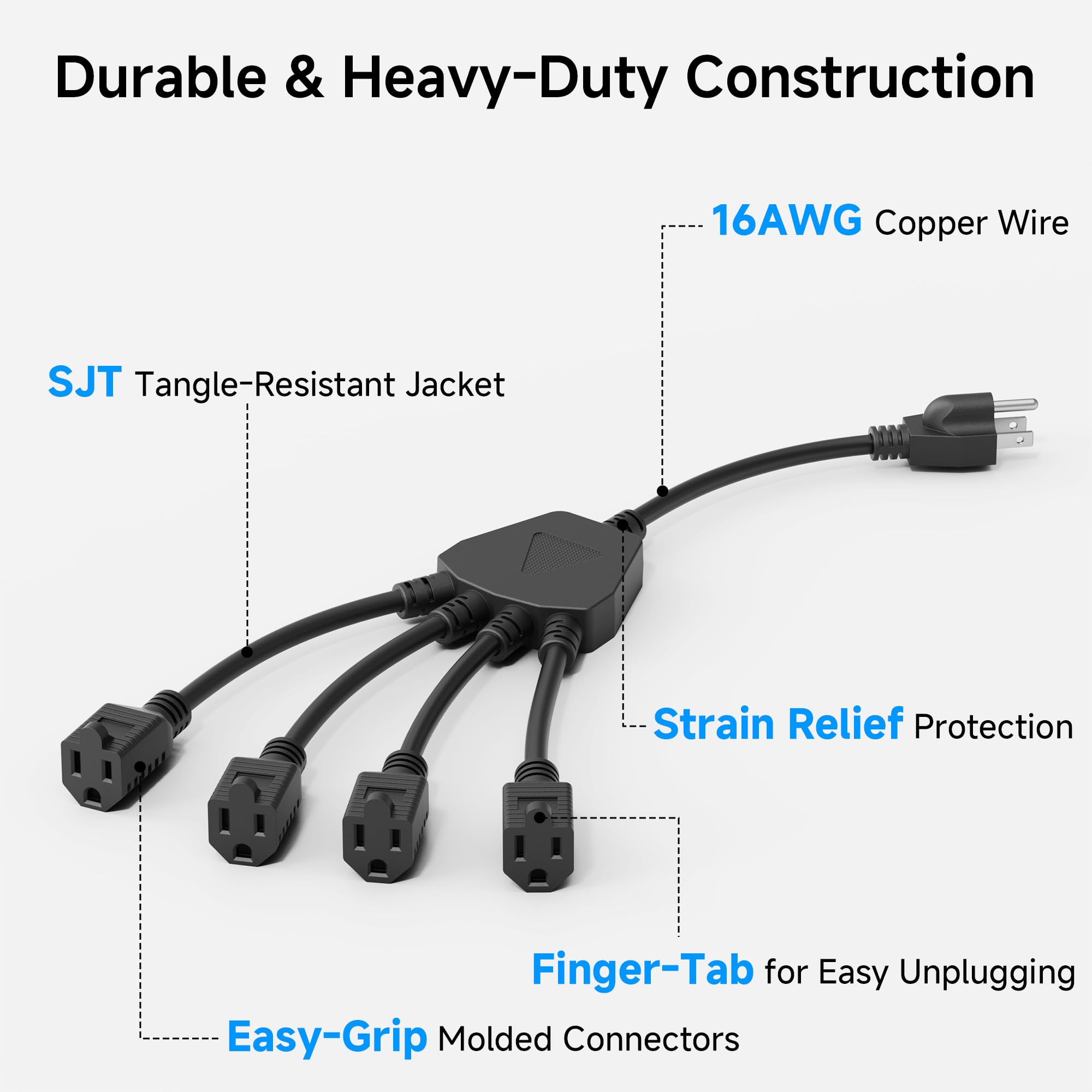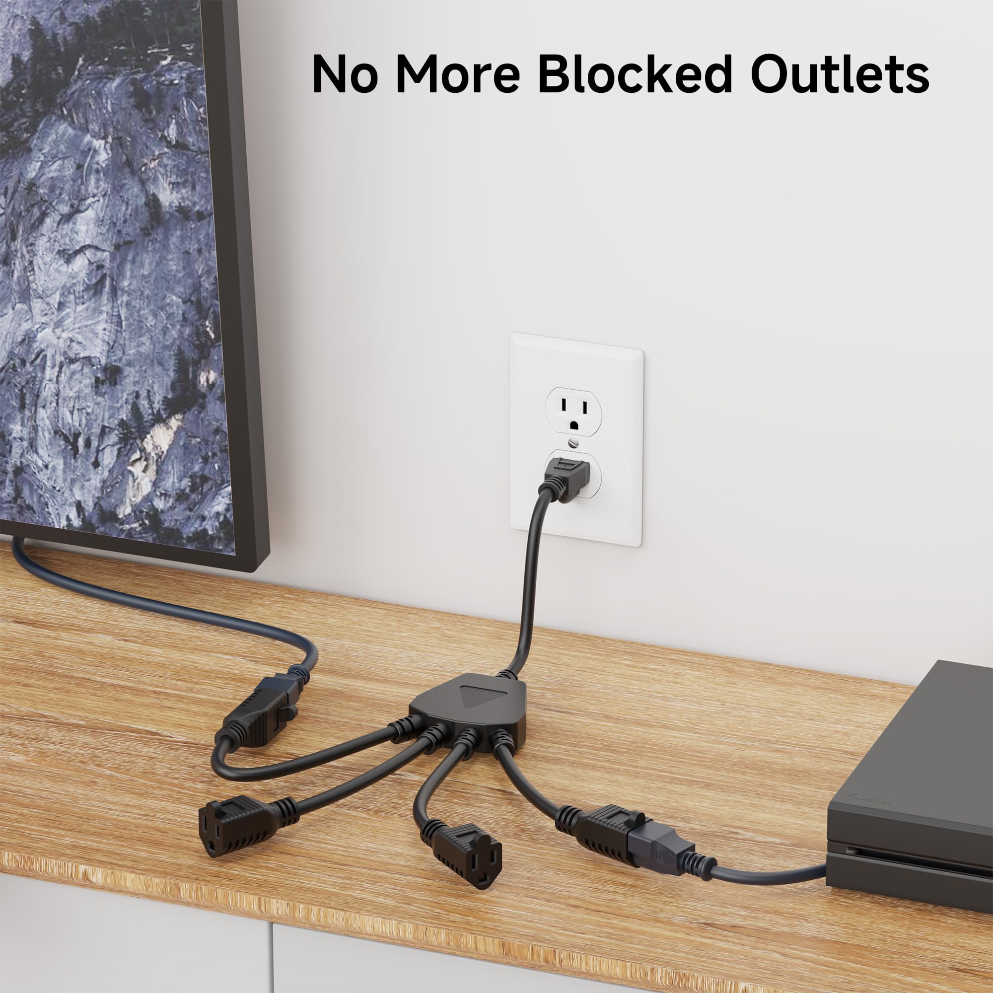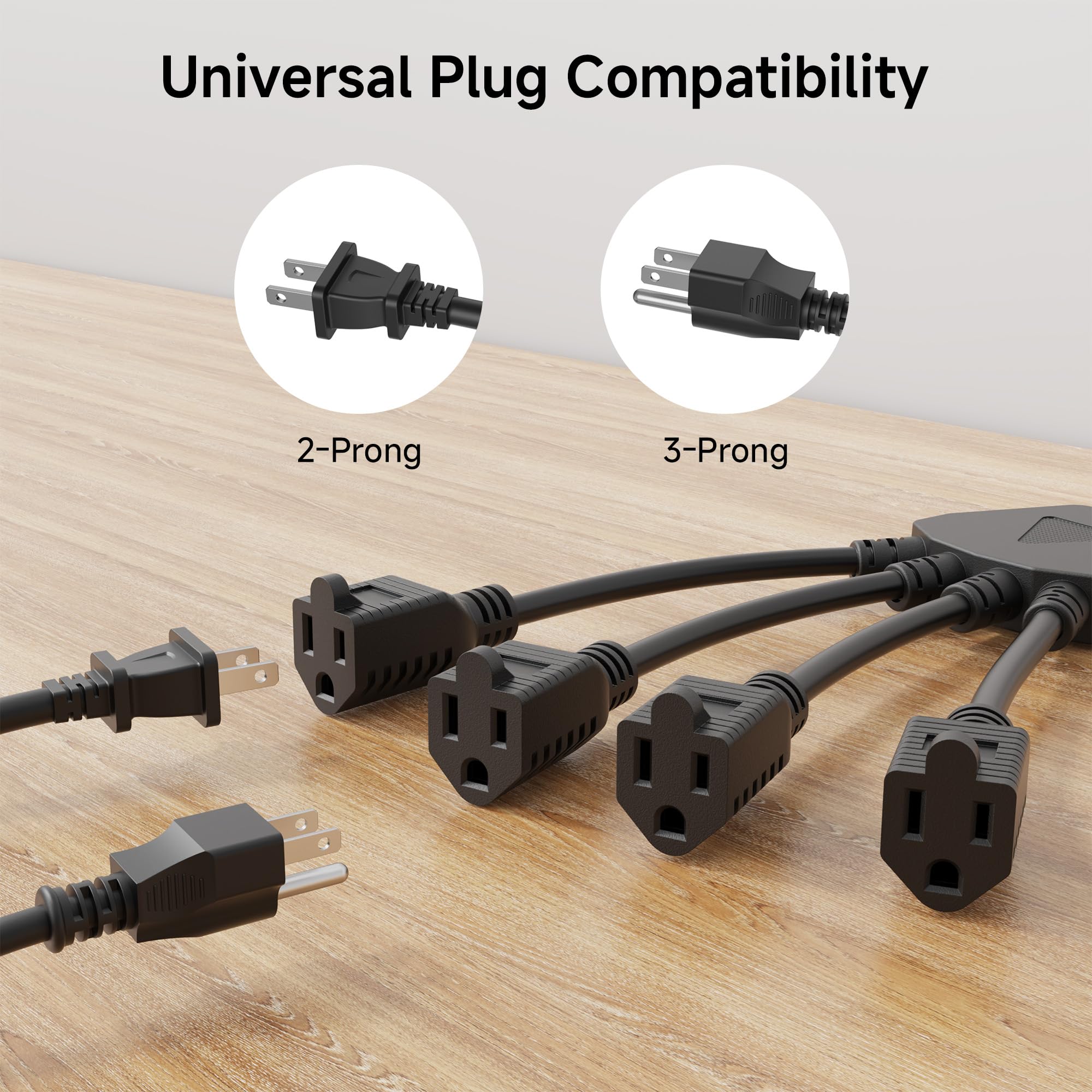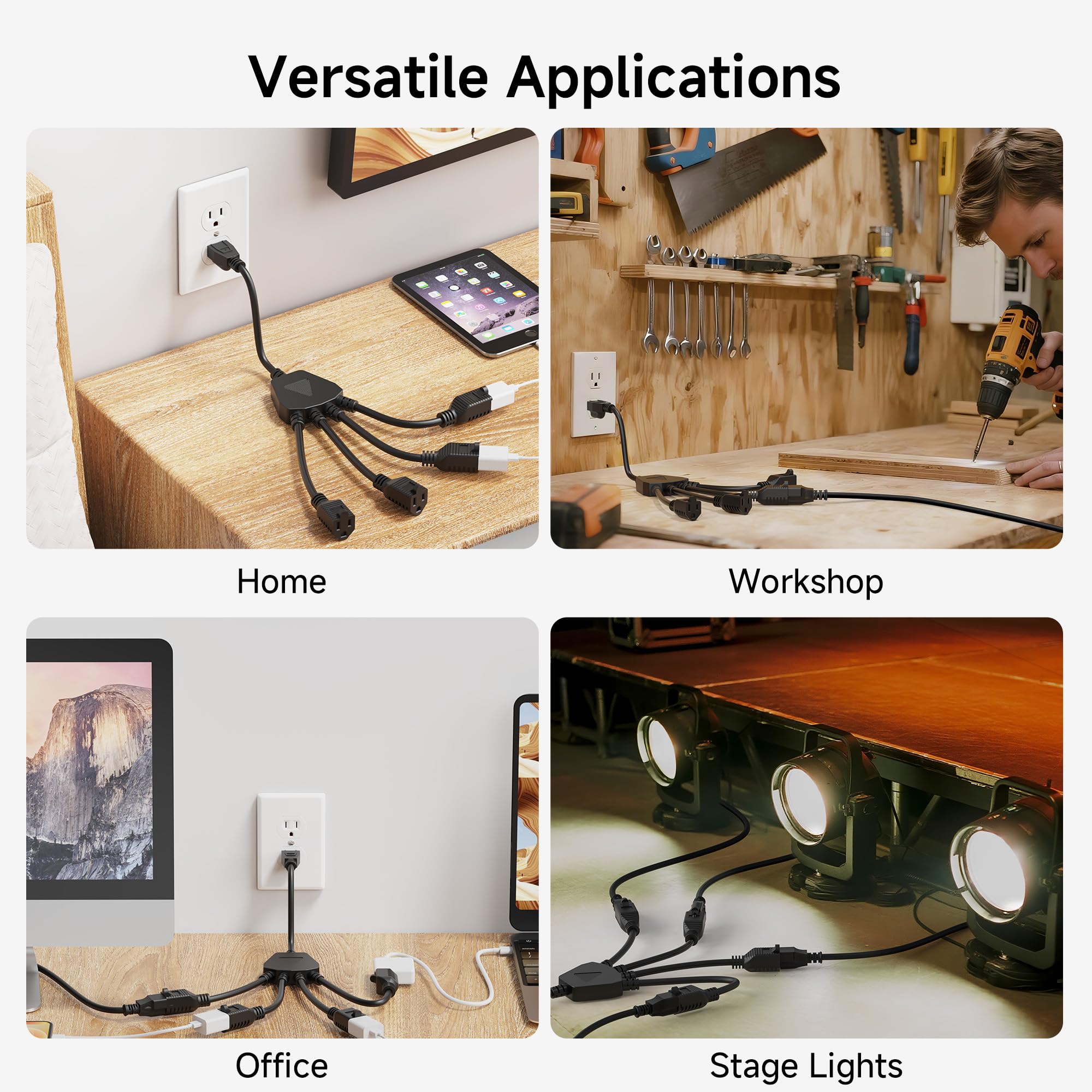 AC plug splitter cords create additional grounded outlets for connecting electrical devices when only 1 outlet is available; The 4 outlet extension cord splitter offers a reliable solution for holiday lights, a gaming get together, or a DJ party setup