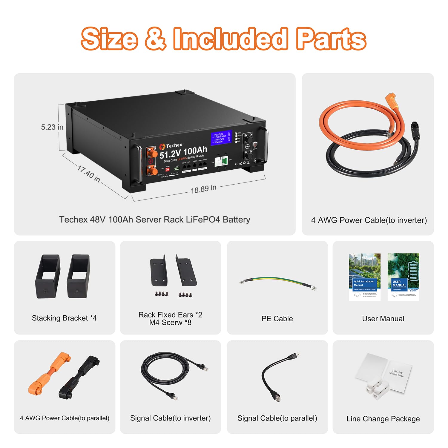 【3U Rack-Mount Design, Supports Up to 15P】Designed for scalable energy storage, this 3U 48V LFP rack-mount battery (17.40" x 18.89" x 5.23", 100 lb) features a durable metal case and solid handles for easy installation. It supports up to 15 units in parallel—ideal for home backup, workshop, or off-grid solar battery systems. Each unit comes with a parallel communication cable and a parallel power cable for fast, stable multi-unit integration