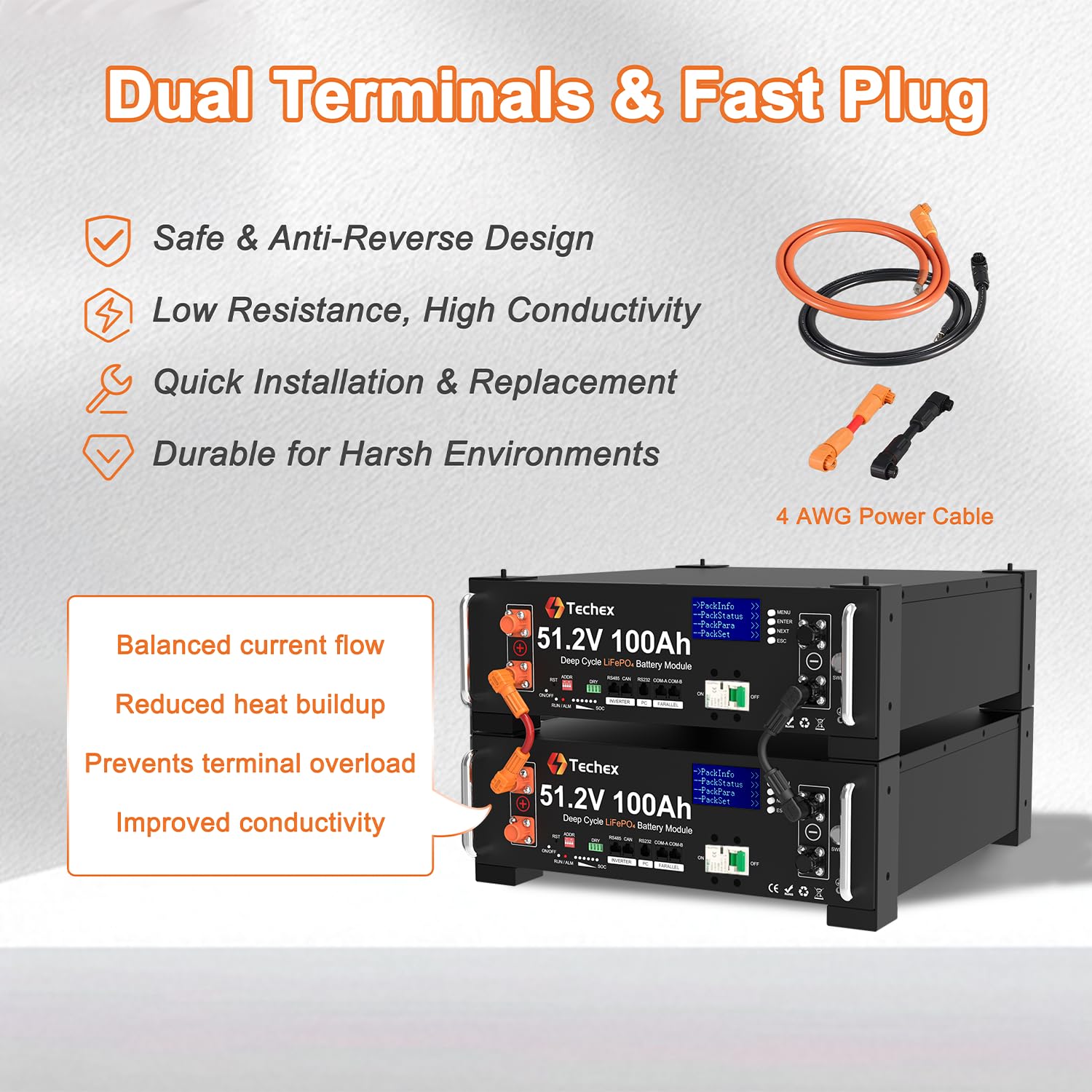 【Dual Switch, Dual Terminals & Fast Plug】The switch activates the BMS for a secure system startup, while the built-in 125A breaker controls terminal output and cuts off power during overcurrent—protecting your deep cycle 48V battery. Dual terminals ensure balanced current, lower heat, and prevent overload. Equipped with fast plug connectors for quick, tool-free installation—safe, anti-reverse, and highly conductive