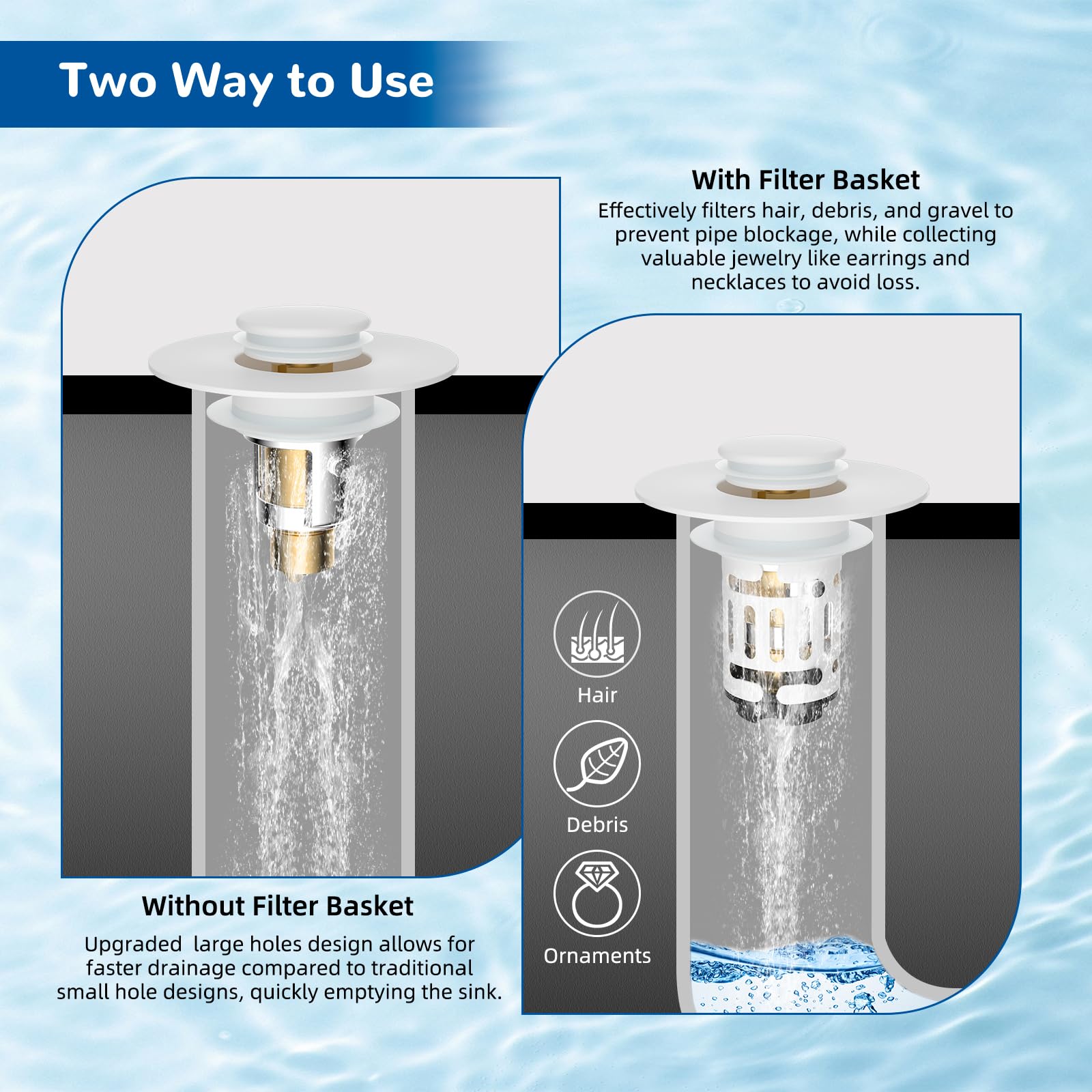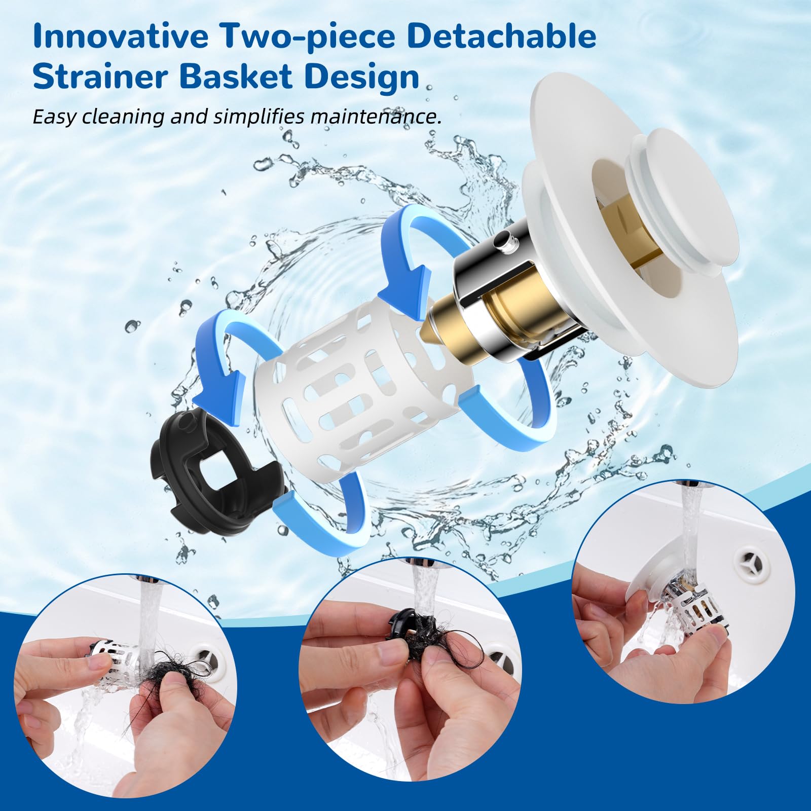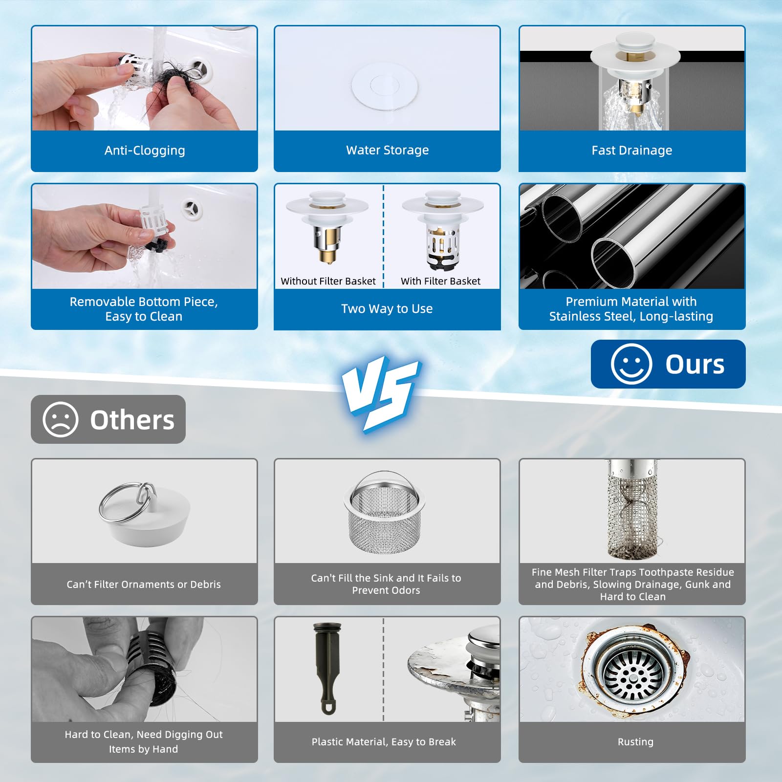 [Pop-up Design] Our pop-up sink drain strainer is made of high-quality stainless steel, plastic, and solid brass, providing exceptional rebound strength, corrosion resistance, and long-lasting durability. It features a long-lasting and sensitive pop-up brass bullet core mechanism, allowing you to easily switch between the water storage and fast drainage modes with just a gentle press