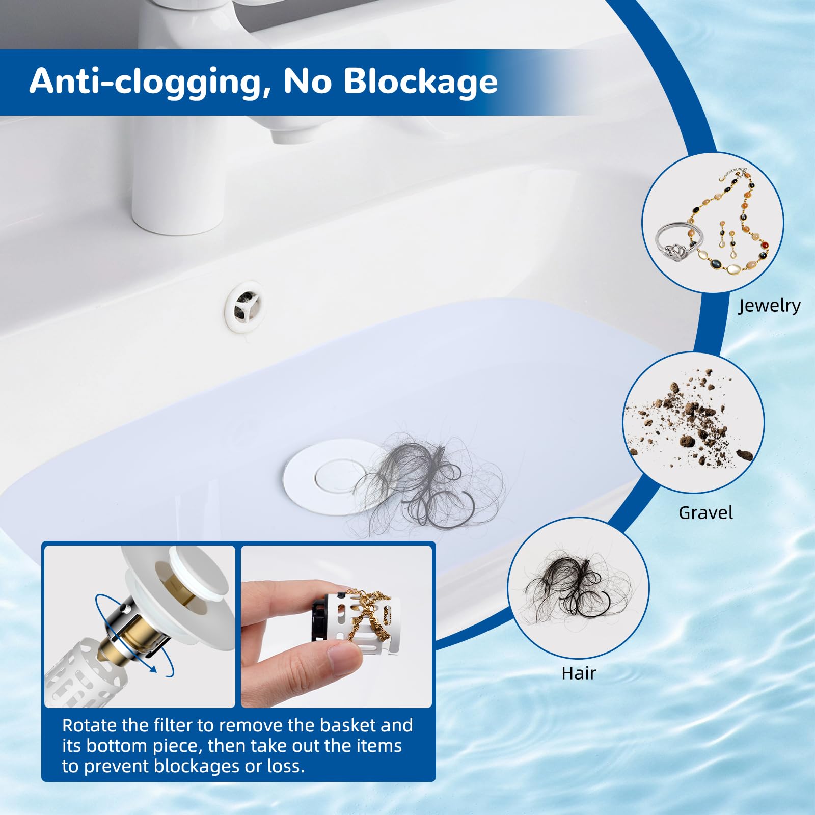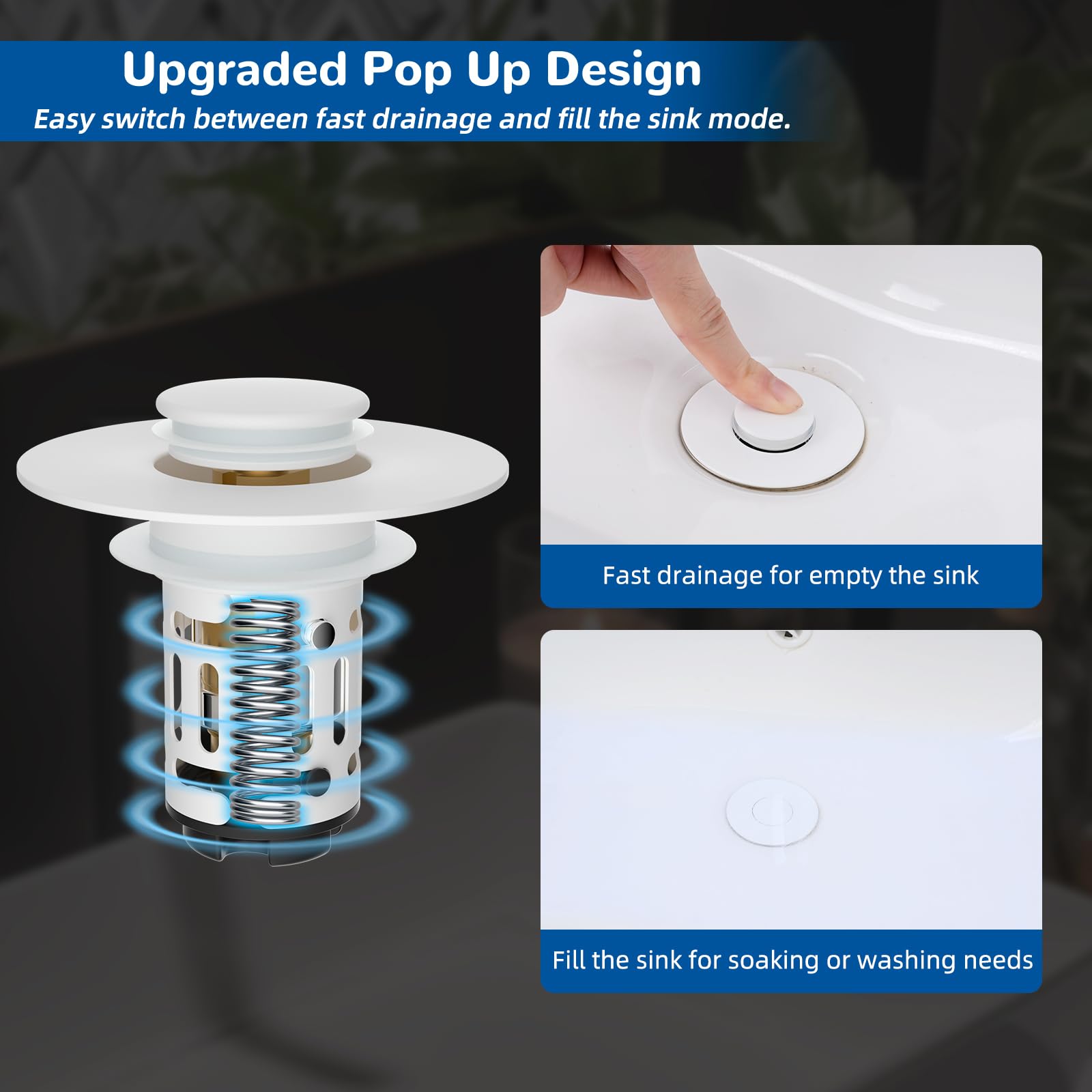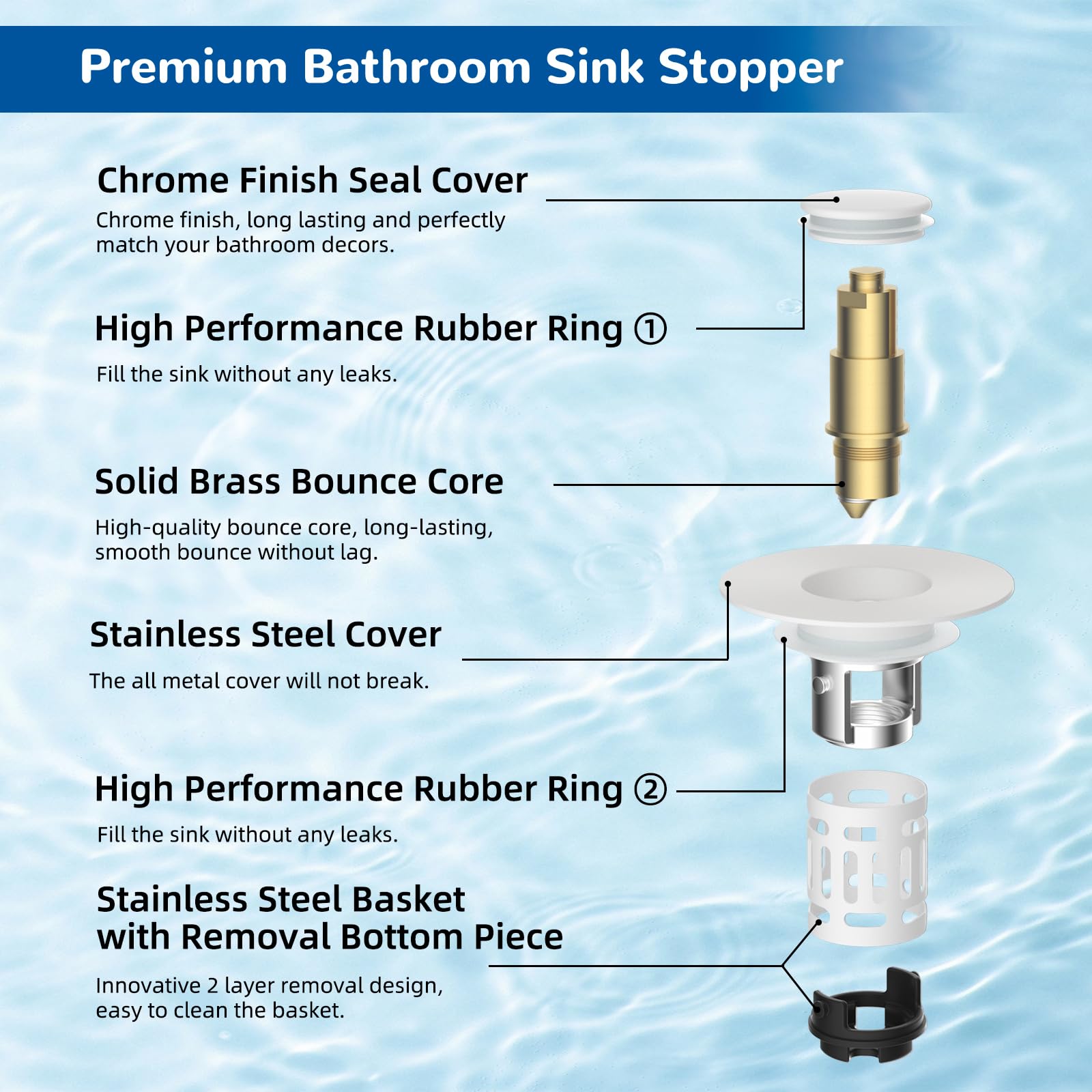 [Pop-up Design] Our pop-up sink drain strainer is made of high-quality stainless steel, plastic, and solid brass, providing exceptional rebound strength, corrosion resistance, and long-lasting durability. It features a long-lasting and sensitive pop-up brass bullet core mechanism, allowing you to easily switch between the water storage and fast drainage modes with just a gentle press