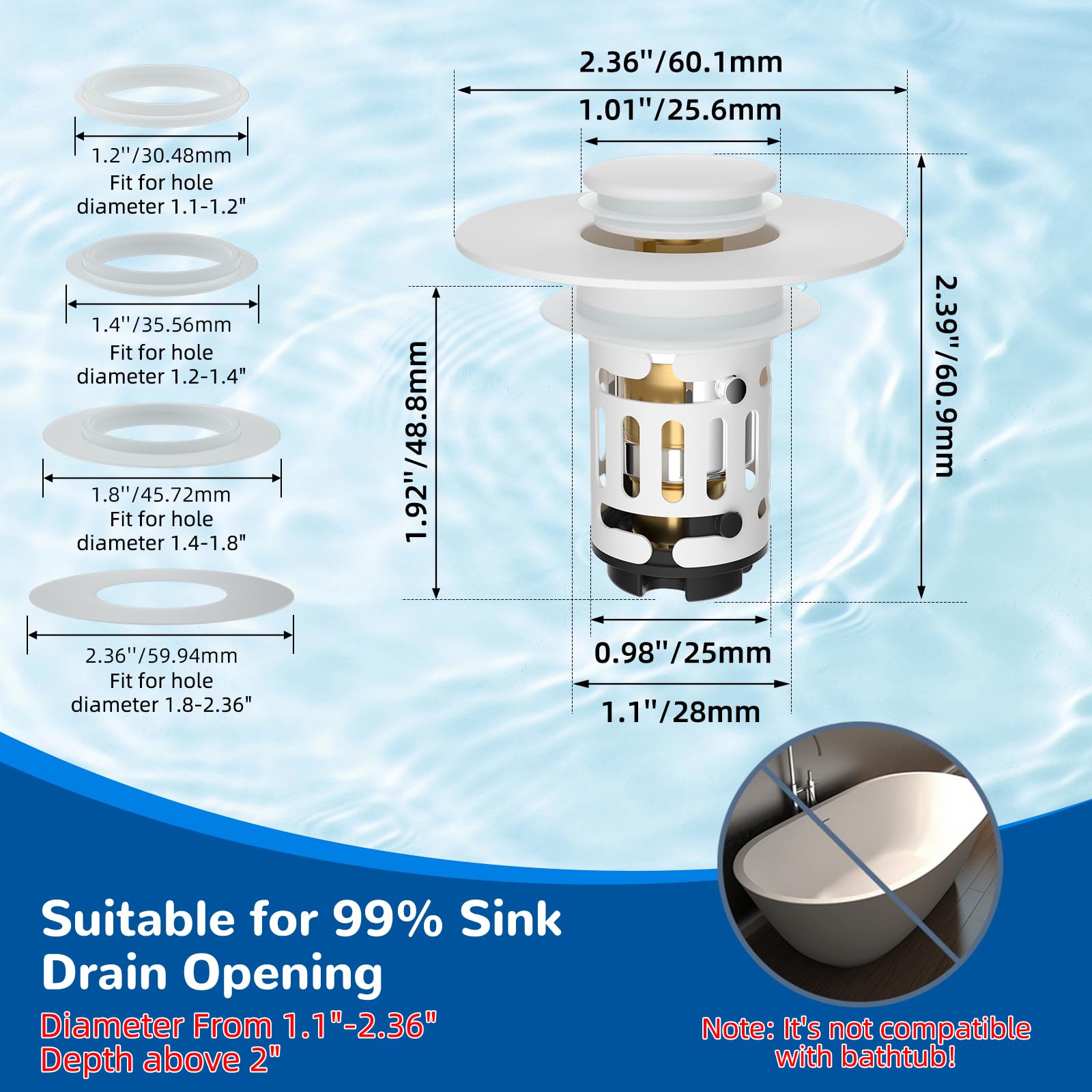 [Versatile Compatibility & Easy Installation] This bathroom sink drain stopper includes four O-rings, which are designed to fit 99% of standard US sink drains, including bathroom sinks and washbasins with drain holes measuring between 1.1" and 2.36". The installation is quick and hassle-free, without the need for expensive tools or plumber fees. Simply remove your old stopper and insert the new one into the drain hole, installation only takes a few seconds. Note: To ensure compatibility, please remember to measure your bathroom sink drain opening diameter before purchasing to confirm a proper fit