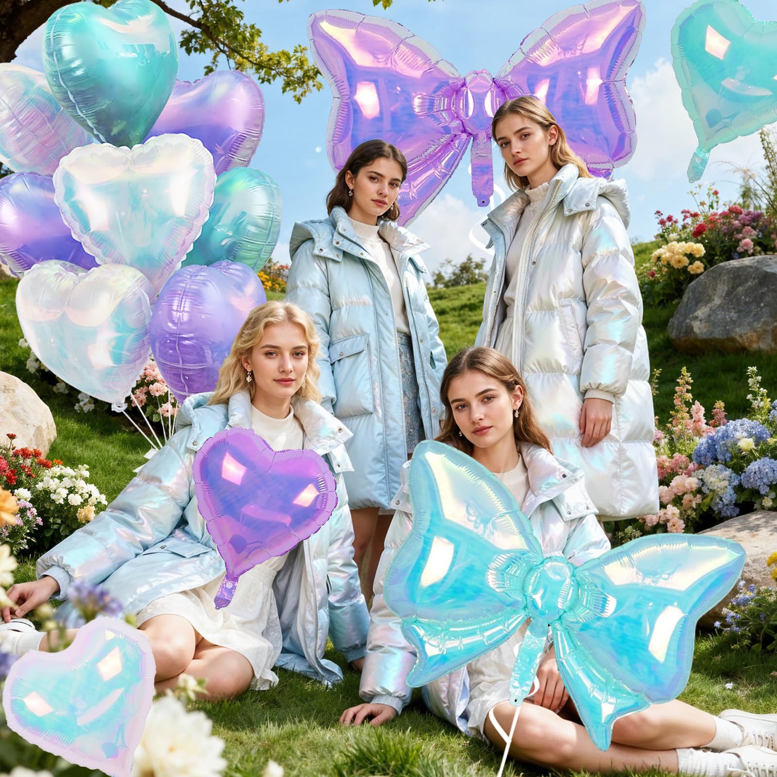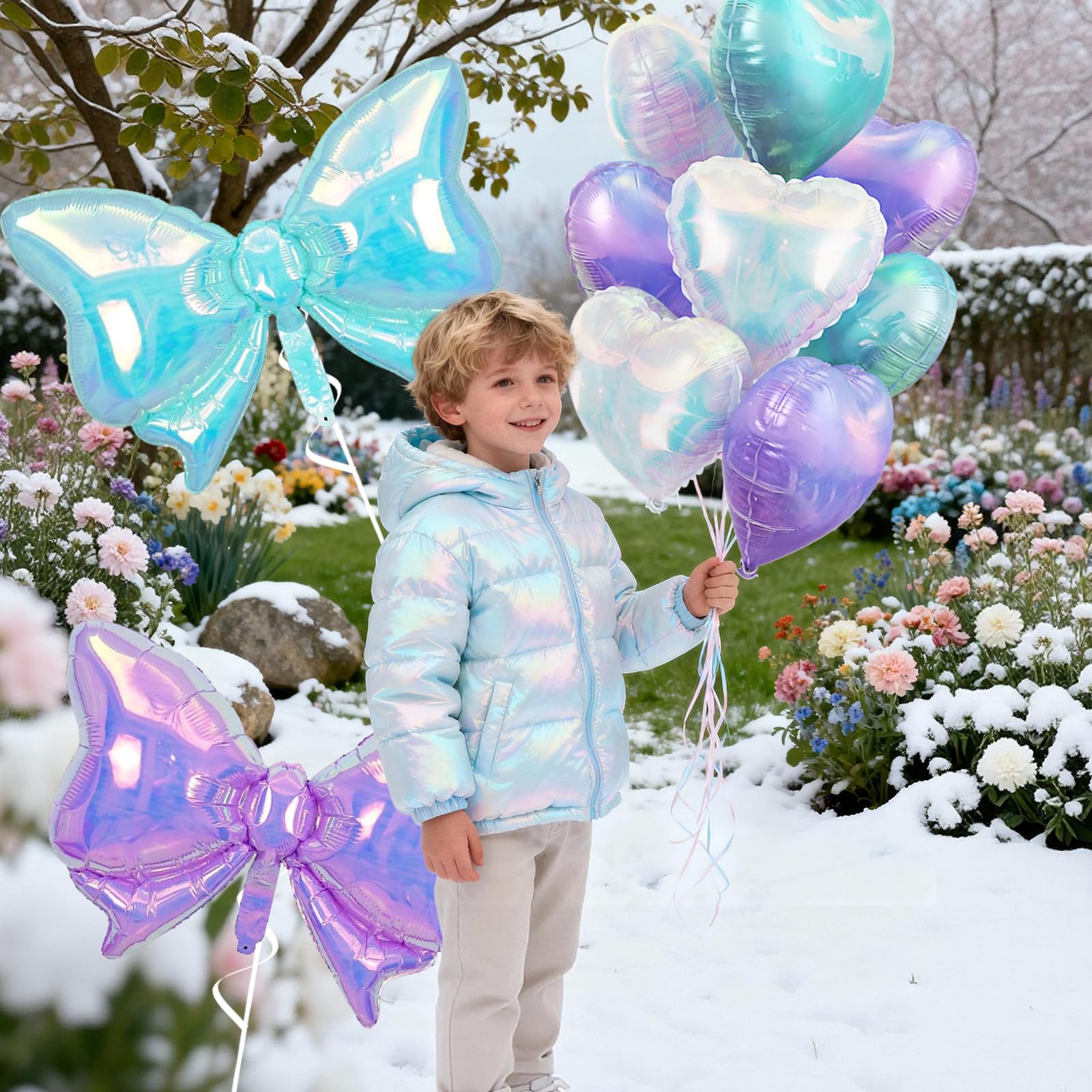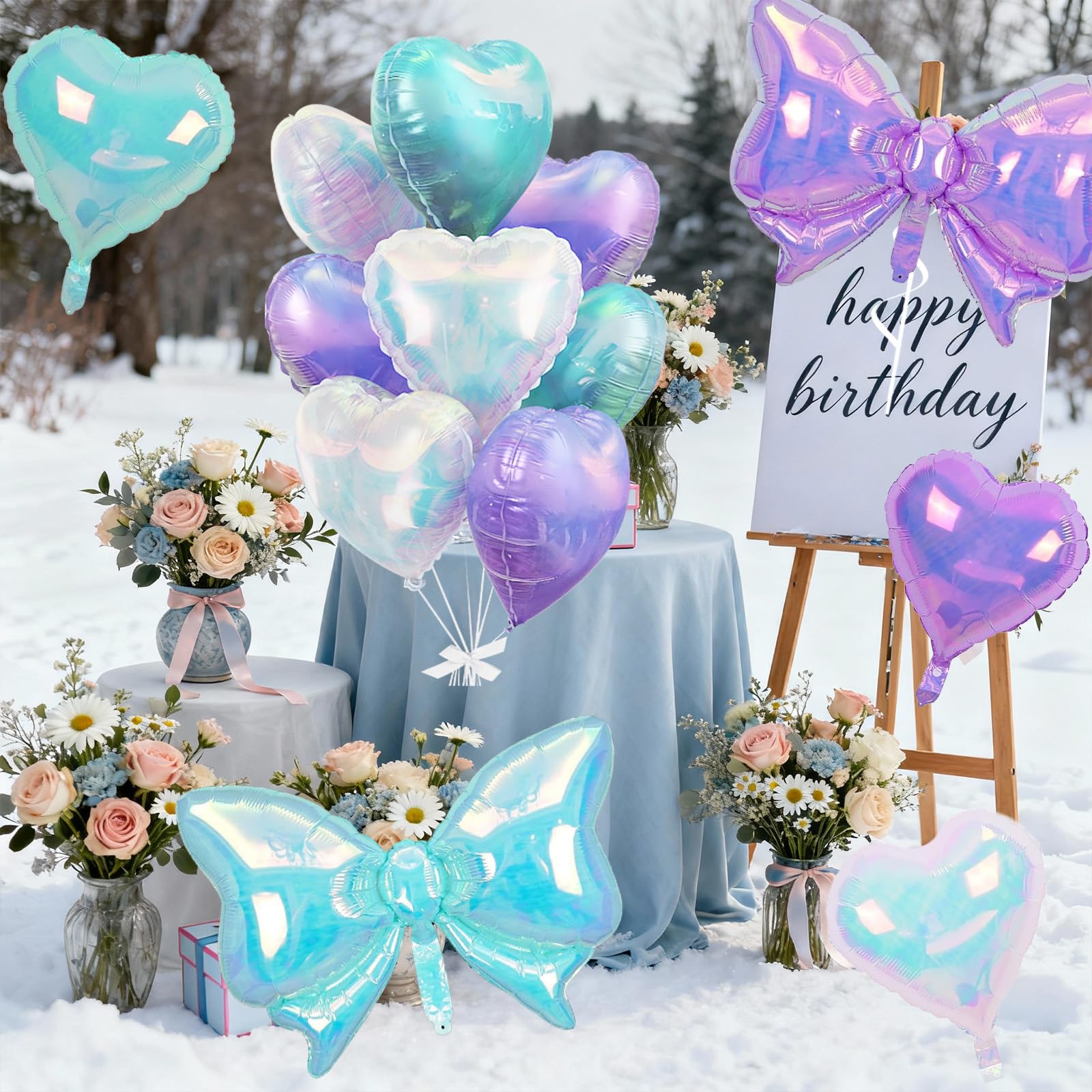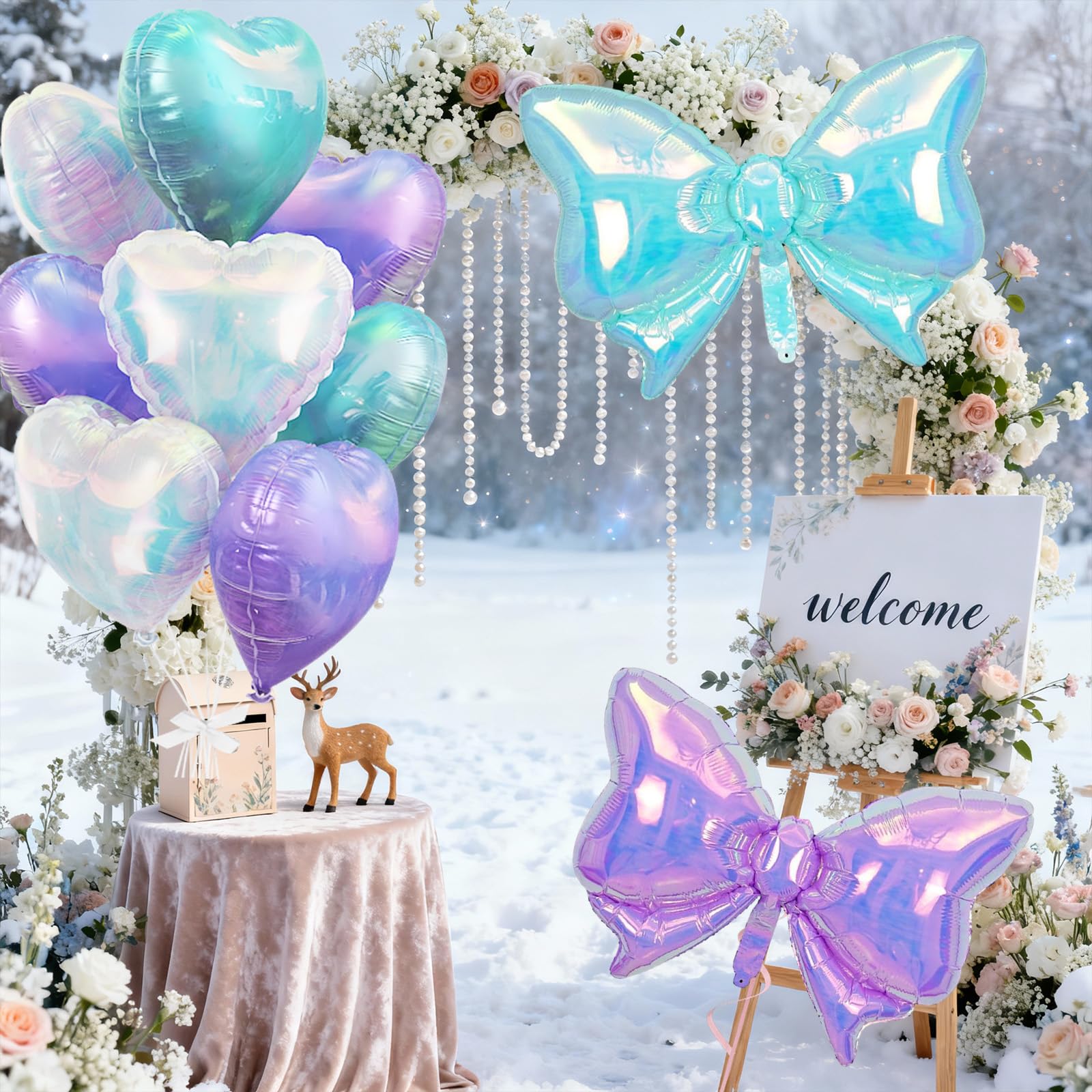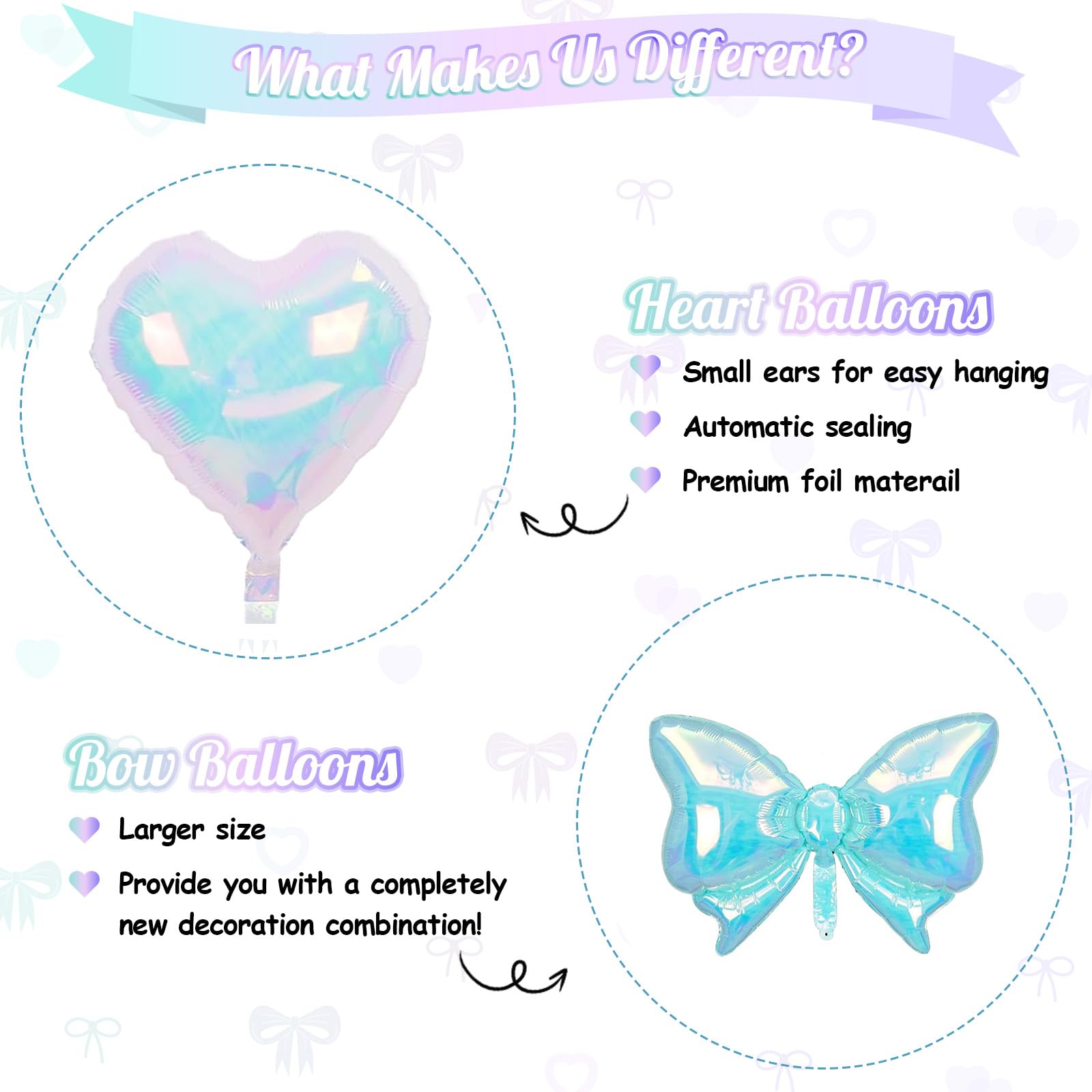 Romantic Heart & Bow Balloon Set: This set features shiny heart balloons and oversized bow balloons, perfect for creating a lovely decoration style. Use heart balloons for weddings or anniversaries, bow balloons for birthday parties, or mix heart balloons with bow balloons for photo backdrops. The combination of iridescent blue and purple heart balloons and bow balloons adds a stylish and charming touch to any celebration.