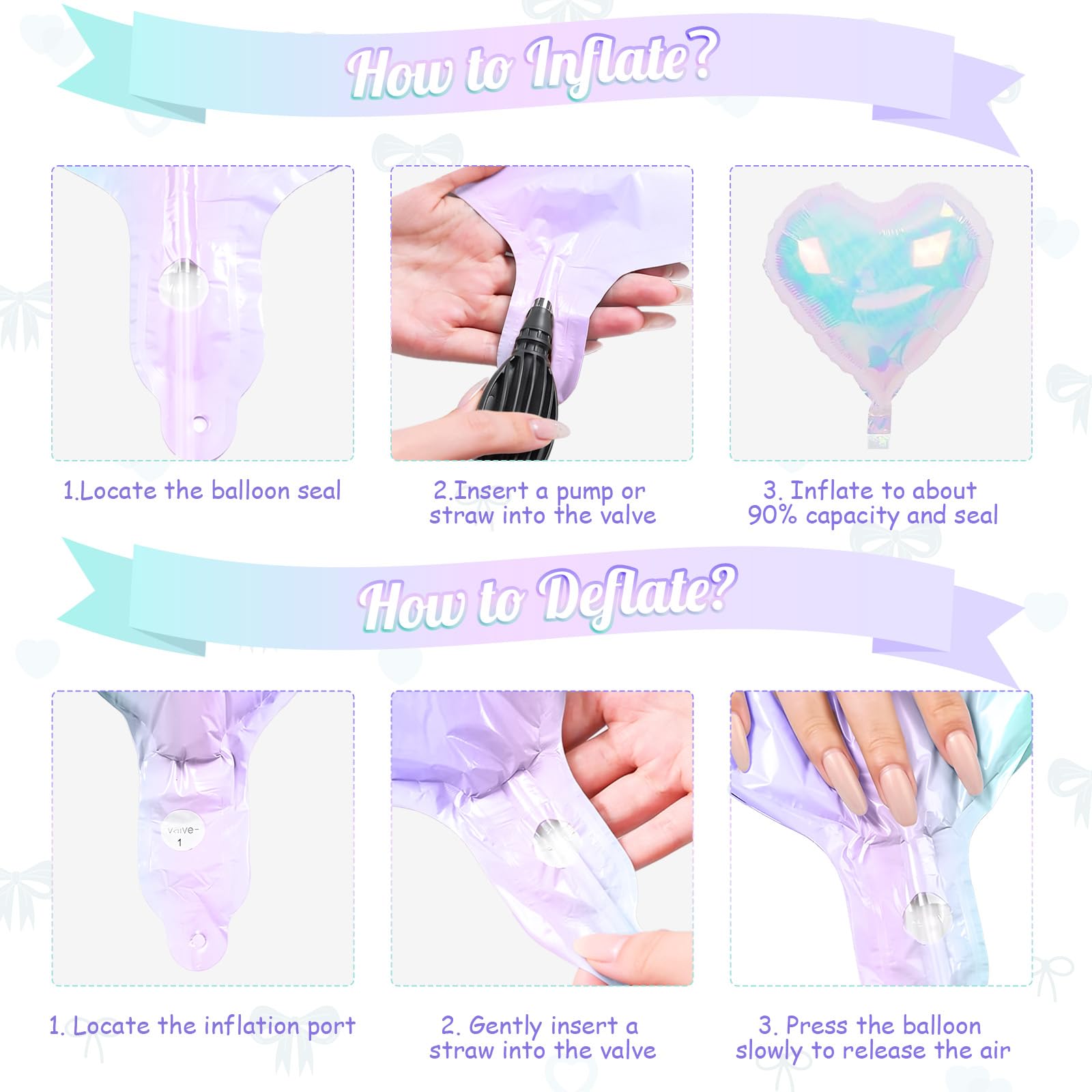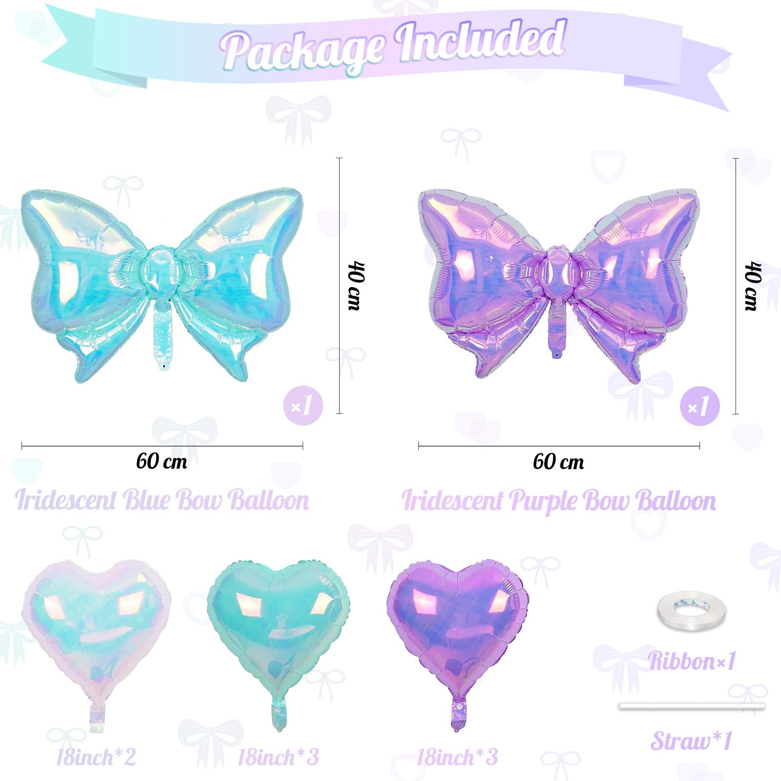 Package Includes: This colorful iridescent blue purple heart and bow balloon set comes with 3 × 18 inch iridescent blue heart balloons, 3 × 18 inchiridescent purple heart balloons, 2 × 18 inch iridescent heart balloons, 1 × iridescent blue bow balloon, 1 × iridescent purple bow balloon (38.6 × 29.5 inch), 1 × straw, and 1 × pink ribbon—this complete set makes your celebration distinctive and creates a stylish and festive atmosphere.