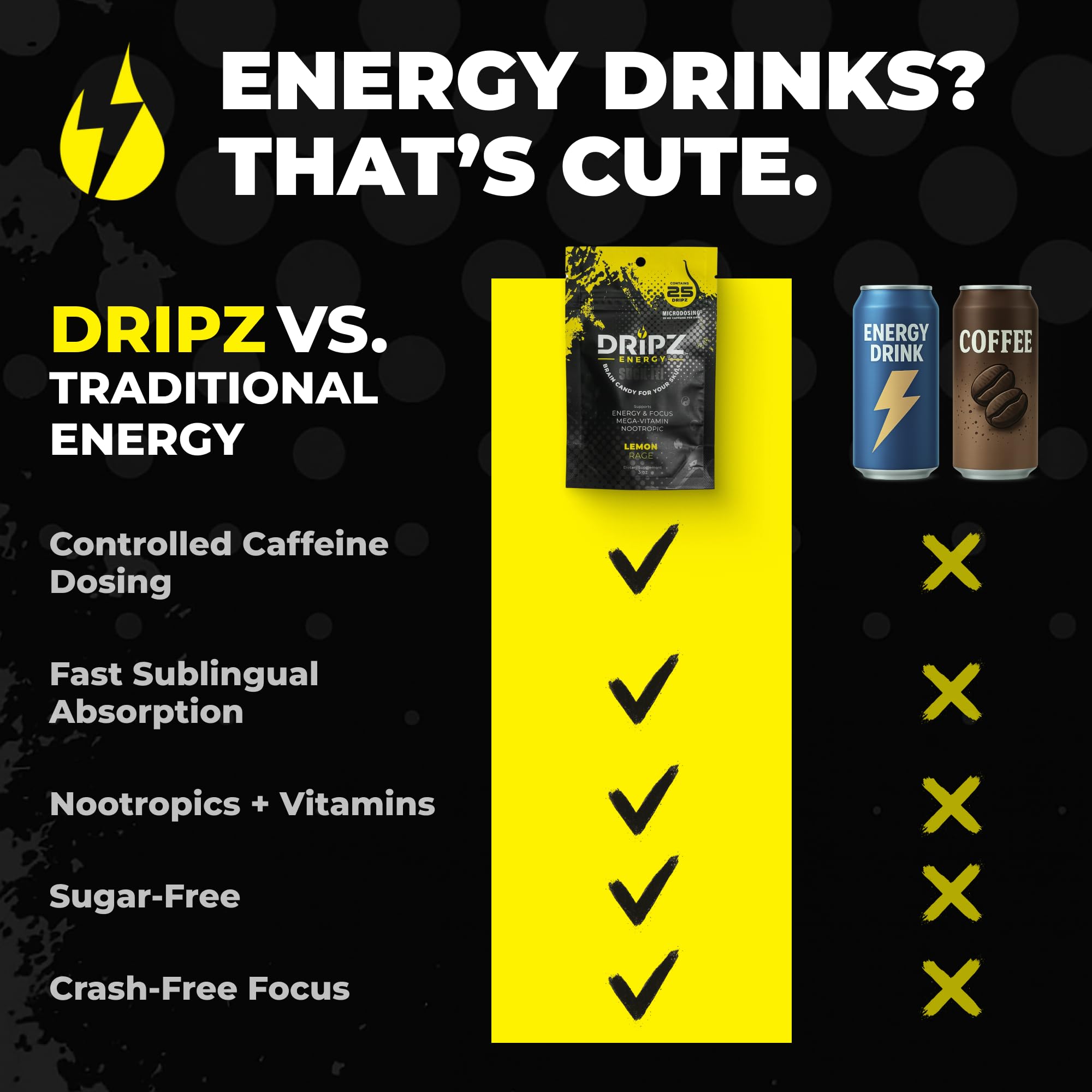 Get your Dripz Lemon Rage on with these caffeine tablets that provide mega-vitamin energy and focus. Say goodbye to brain fog and hello to productivity with this nootropic supplement!
