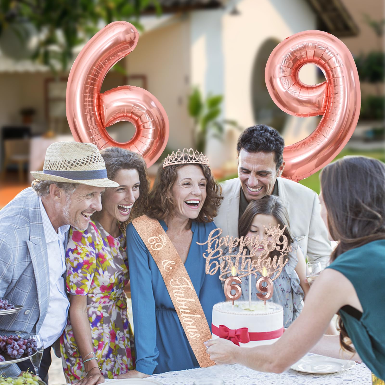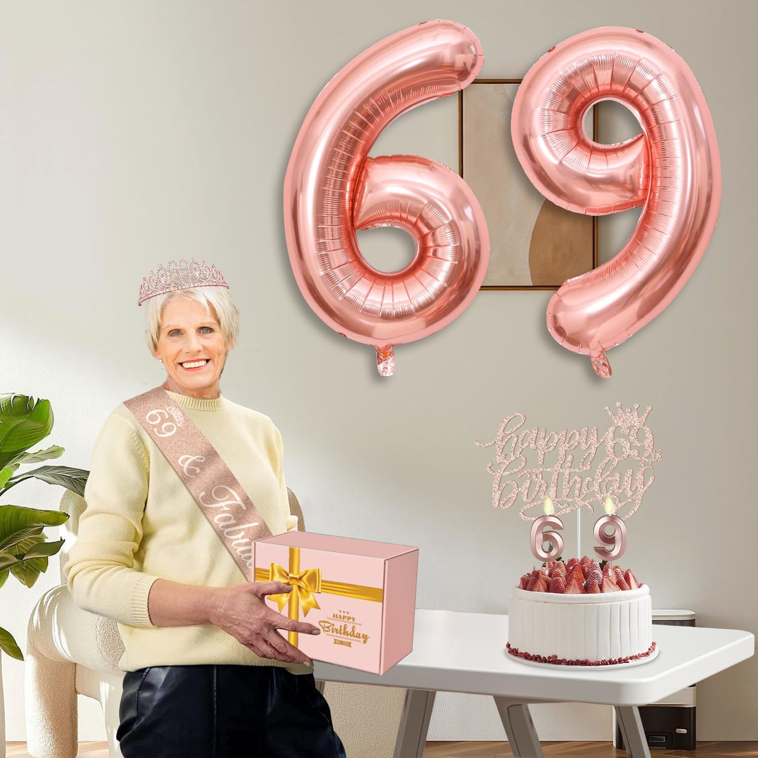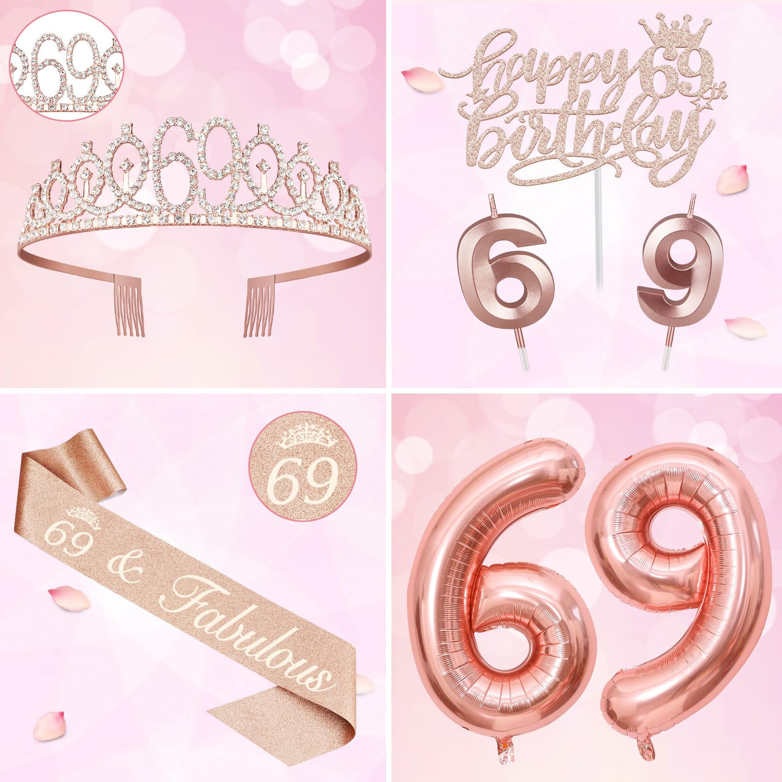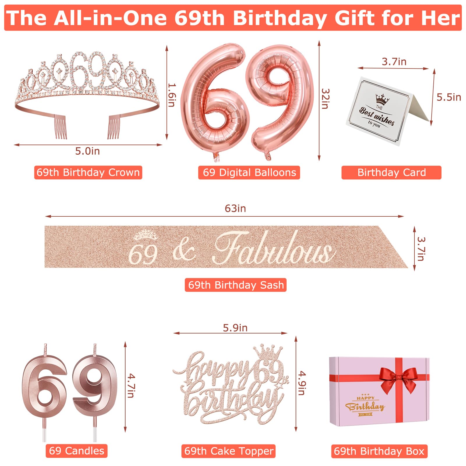 [69 Birthday Decorations]: Package coming with 69th Birthday Tiara/Crown x 1pc, 69th Birthday Sash x 1pc, Happy 69th Birthday Cake Topper x 1pc, Number 69 Candles Rose Gold x 1set, Numeral 69 Balloons Rose Gold x 1 set, and a Classical Birthday Card x 1pc. This great valuable Rose Gold 69th Birthday Gifts for Women has been packed in a beautiful Gift Box for presentation