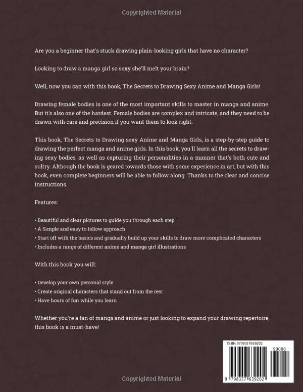 Are you a beginner that's stuck drawing plain-looking girls that have no character? Looking to draw a manga girl so sexy she'll melt your brain? Well, now you can with this book, The Secrets to Drawing Sexy Anime and Manga Girls! Drawing female bodies is one of the most important skills to master in manga and anime. But it's also one of the hardest. Female bodies are complex and intricate, and they need to be drawn with care and precision if you want them to look right. This book, The Secrets to Drawing sexy Anime and Manga Girls, is a step-by-step guide to drawing the perfect manga and anime girls. In this book, you'll learn all the secrets to drawing sexy bodies, as well as capturing their personalities in a manner that's both cute and sultry. Although the book is geared towards those with some experience in art, but with this book, even complete beginners will be able to follow along. Thanks to the clear and concise instructions. Features: Beautiful and clear pictures to guide you through each step A Simple and easy to follow approach Start off with the basics and gradually build up your skills to draw more complicated characters Includes a range of different anime and manga girl illustrations With this book you will: Develop your own personal style Create original characters that stand out from the rest Have hours of fun while you learn Whether you're a fan of manga and anime or just looking to expand your drawing repertoire, this book is a must-have! So what are you waiting for? Start your journey to becoming a master of sexy manga and anime art today!