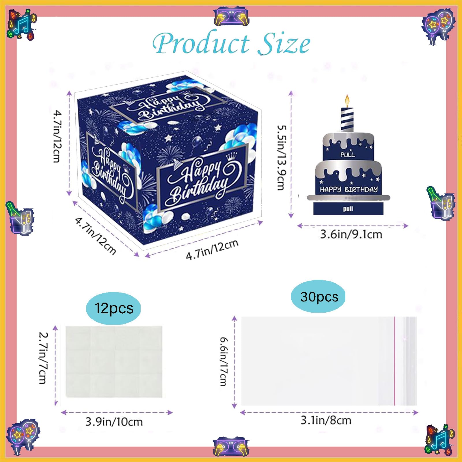 【Size Design】The Happy Birthday Money Box is a surprise design with 4.3"x 5.3" x 5.3"and the "Happy Brithday" theme card are made of sturdy cardboard with color printing. The transparent bag size is 3.15" x 7.89" for you to save the cash with 2.61" x 6.14" size.