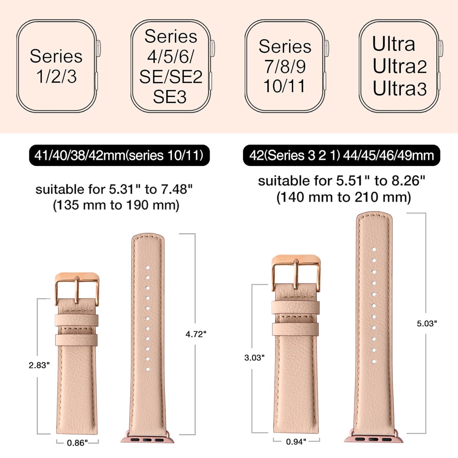 Perfect Compatibility: Our band is designed to fit Apple Watch models 42mm(Series 3 2 1) 44mm 45mm 46mm 49mm and is compatible with Ultra 3, Ultra 2, Ultra, SE3,SE2, SE, Series 11 10 9 8 7 6 5 4 3 2 1. The wrist strap is suitable for wrists from 5.51" to 8.26" (140 mm to 210 mm), ensuring a perfect fit for both small and large wrists